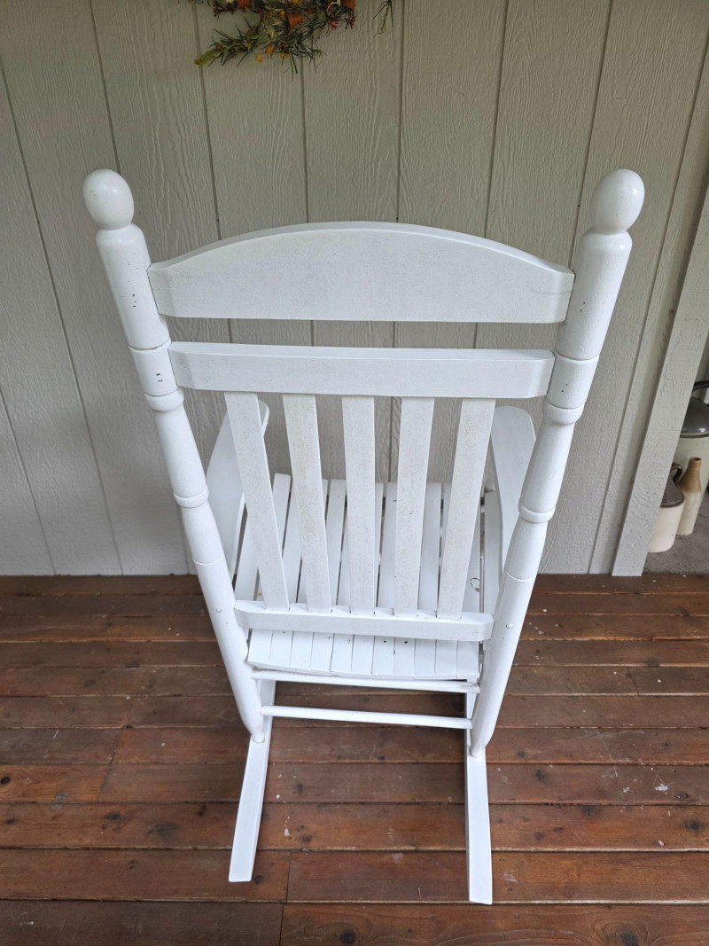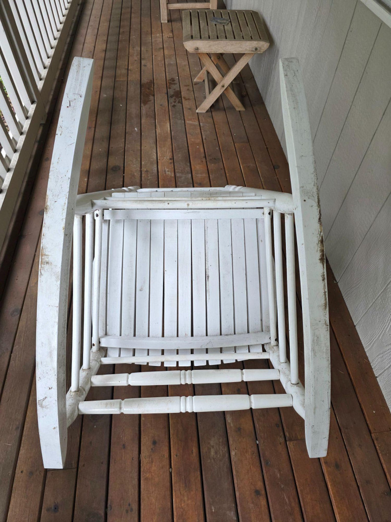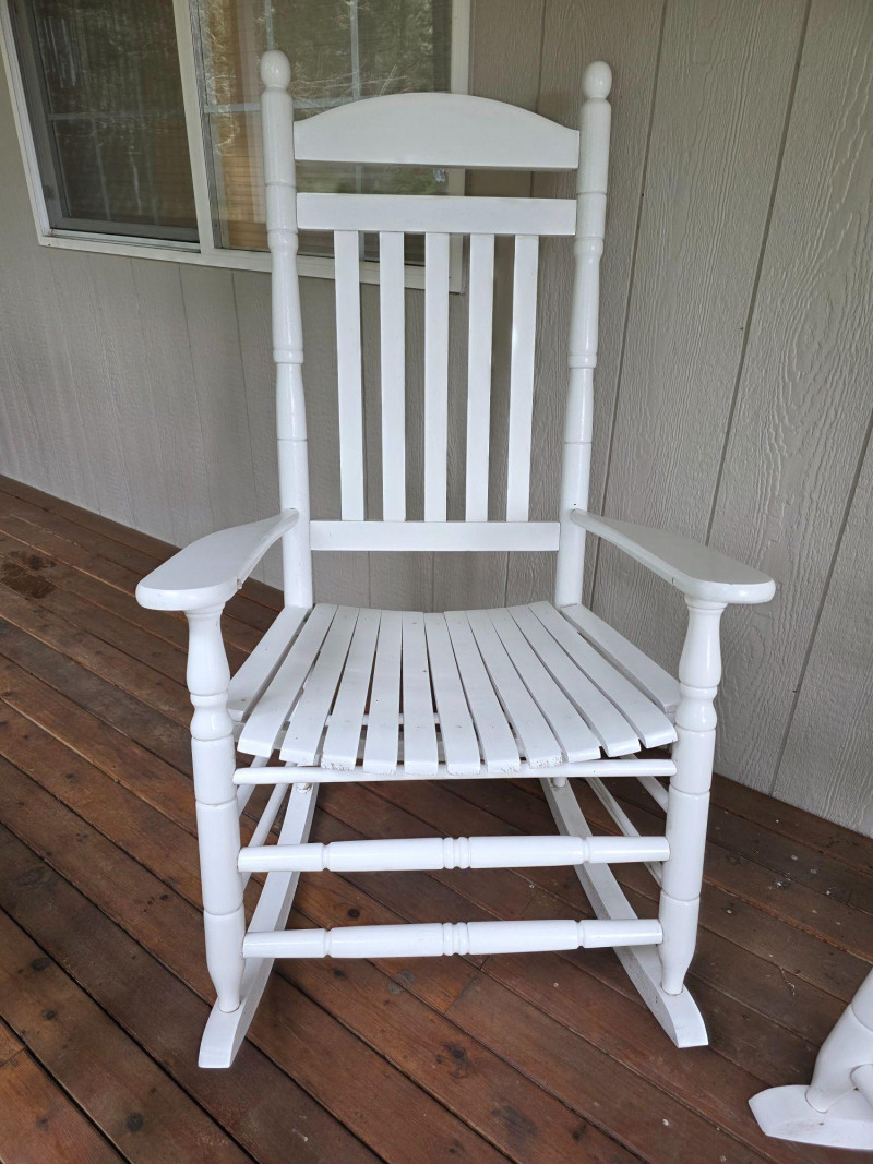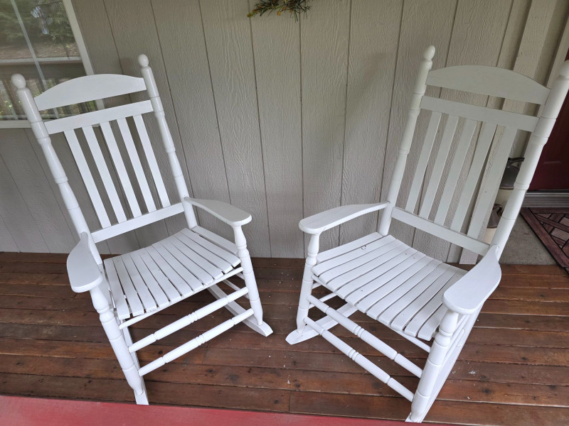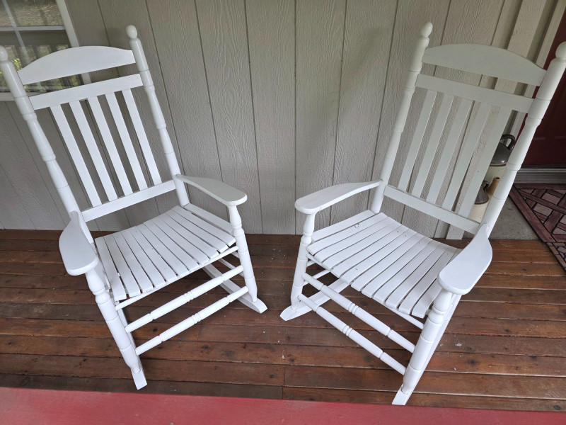 Pair Of Classic White Wood Outdoor Rocking Chairs Classic White Wood Outdoor Rocking Chairs, often called a porch rocker, designed for use on patios, decks, or balconies Featuring a sturdy slatted backrest and wide traditional slat seat with white wood frame Protective white paint or lacquer suitable for covered outdoor use We wiped them down, but could use a little cleanup Nice & solid wood.rockers, some wear on the seat from normal use (see pics) Both Tested - Both Work! 48"T x 26.5"W x 33.5"D