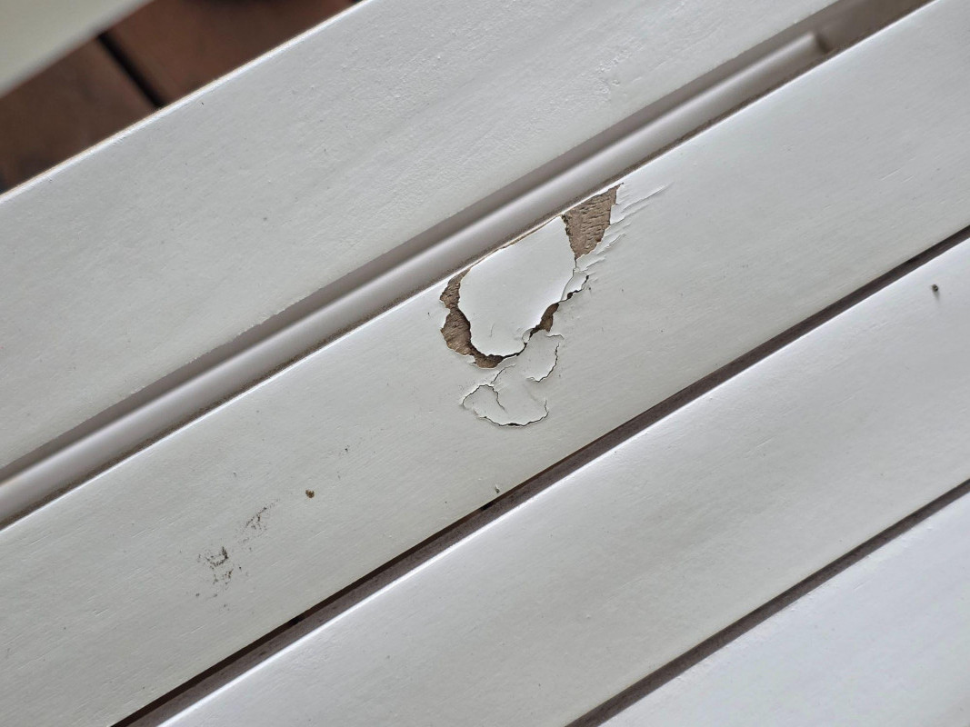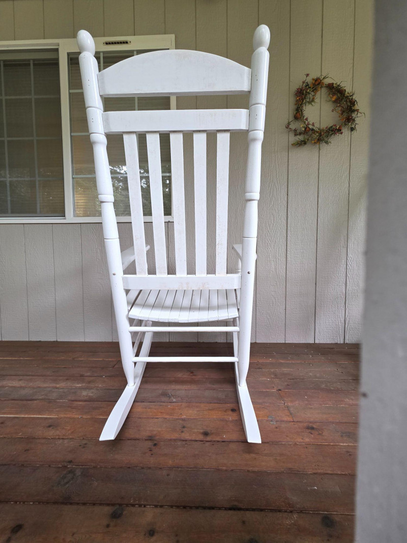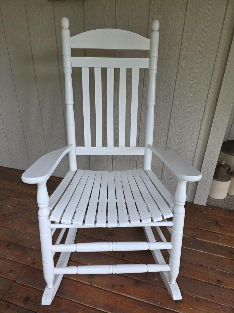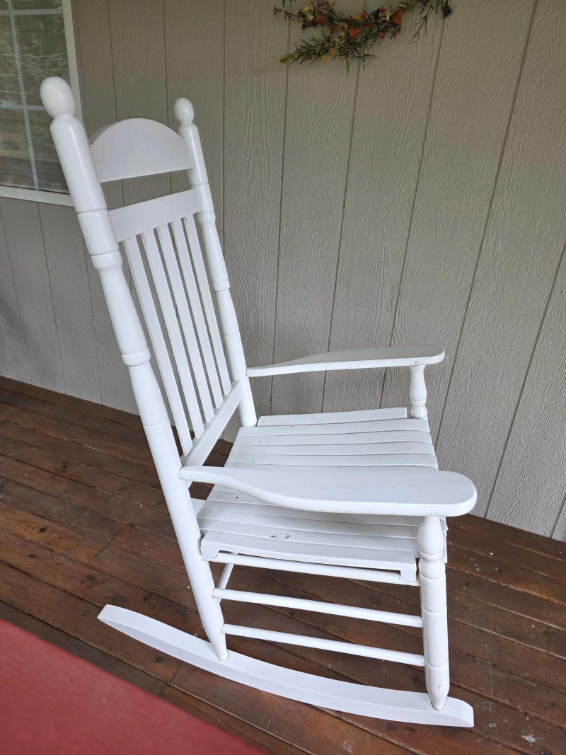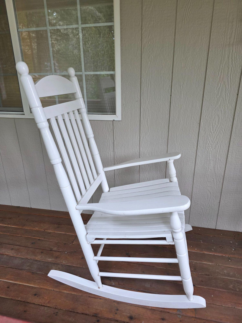 Pair Of Classic White Wood Outdoor Rocking Chairs Classic White Wood Outdoor Rocking Chairs, often called a porch rocker, designed for use on patios, decks, or balconies Featuring a sturdy slatted backrest and wide traditional slat seat with white wood frame Protective white paint or lacquer suitable for covered outdoor use We wiped them down, but could use a little cleanup Nice & solid wood.rockers, some wear on the seat from normal use (see pics) Both Tested - Both Work! 48"T x 26.5"W x 33.5"D