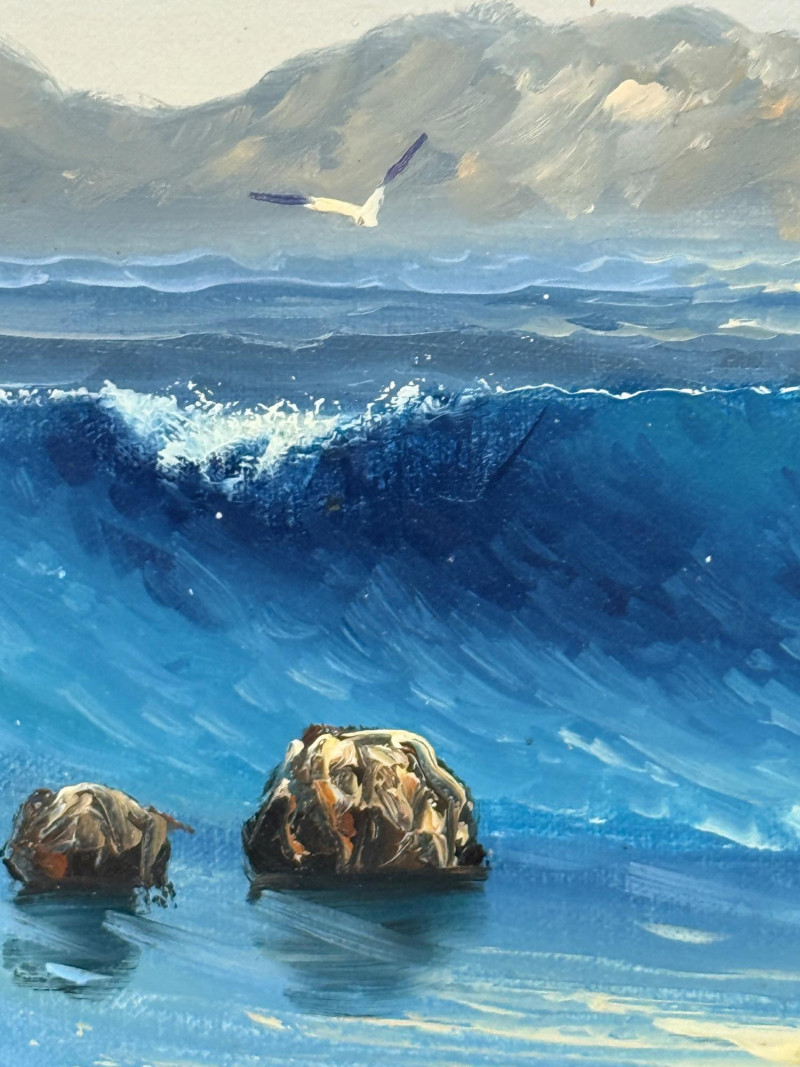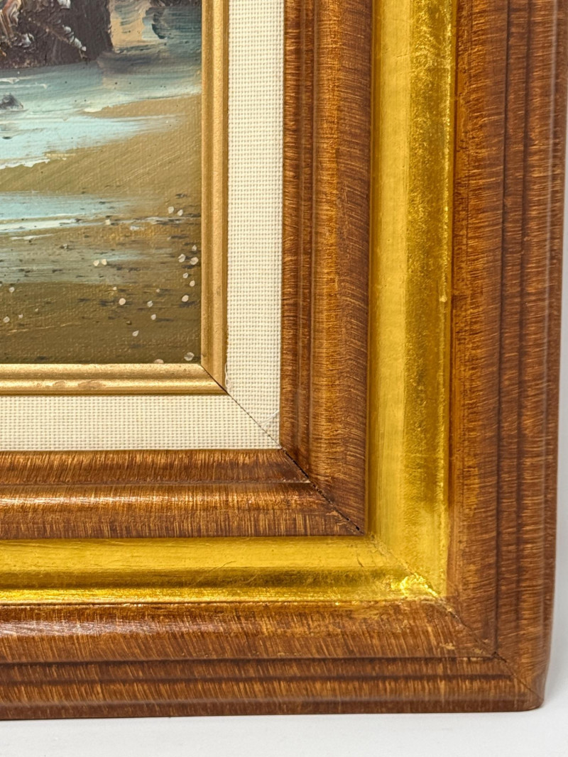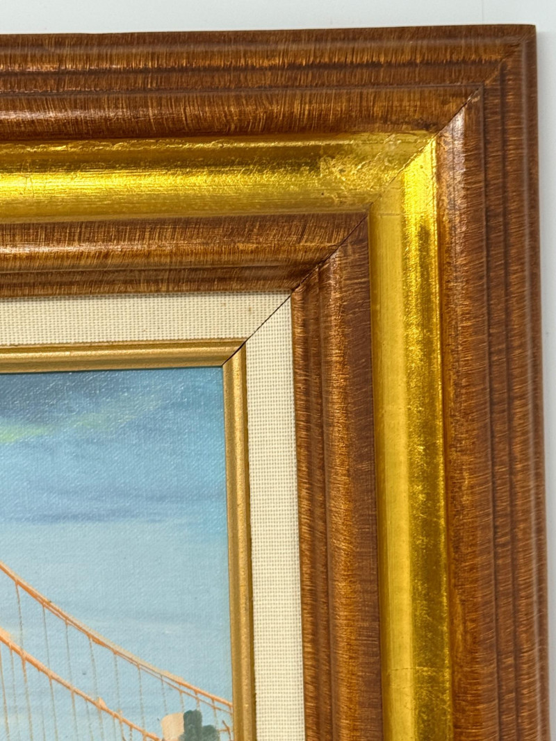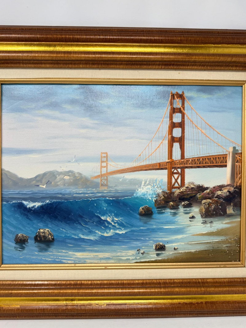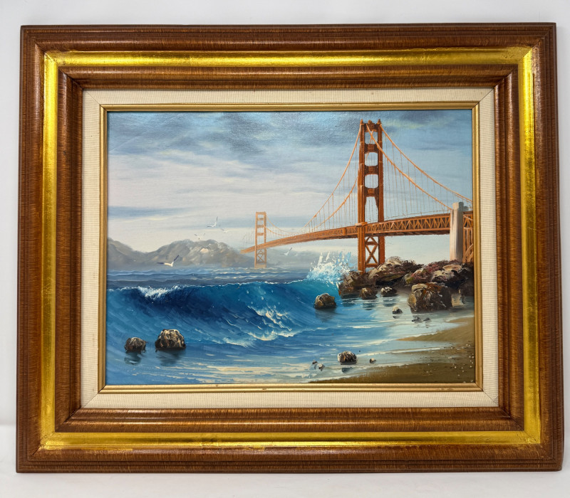 The bridge is viewed from a beach perspective, looking toward the Marin Headlands with dynamic, breaking blue waves in the foreground.Framing: The artwork is set in a multi-layered, ornate frame consisting of a dark wood outer layer, a gold-leafed inner section, and a traditional white linen liner. Unsigned original oil on canvas of the iconic Golden Gate Bridge