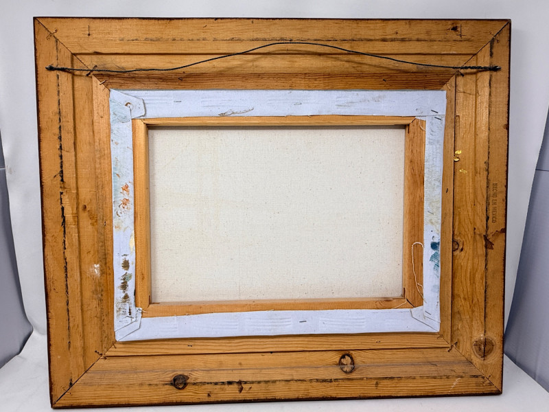 23.25”x19.25”x1.5” wood frame with gold foil accents.