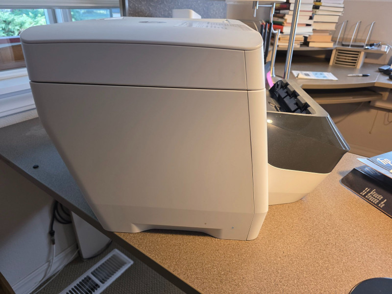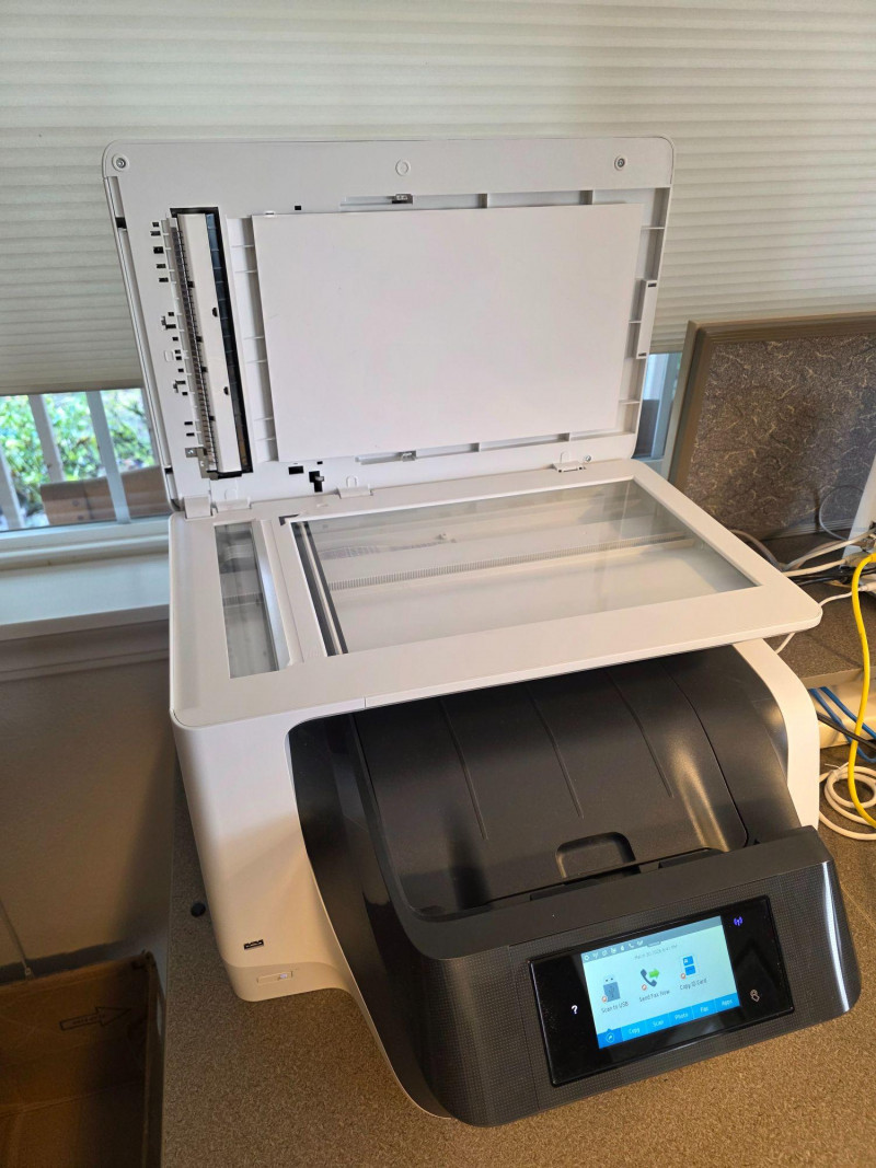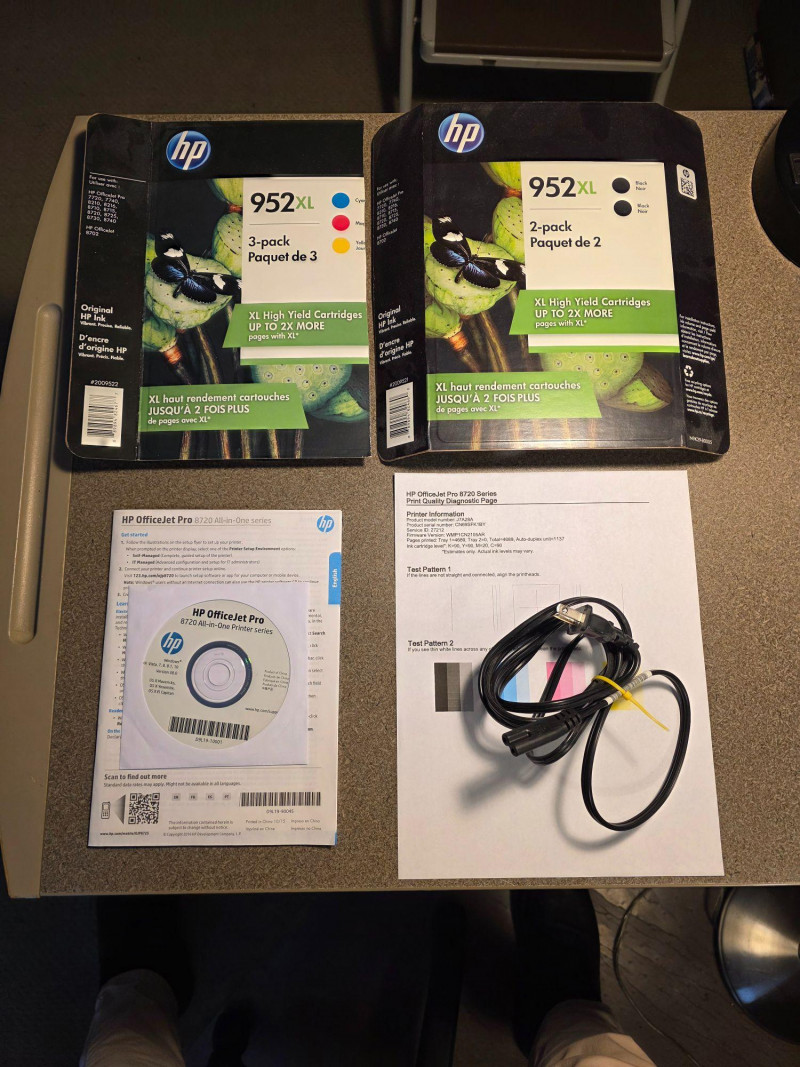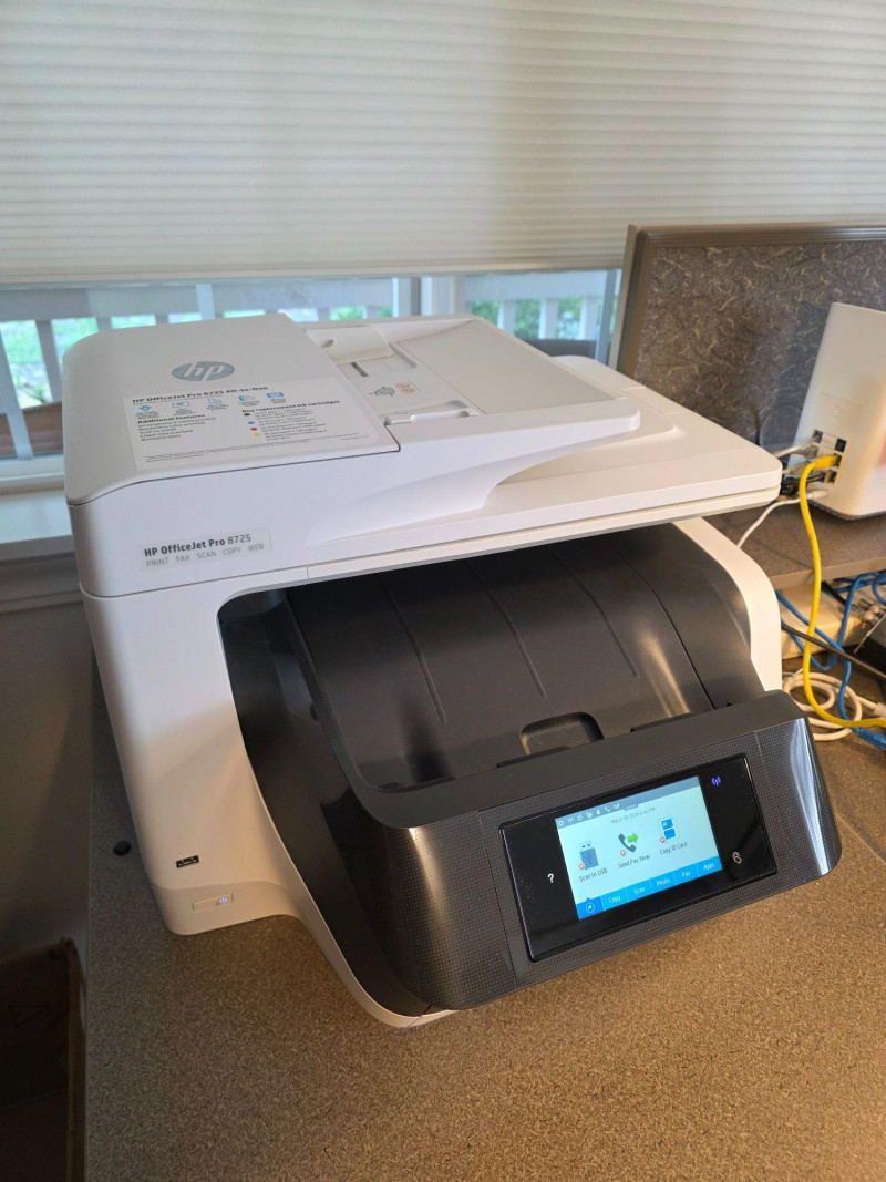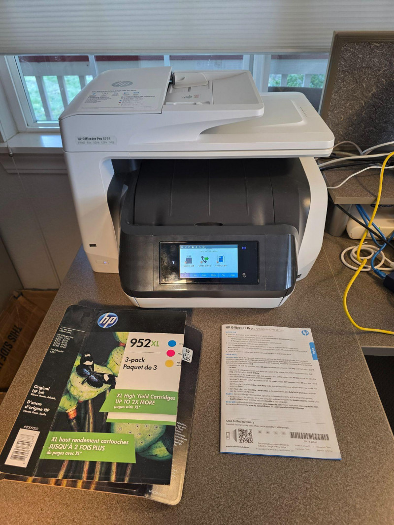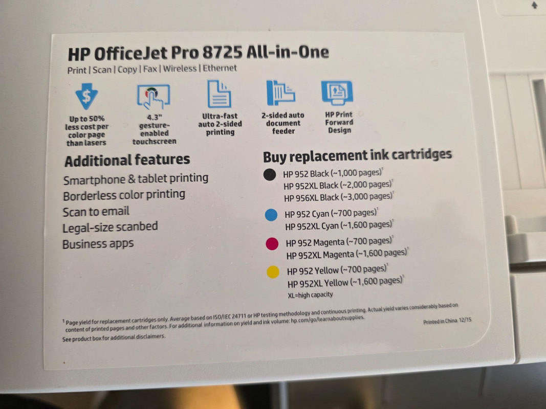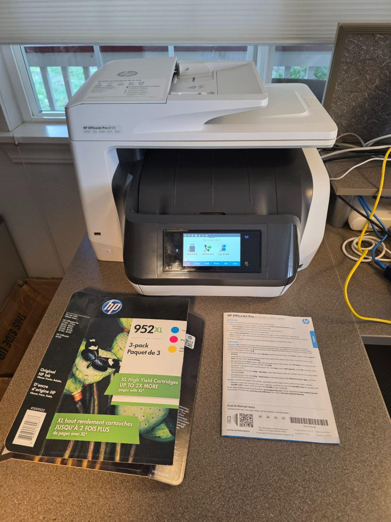 HP OfficeJet Pro 8725 All-In-One Printer The HP OfficeJet Pro 8725 is a high-performance all-in-one inkjet printer designed for small offices, offering fast printing (up to 24 ppm black/20 ppm color), scanning, copying, and faxing Features automatic two-sided printing, a 4.3-inch touchscreen, and wireless/mobile printing capabilities, designed for a duty cycle of up to 30,000 pages per month Functions: Print, scan, copy, and fax Performance: Professional mode speeds up to 24 ppm (black) and 20 ppm (color) Wireless: Built-in Wi-Fi, Ethernet, and mobile printing (HP Smart App, AirPrint). Interface: 4.3-inch (10.9 cm) touchscreen display Handling: Automatic document feeder (ADF) and automatic two-sided printing Ink: Uses four individual cartridges (black, cyan, magenta, yellow) Includes power cord, (1) new 952XL Magenta, (1) new 952XL Black, manual & software Tested - Works! 13.5" x 20"W x 21"D