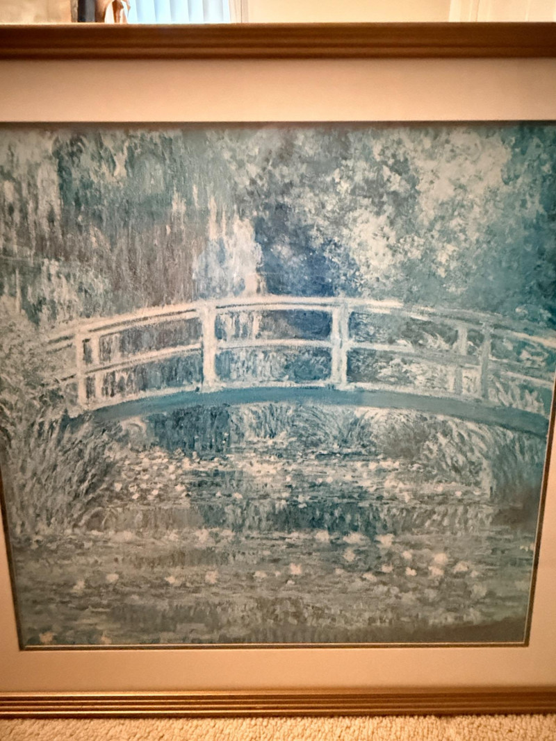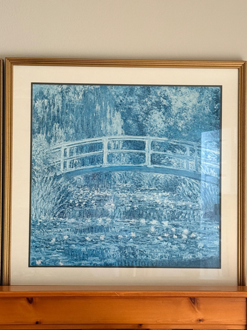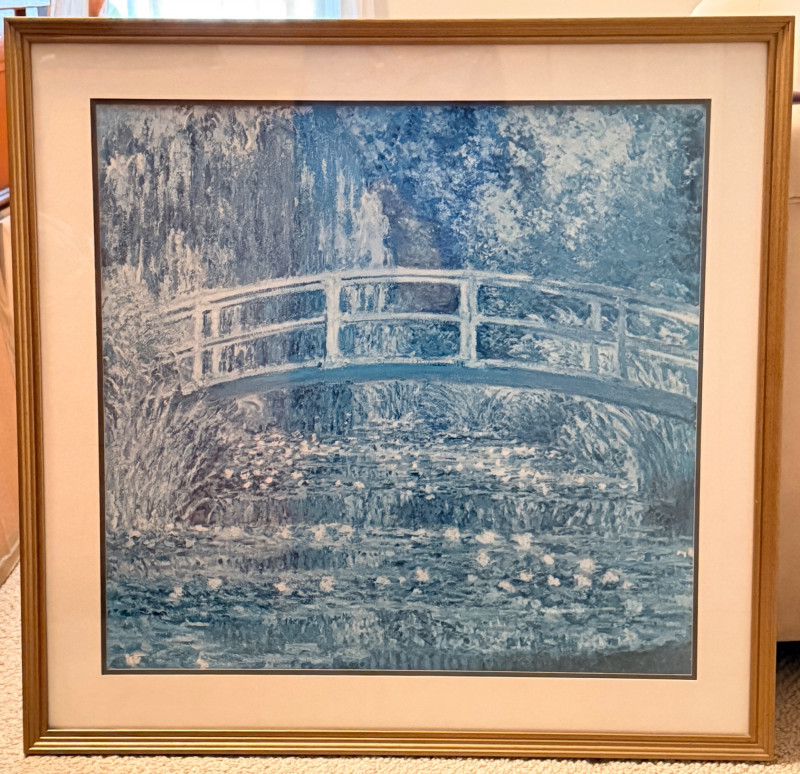 An offset lithograph by Claude Monet entitled The Water-Lily Pond (also known as Water Lilies and Japanese Bridge), originally created in 1899.