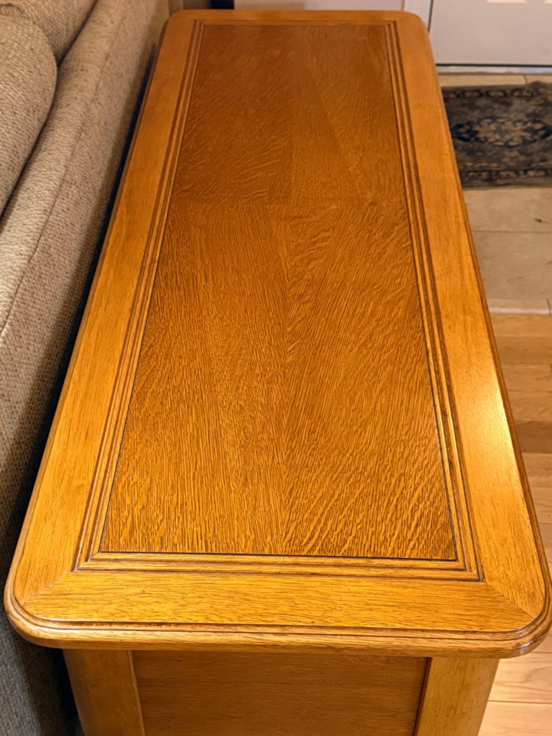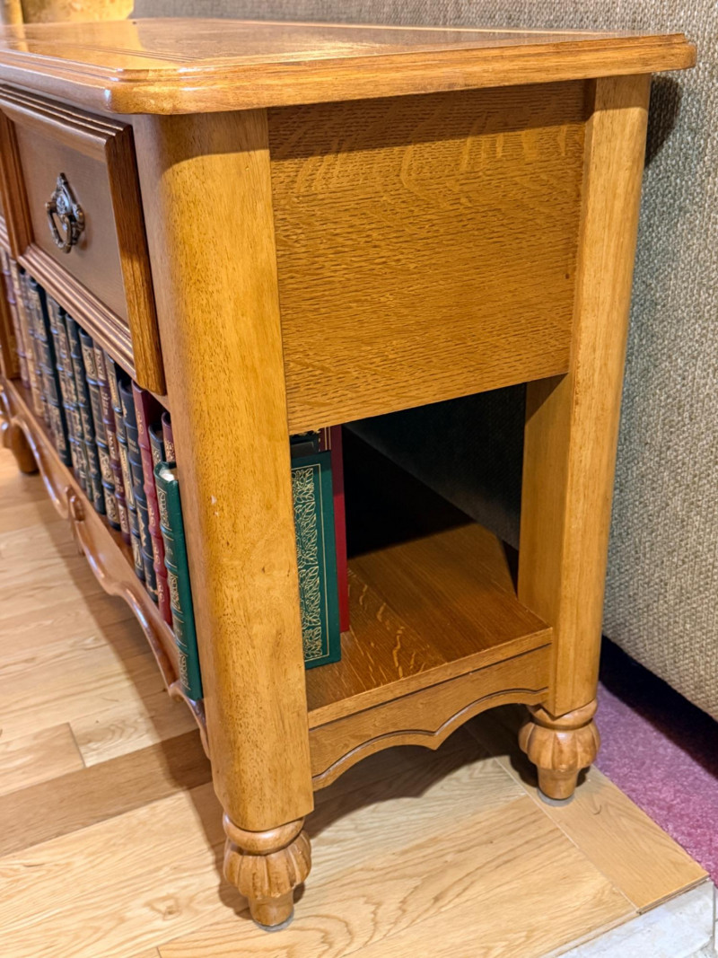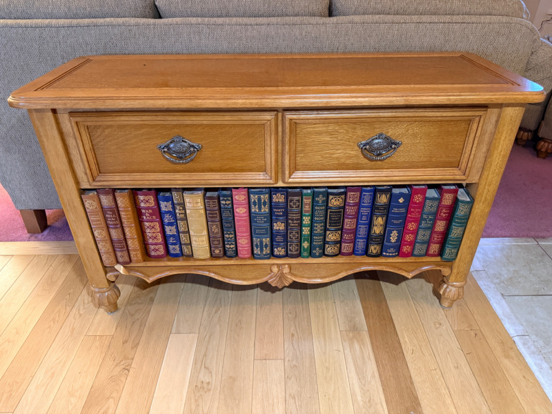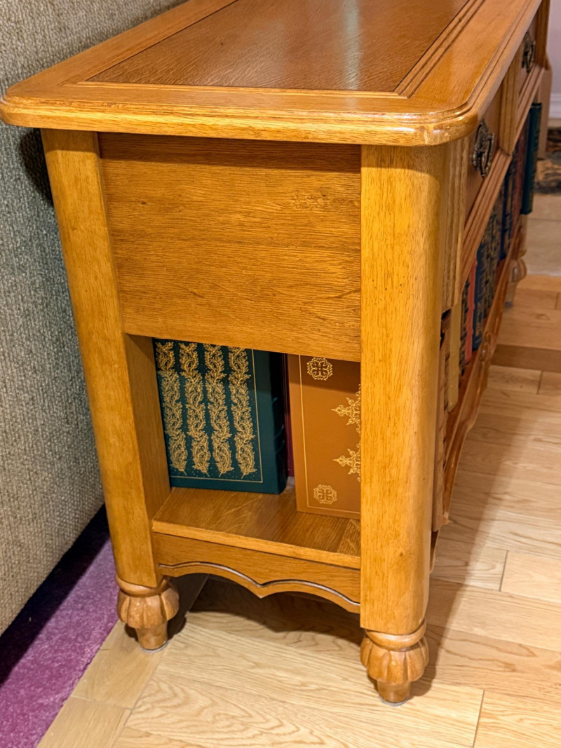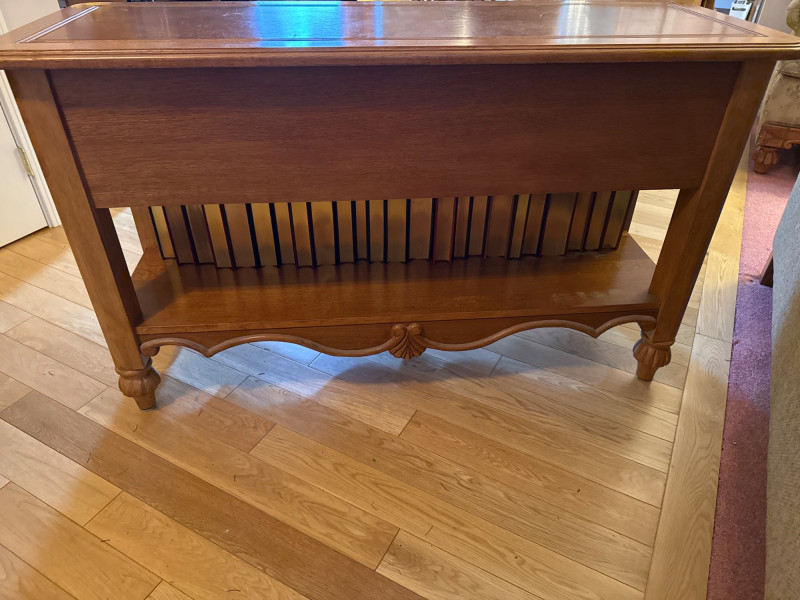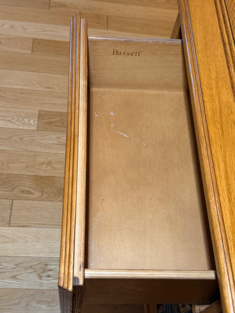 Bassett Furniture 2 Drawer Sofa Table Two framed drawers with ornate antique brass hardware. A warm oak finish over solids and veneers. A distinctive scalloped base trim with a central carved shell or floral motif and elegant carved legs. Books are not included. 50”x18”x29.5”