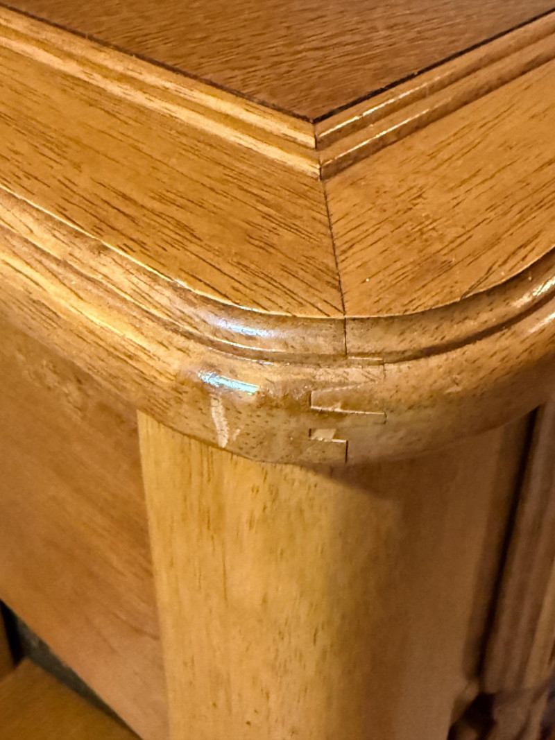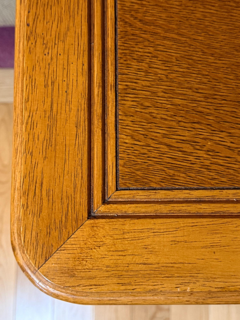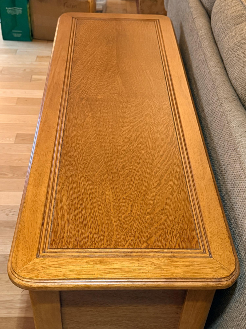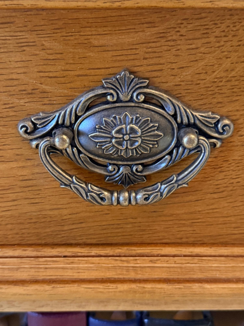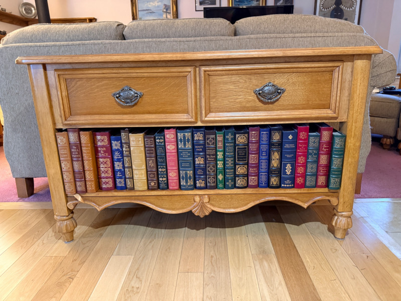 Bassett Furniture 2 Drawer Sofa Table Two framed drawers with ornate antique brass hardware. A warm oak finish over solids and veneers. A distinctive scalloped base trim with a central carved shell or floral motif and elegant carved legs. Books are not included. 50”x18”x29.5”