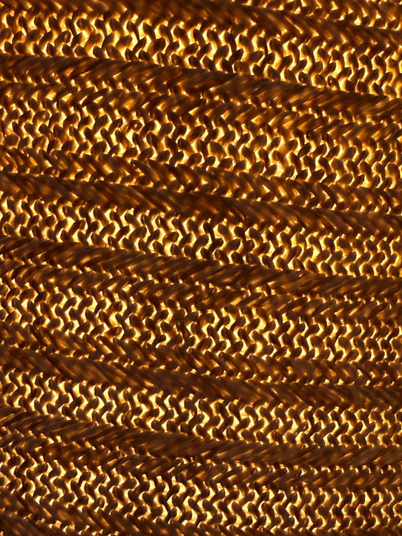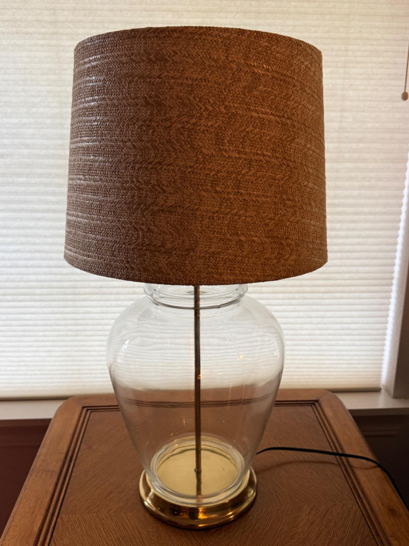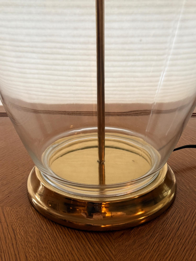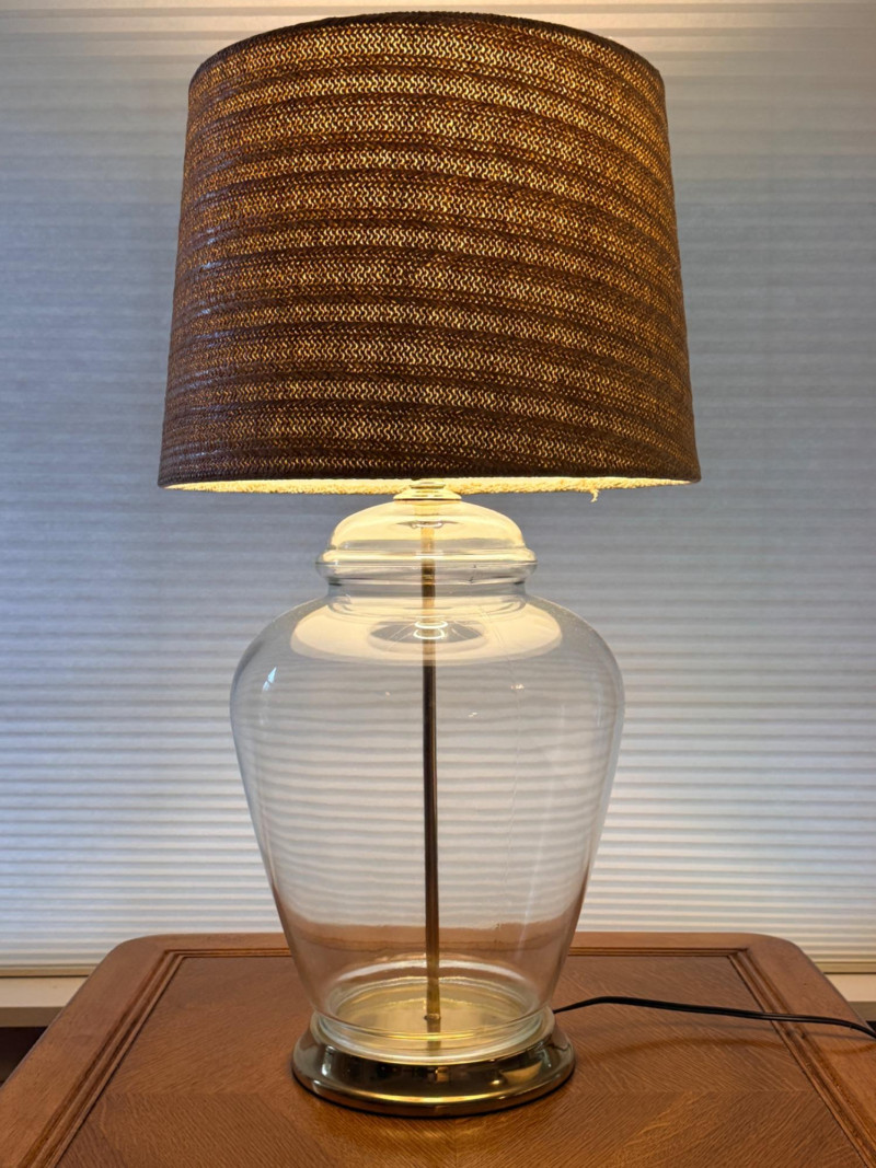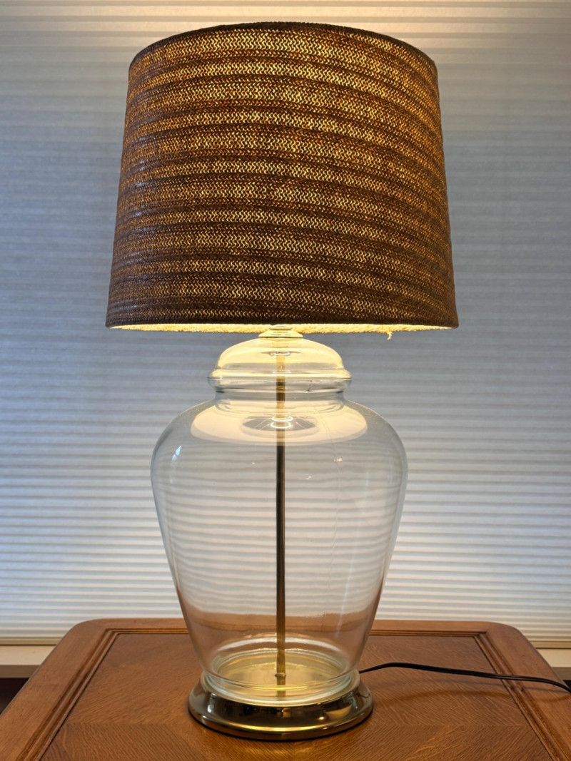 Clear glass ginger jar table lamp with textured spiral drum shade and brass base. Tested, works!
