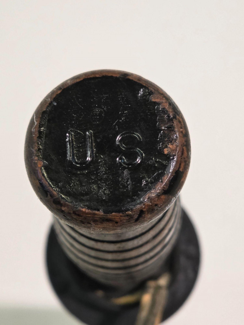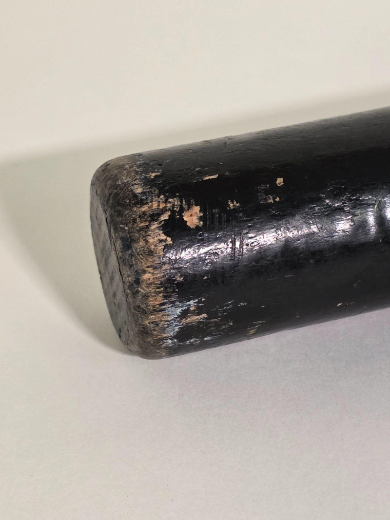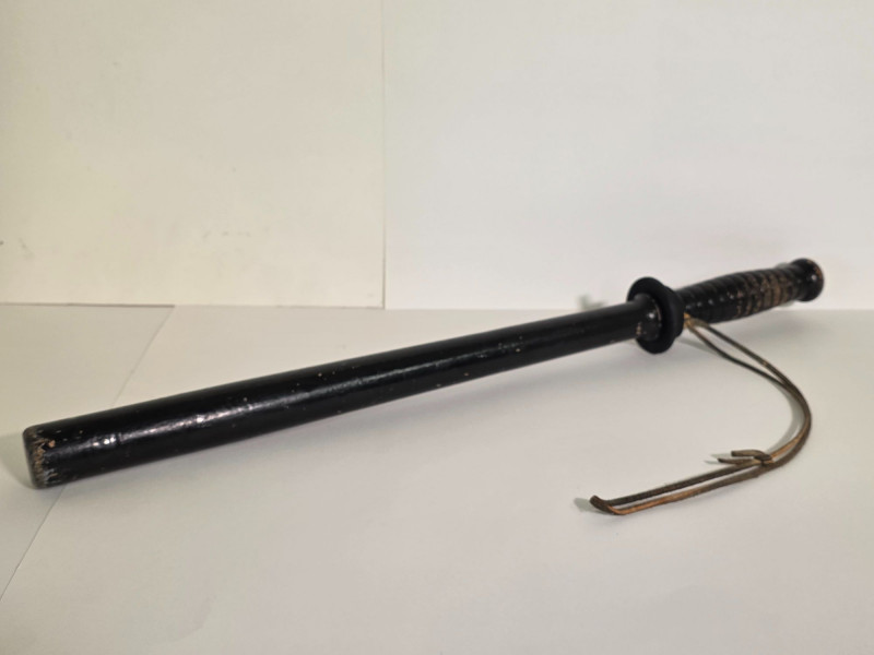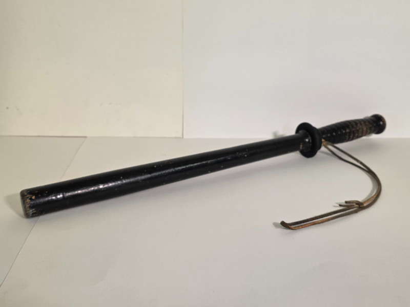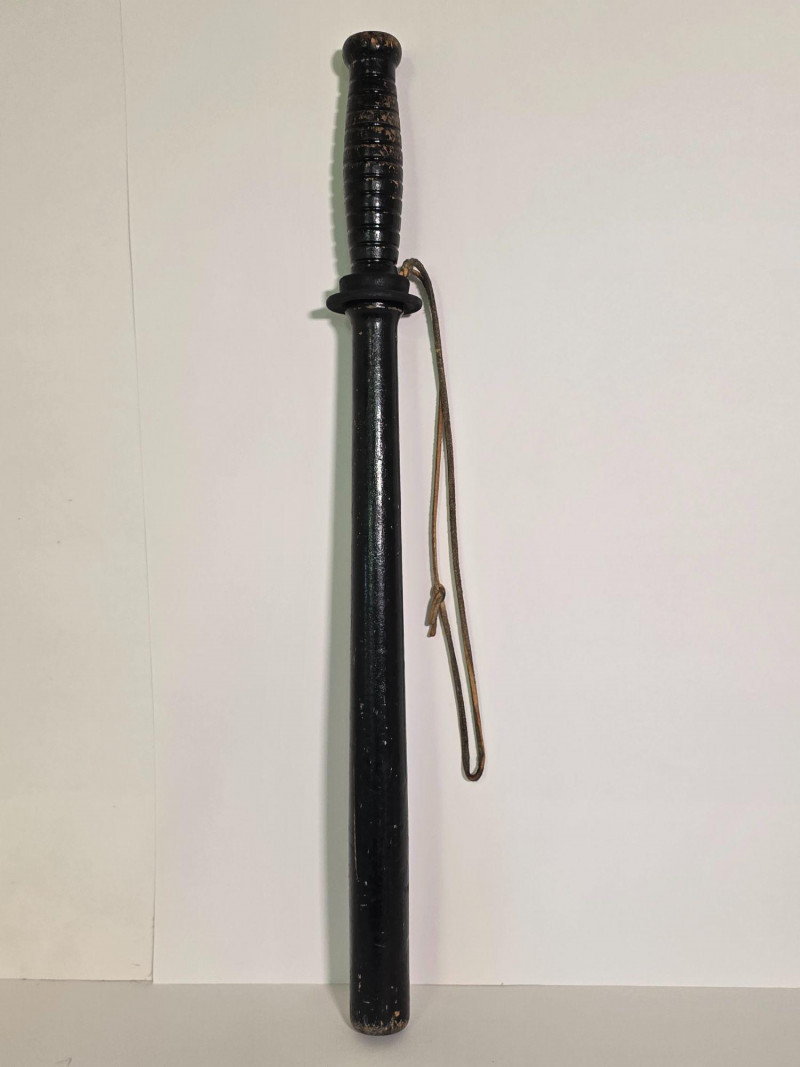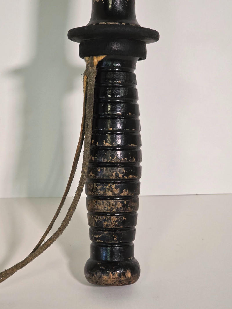 Vintage Wooden Military Baton Or "Nightstick" With Leather Wrist Cord Stamped "US" on the butt of the handle Crafted from a dark, dense wood with a black finish that shows signs of age and wear The grip features grooved rings. The baton is in good vintage condition (see pics) 22"L x 1.25"W