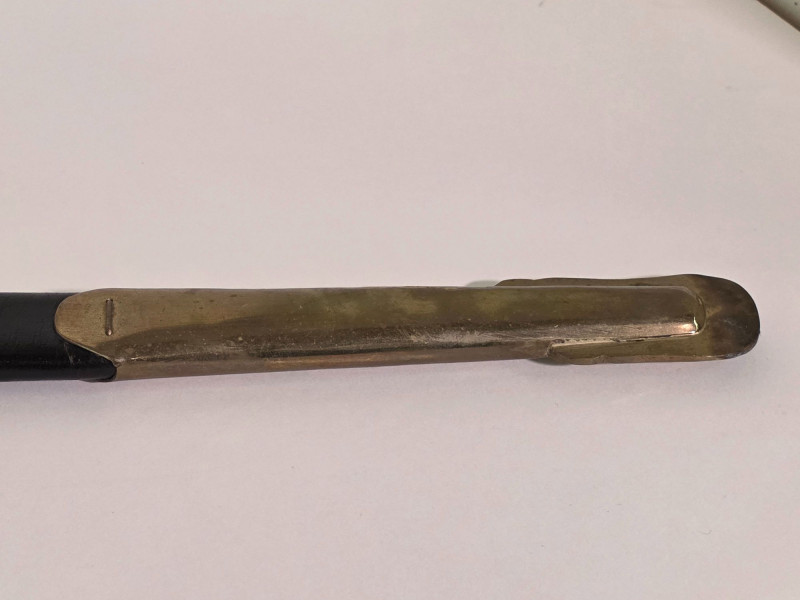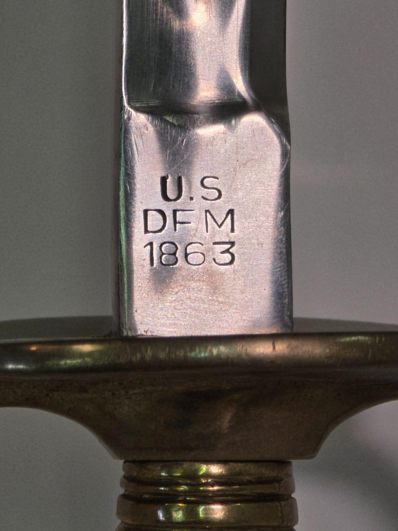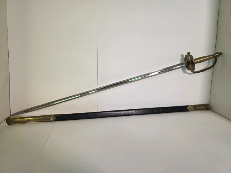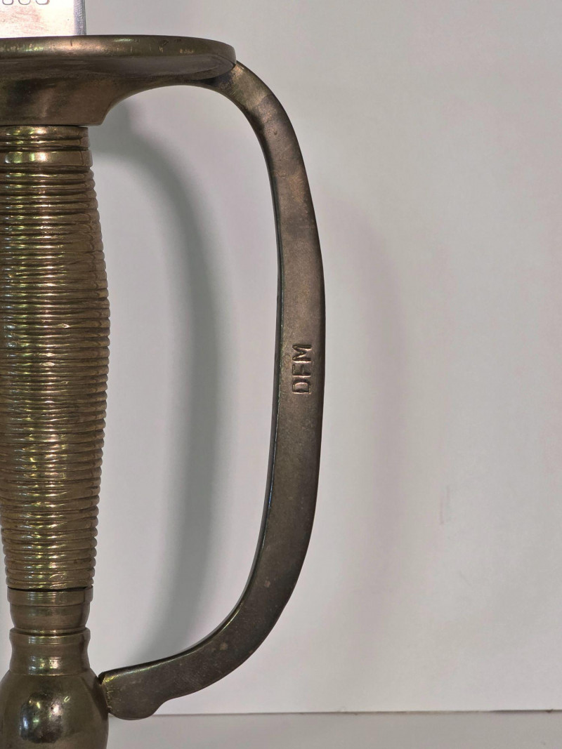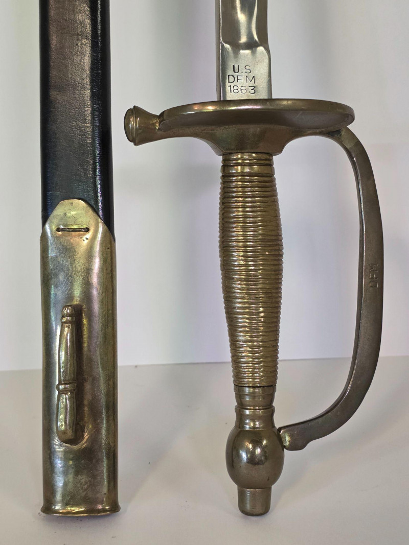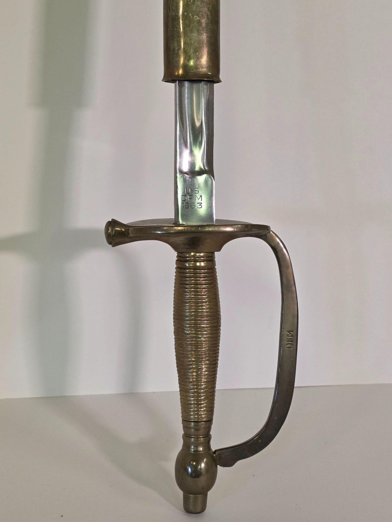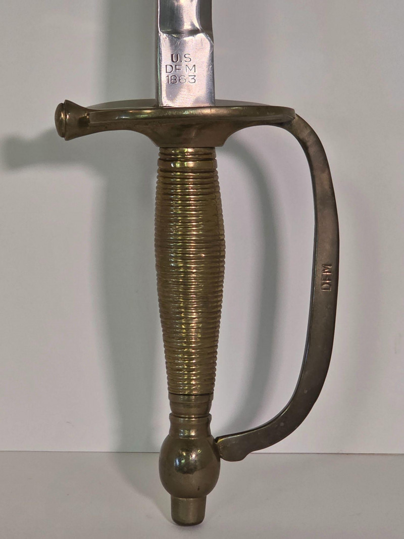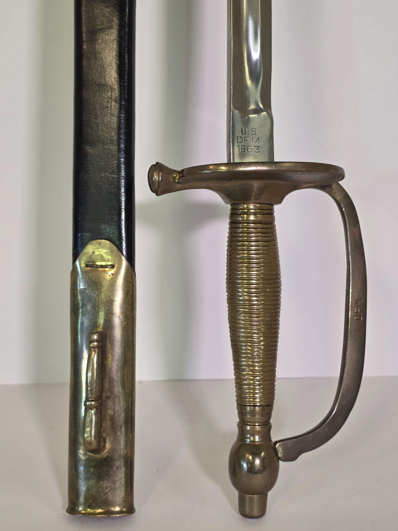 US Model 1840 NCO Ceremonial Sword With Brass & Leather Scabbard Gorgeous Non-Commissioned Officer's Model 1840 cermonial dress sword with brass and leather scabbard Marked with the "U.S.", "DFM", and "1863" on the sword's ricasso. Also marked "DFM" on the hilt of the sword The letters "DFM" on the ricasso and hilt refer to the inspector's initials of Dexter F. Mosman The "U.S." refers to the item being issued by the U.S. Government The "1863" refers to the year on manufacture Total length of sword: 37.75" Total length of blade: 32.5" Total length of scabbard: 34.75"