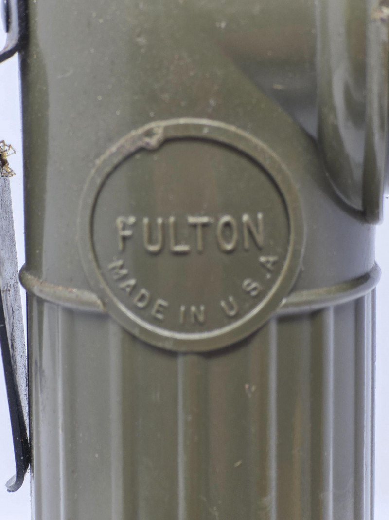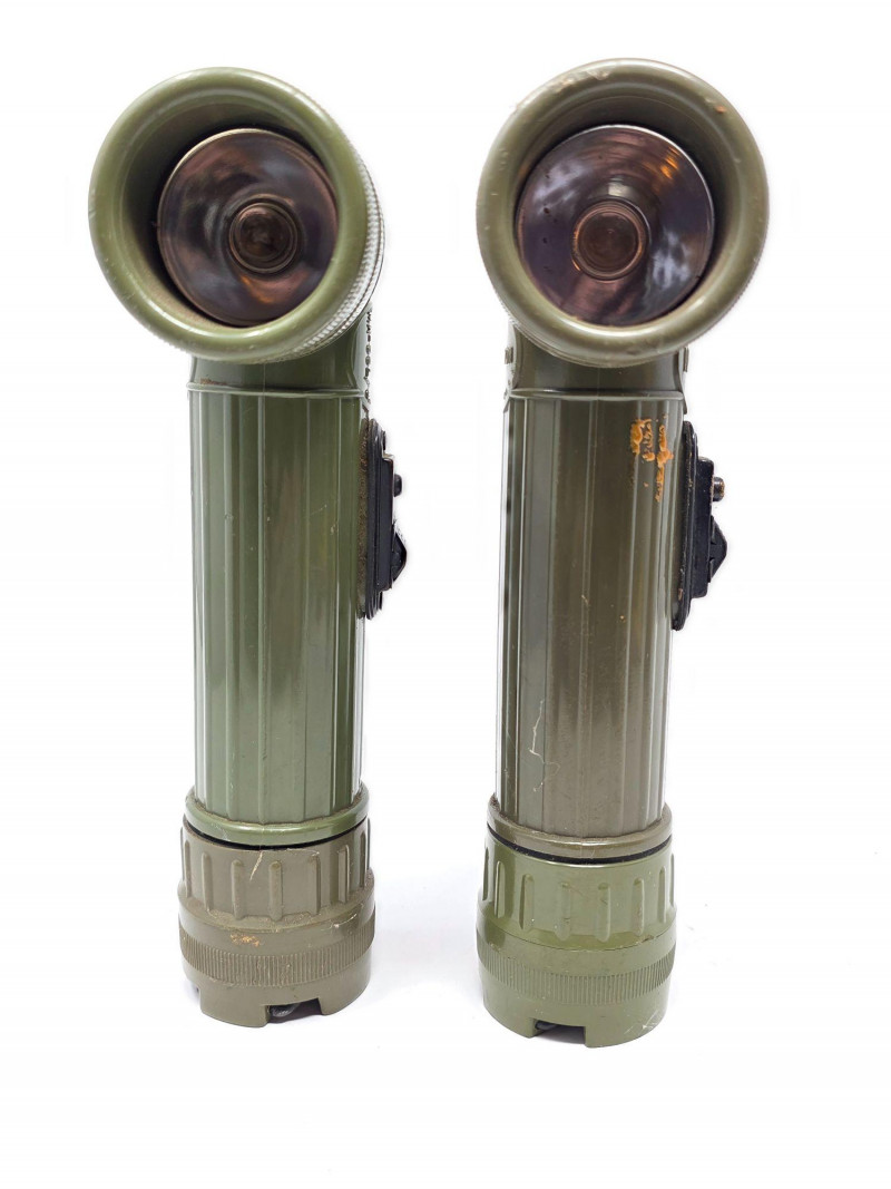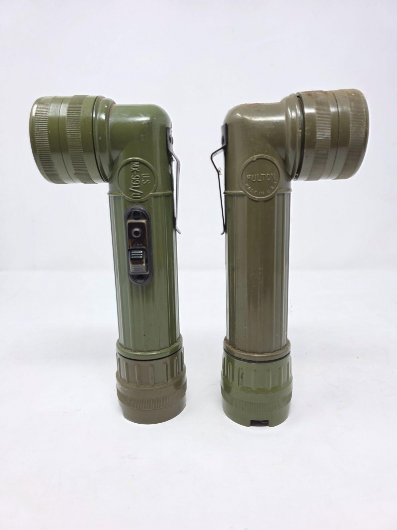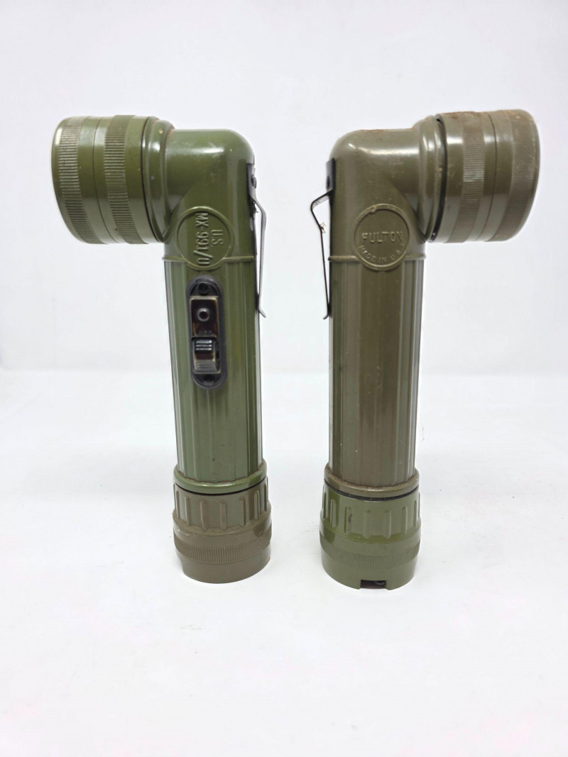 (2) Vintage Fulton MX-991/U Right-Angle Military Flashlight Durable olive drab plastic construction with a distinct 90-degree angle head. Includes a belt clip, a bottom lanyard ring, and a 3-position switch for off, on, and momentary signaling. Powered by two D-cell batteries and often features a spare bulb compartment in the base. This model has been used by the United States military since the Vietnam War era The MX-991/U is an evolution of earlier military designs like the TL-122 series used during WWII. It saw extensive use during the Vietnam era Tested - Works! 8.25"T x 3.25"W x 2"D
