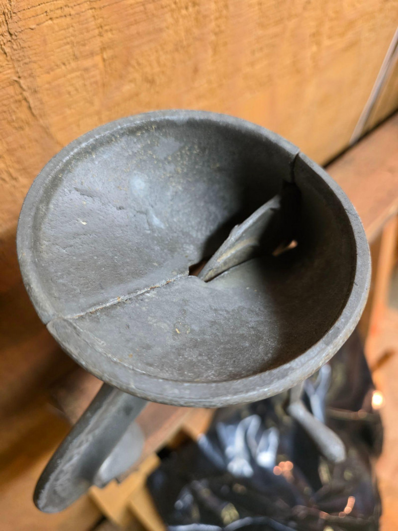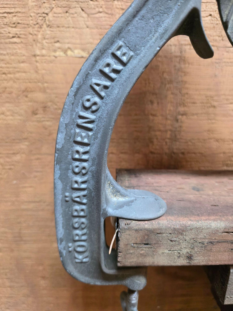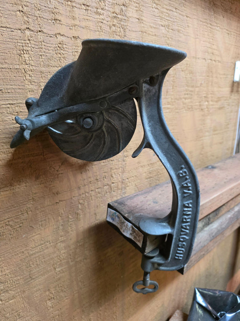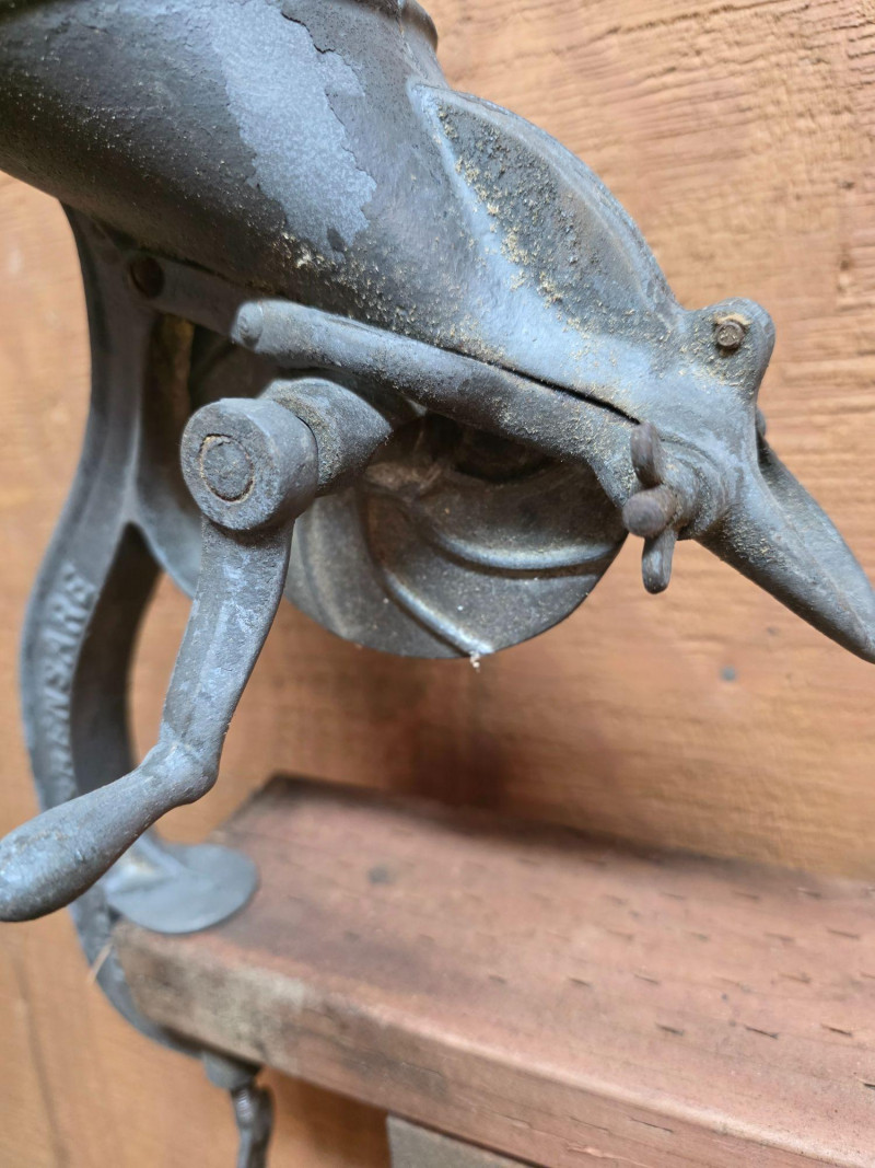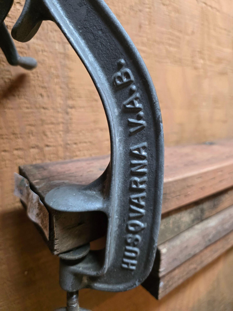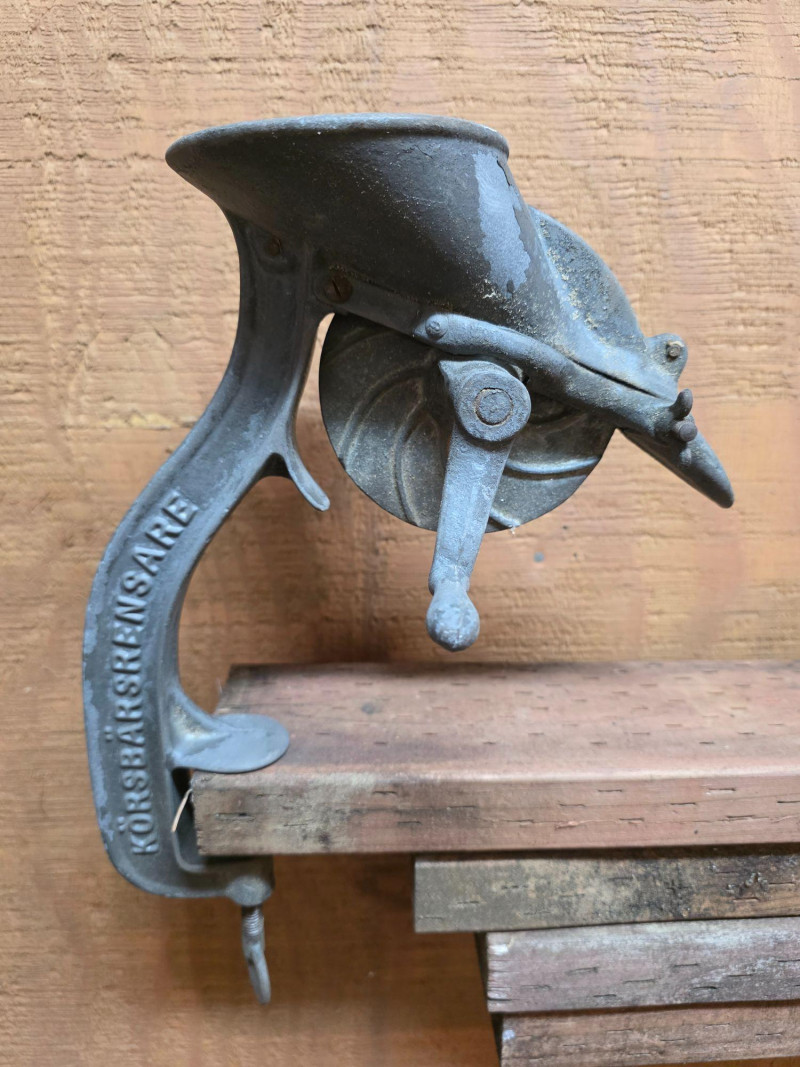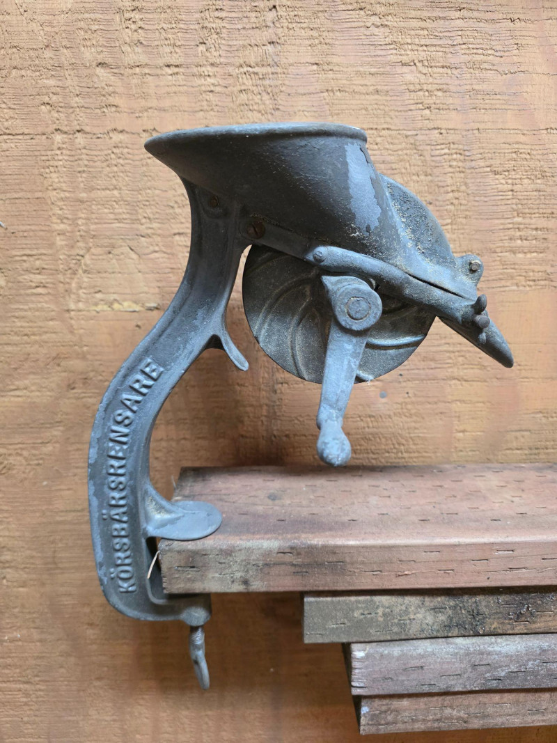 Vintage Cherry Stoner, an antique kitchen utensil used to remove pits from cherries. Manufactured by Husqvarna V.A.B. Cast iron construction, designed to be mounted to a table or countertop via a C-clamp. Operates via a hand crank that rotates a mechanism to separate the pit from the fruit.