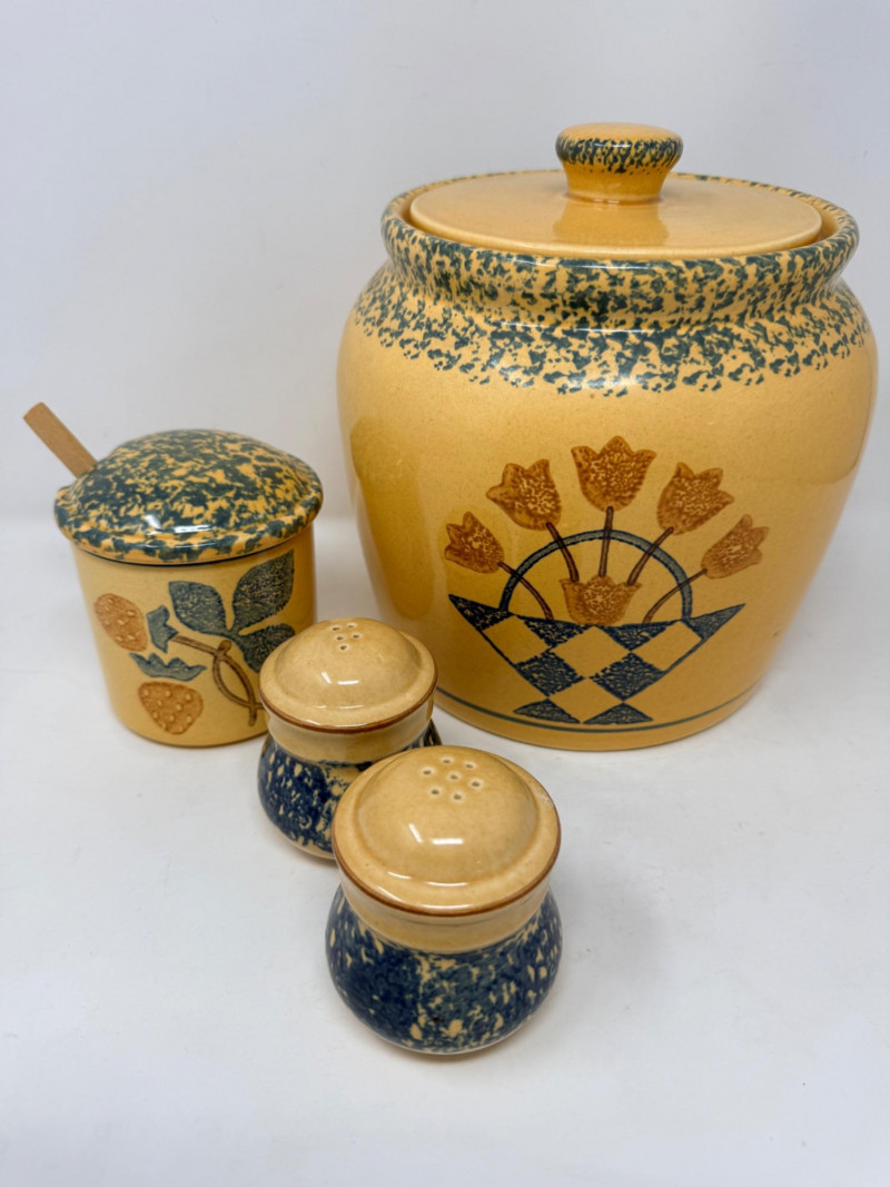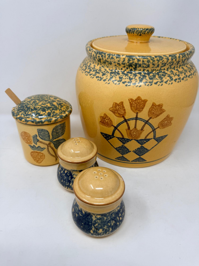 Pfaltzgraff Flowers of Love Covered Crock & More Salt and pepper set Lidded jam jar with wood spoon