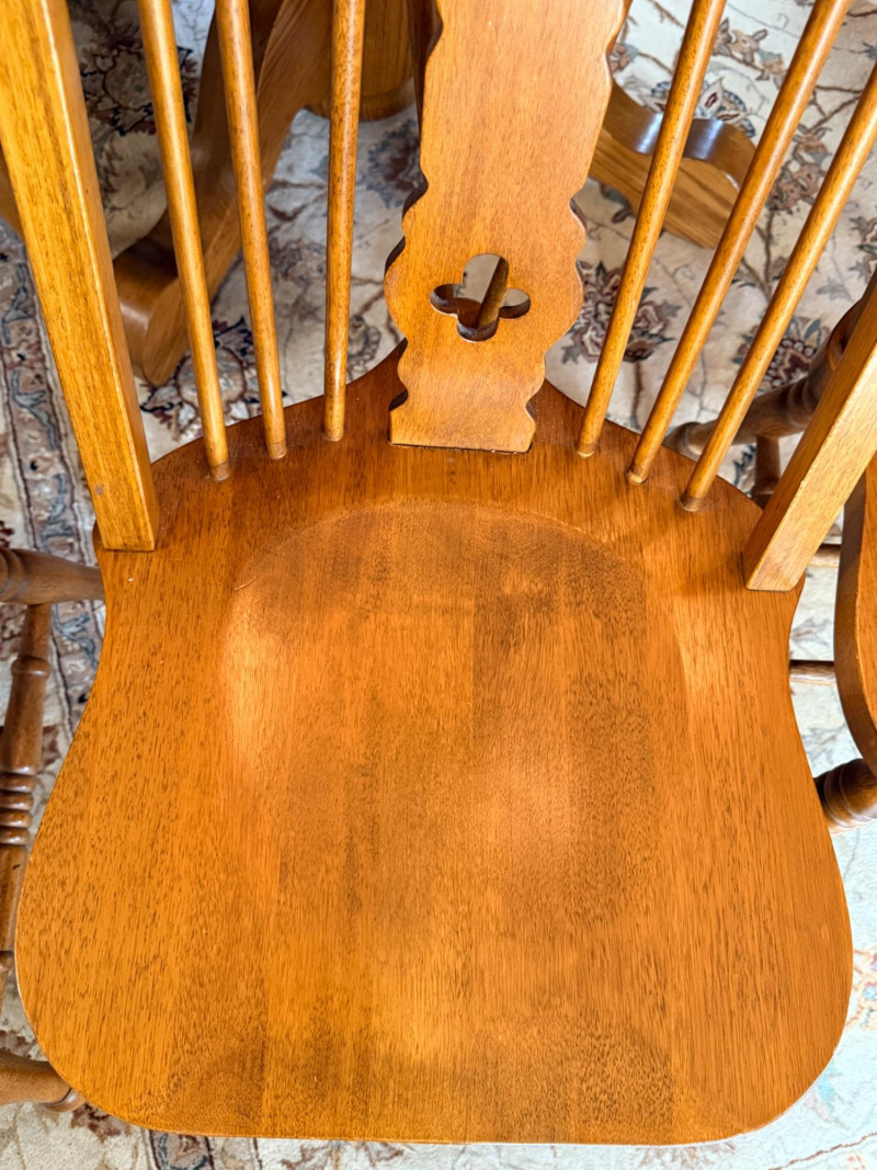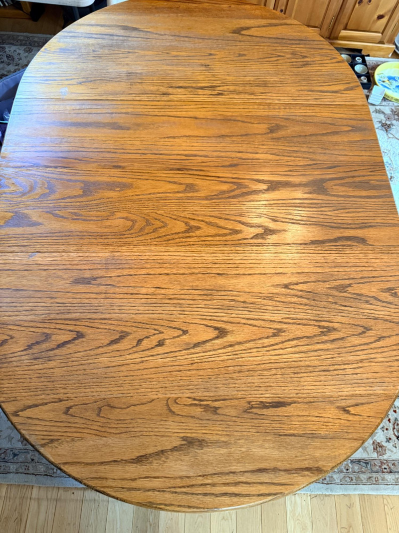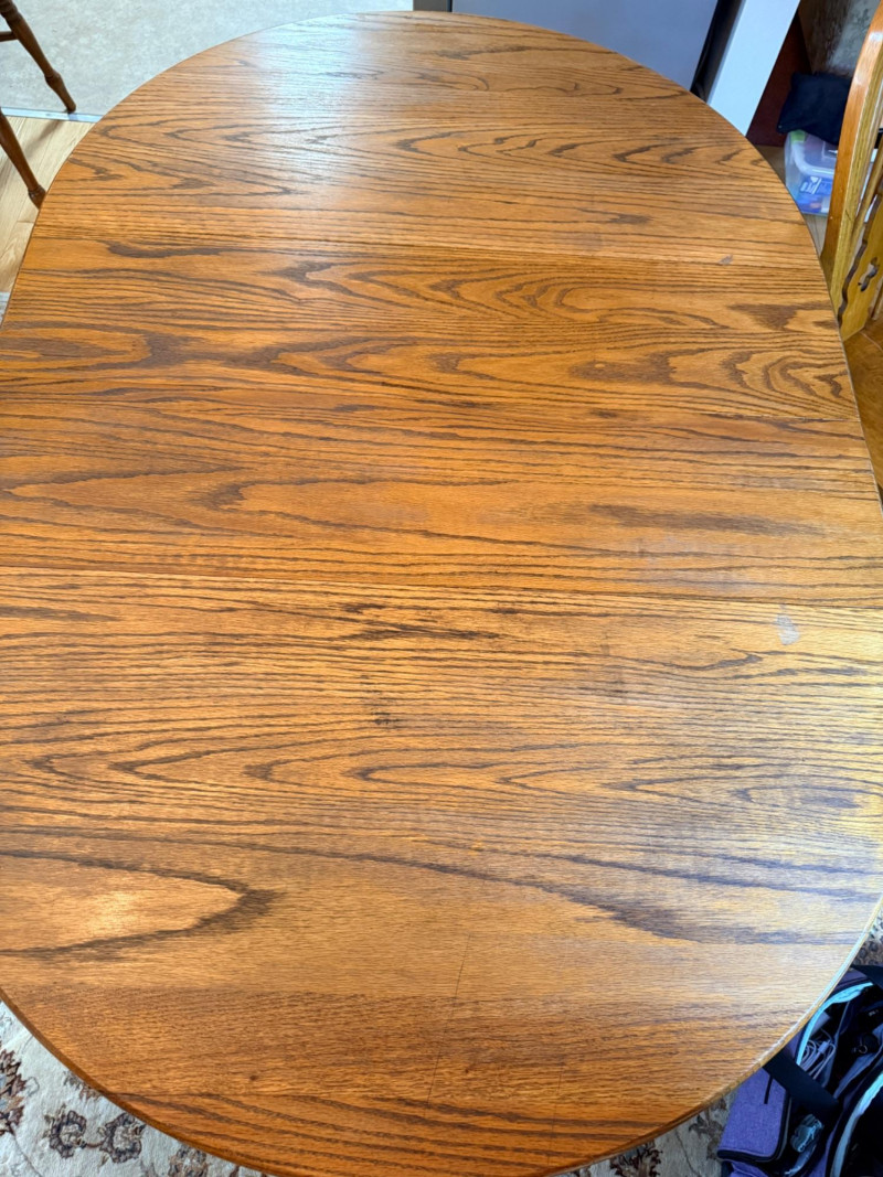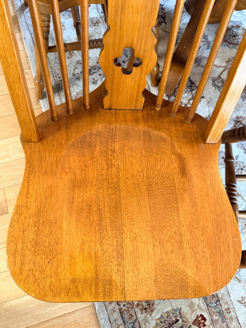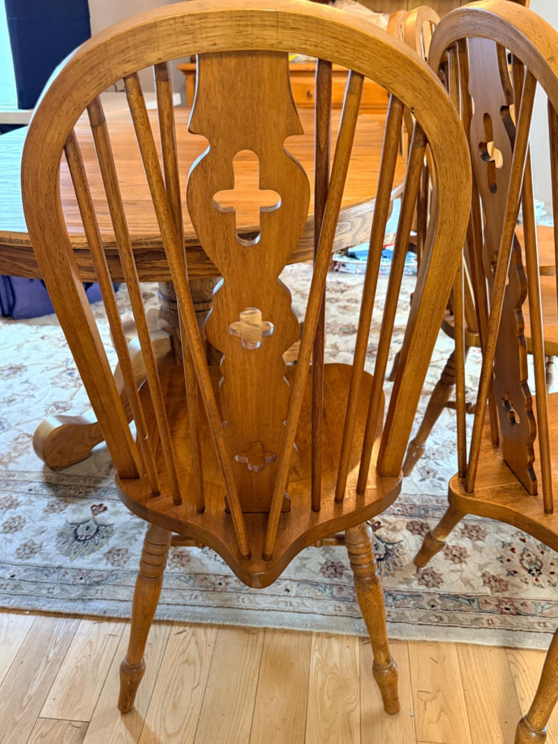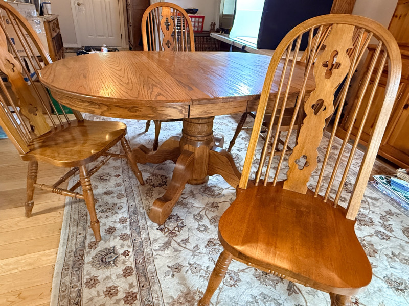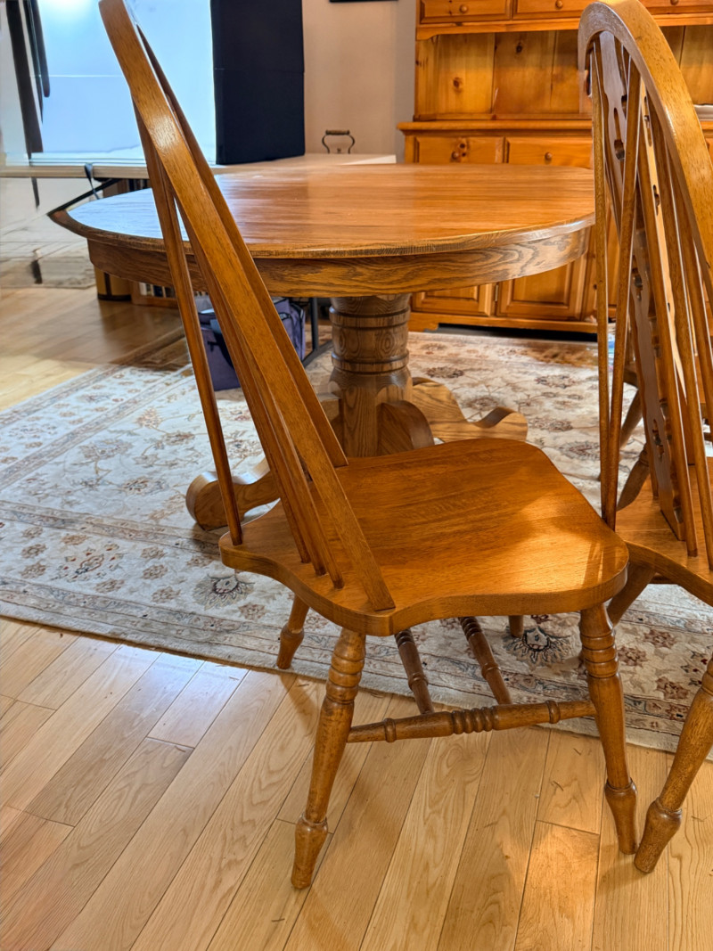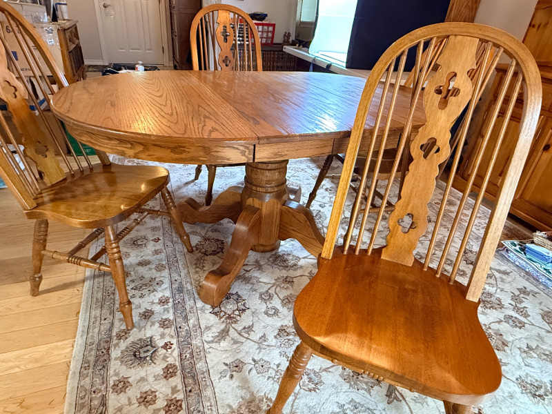 Round or Oval Oak Dining Table & 4 Chair Set Chairs are 17.5”x23”x41” with 17.5”’seat height. 2 chairs have 1 unnoticeable/easily repairable split in the seat. See pics for condition.