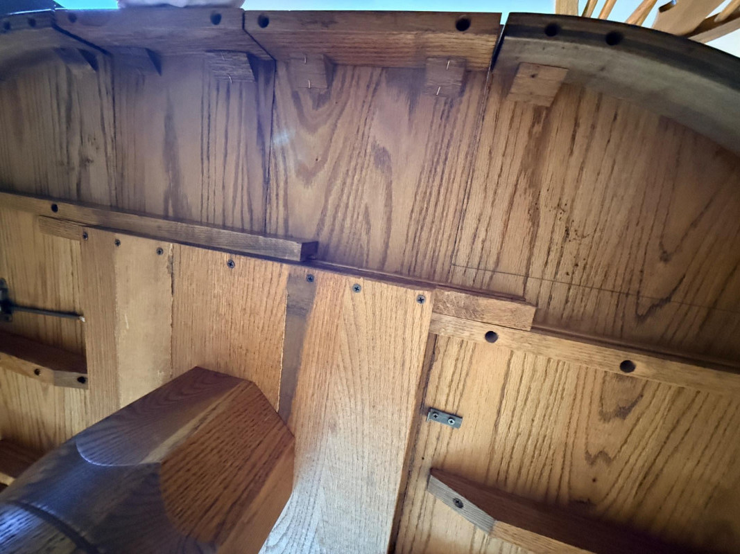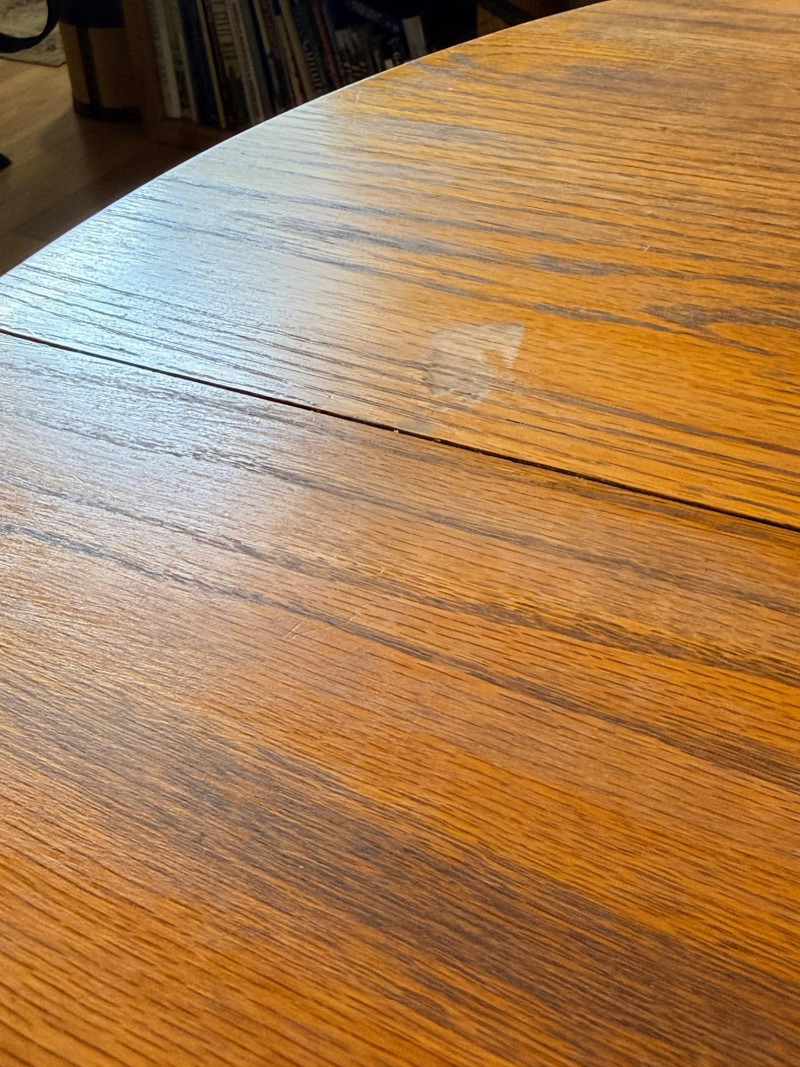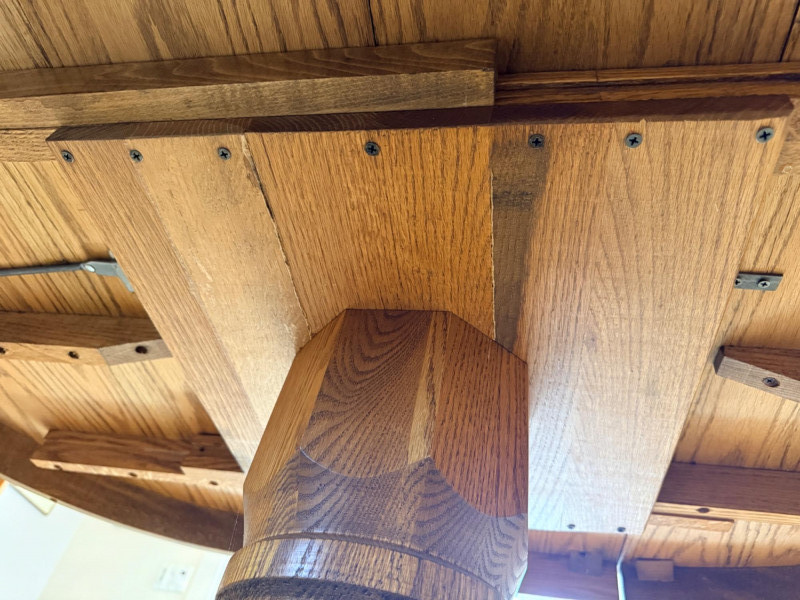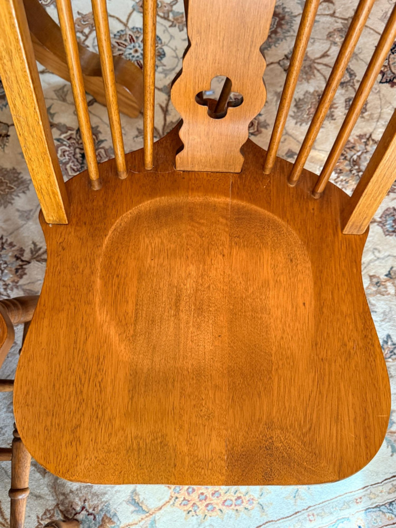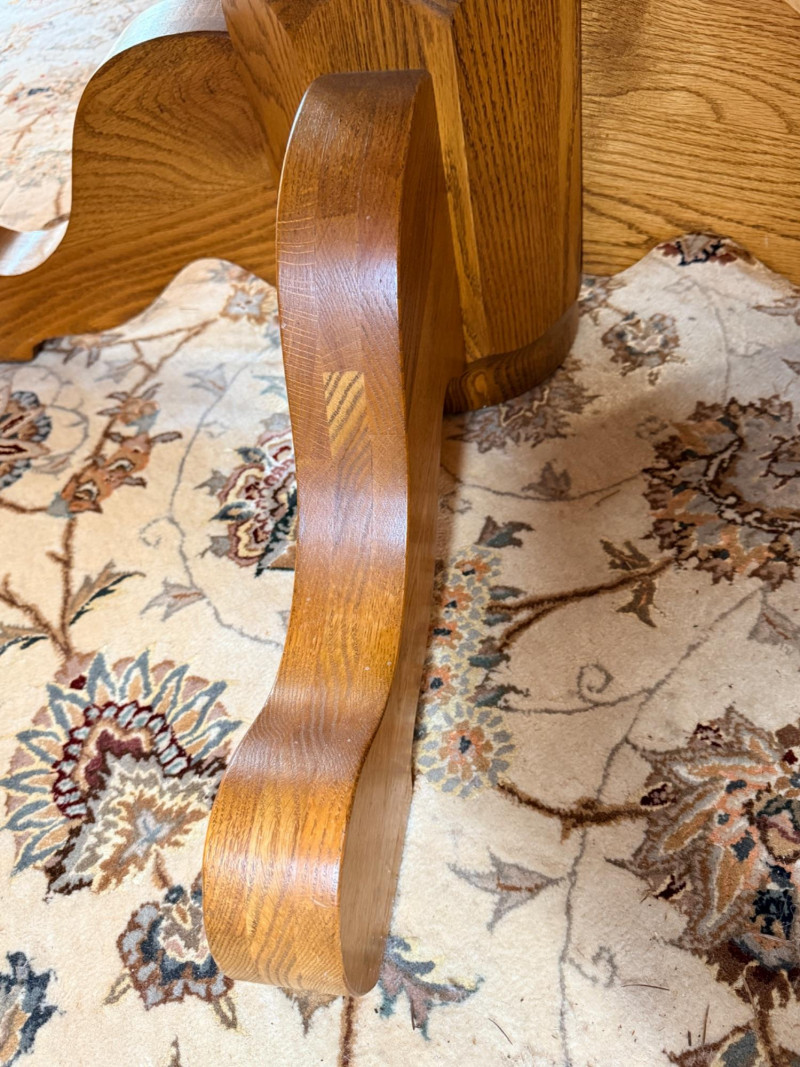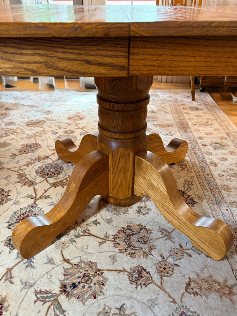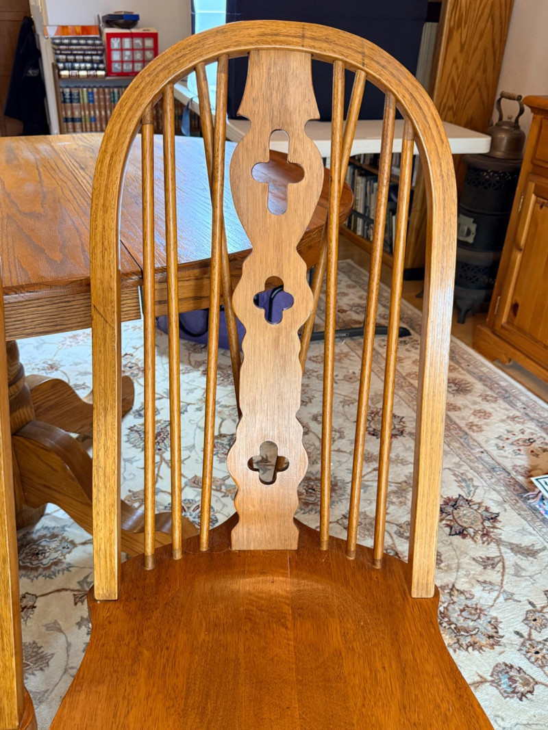 Round or Oval Oak Dining Table & 4 Chair Set Chairs are 17.5”x23”x41” with 17.5”’seat height. 2 chairs have 1 unnoticeable/easily repairable split in the seat. See pics for condition.