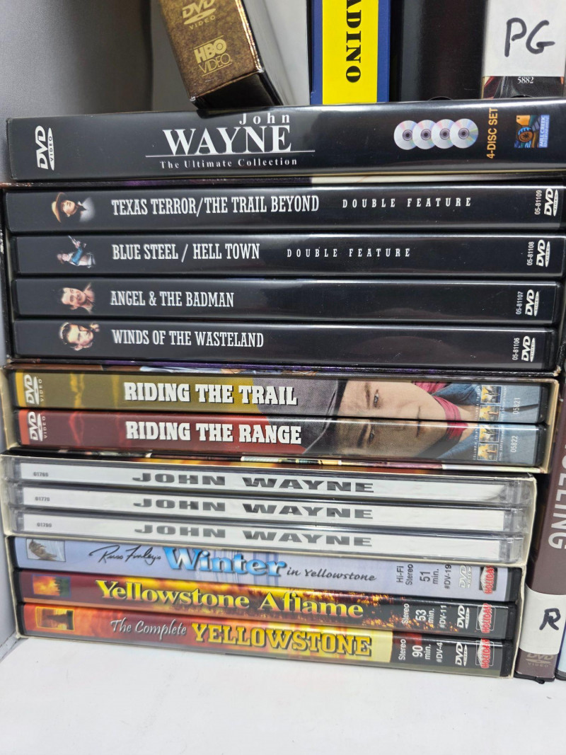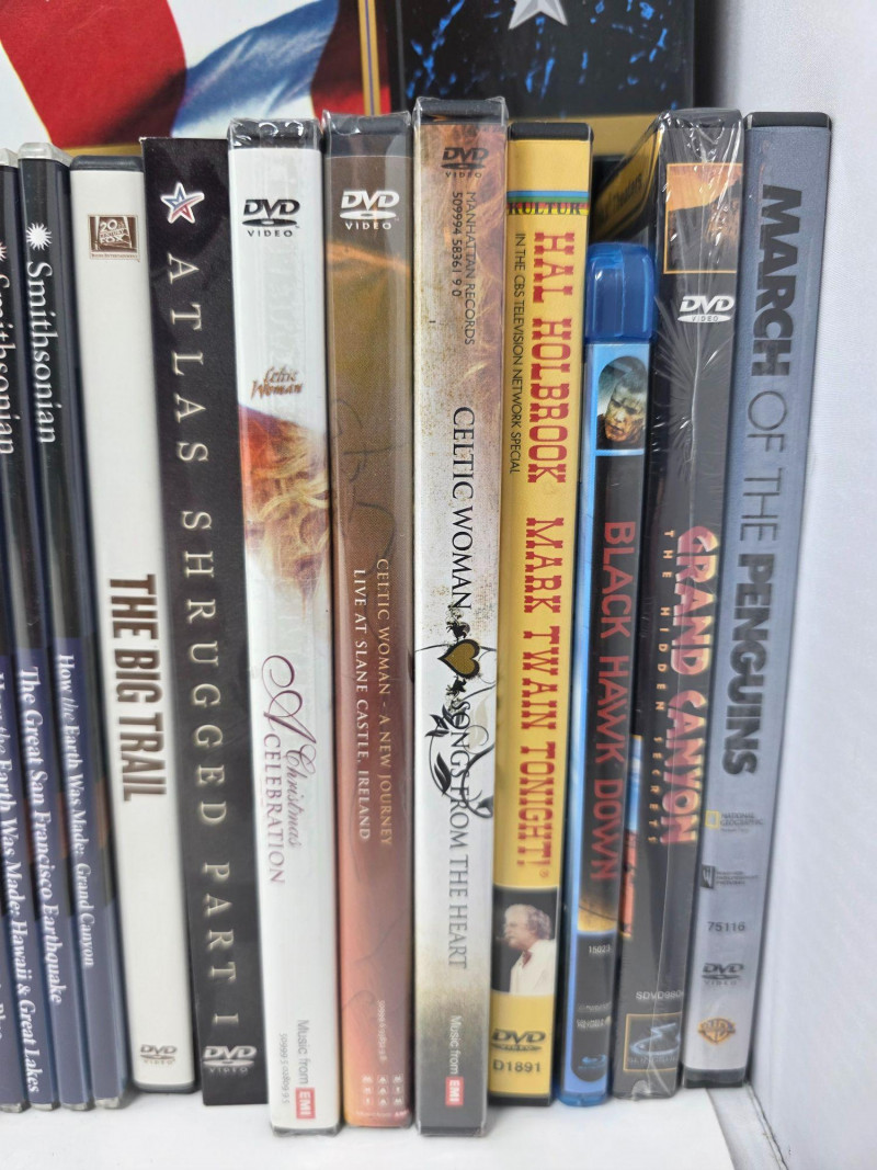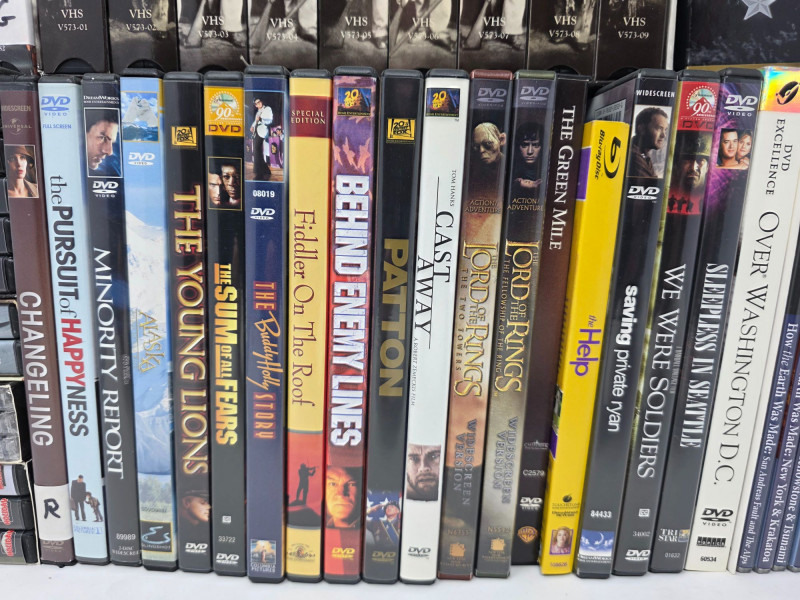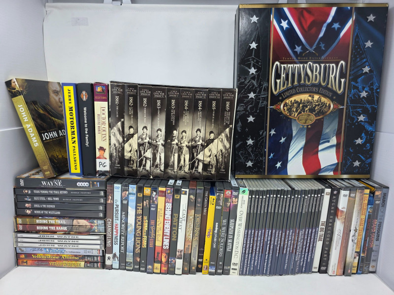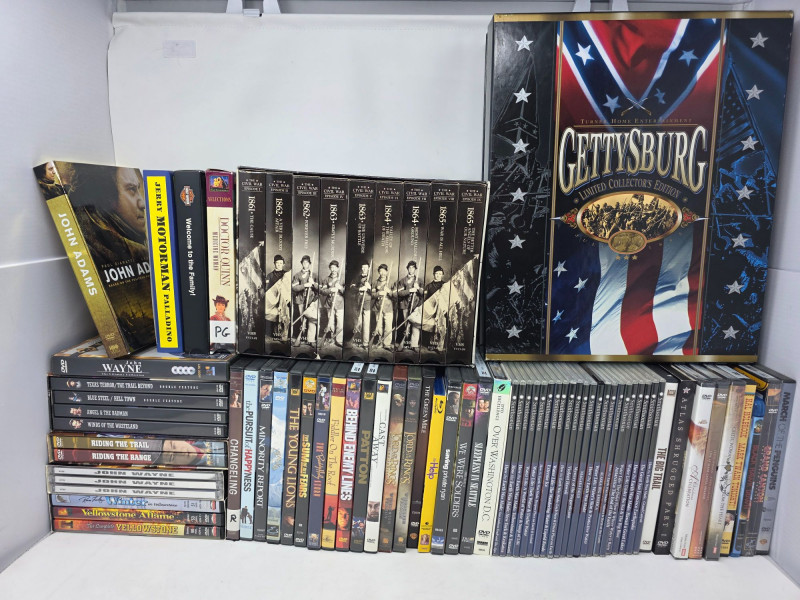 DVD & VHS Collection (43) DVD Movies: Large John Wayne Collection (18 movies), Minority Report, The Green Mile, Behind Enemy Lines, Patton, Cast Away, John Adams and more! (2) Blu-Ray: Black Hawk Down, The Help (22) Smithsonian Collection DVDs (1) Complete "The Civil War" on 9 VHS in original box (1) Complete "Gettysburg Limited Collector's Edition" including 3 VHS and book in original box Forget Netflix & Chill!