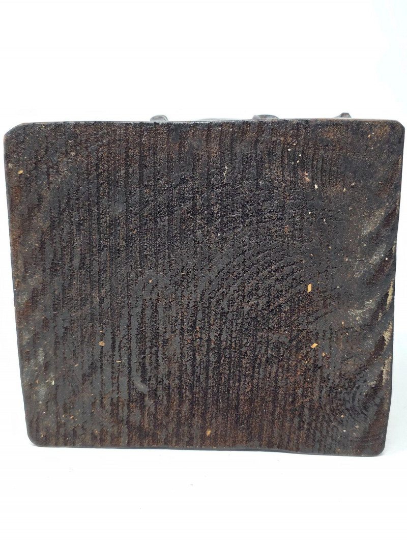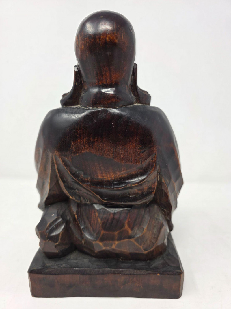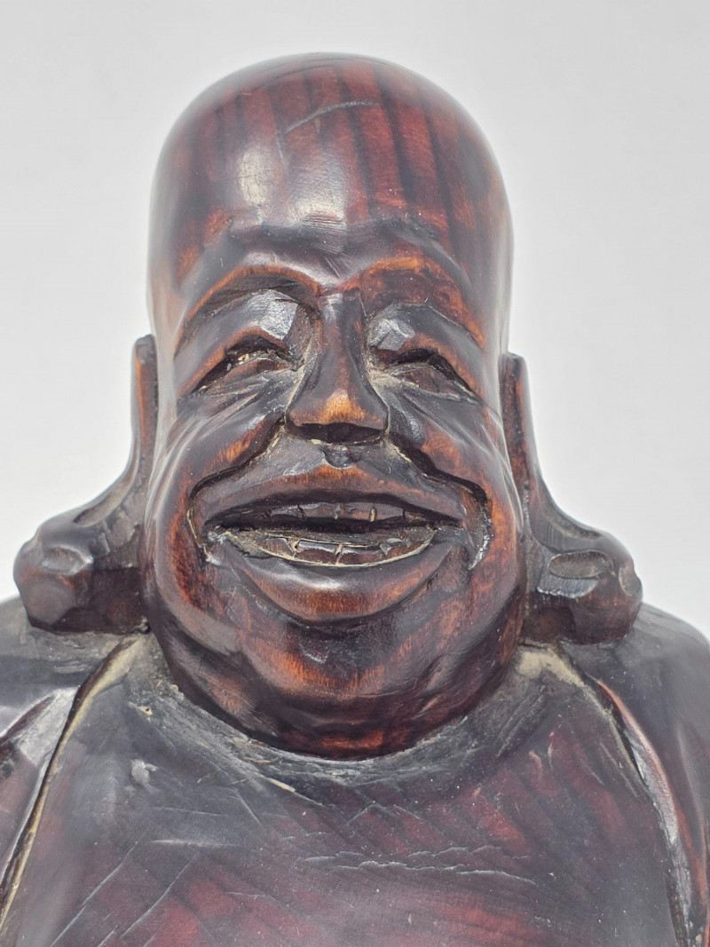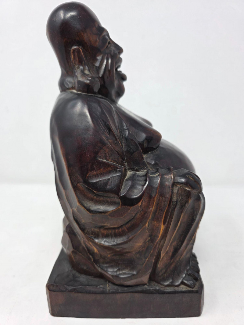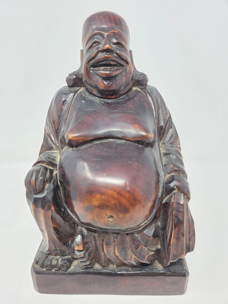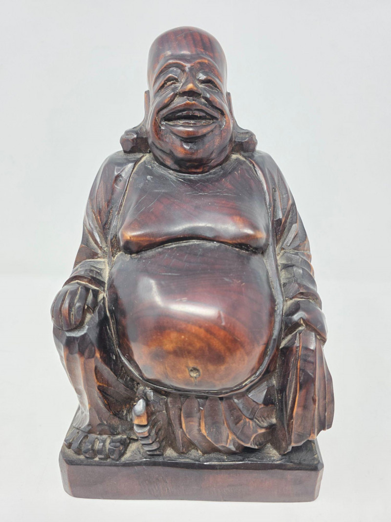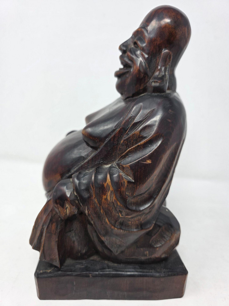 Hand-Carved Wooden Statue Of The Happy Buddha, Also Known As Budai Or Hotei This figure is a traditional symbol in Chinese and Japanese folklore, often associated with happiness, abundance, and contentment The statue is crafted from dark, polished wood, likely rosewood Portrays a jovial, seated figure with a characteristic large belly and a wide, joyful expression on a square plinth Some wear marks (see pics) 10.25"T x 6"W x 6"D