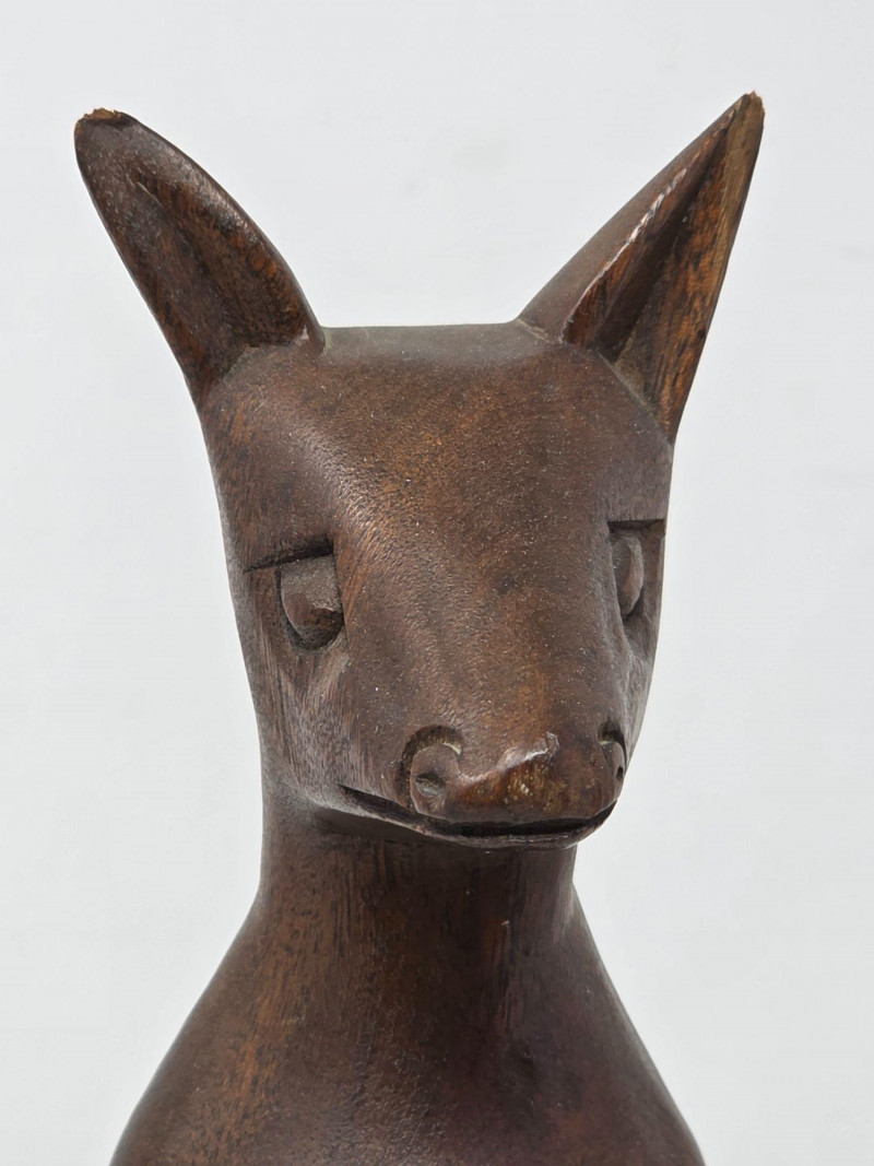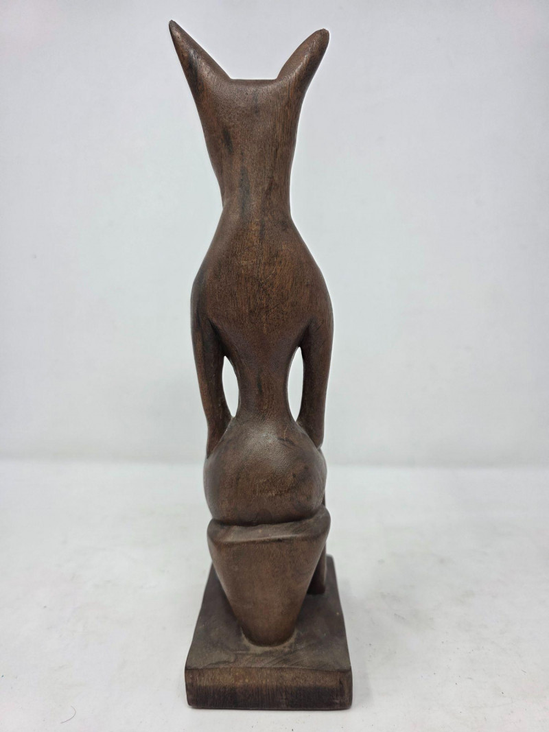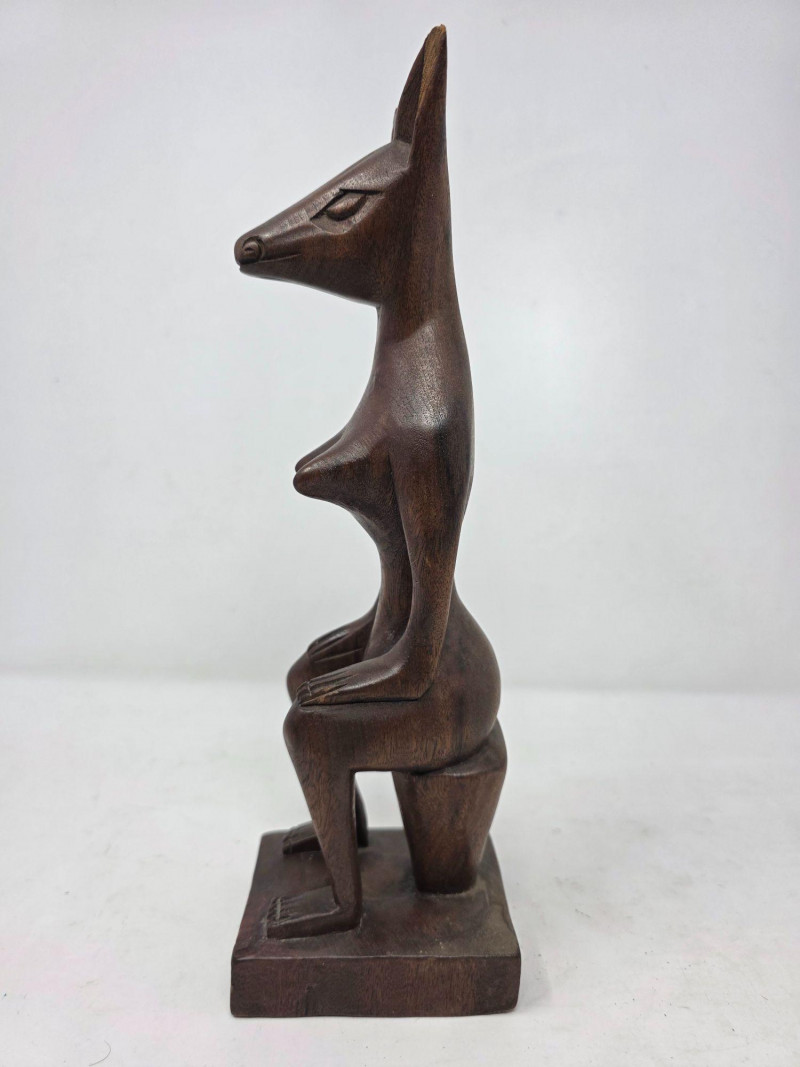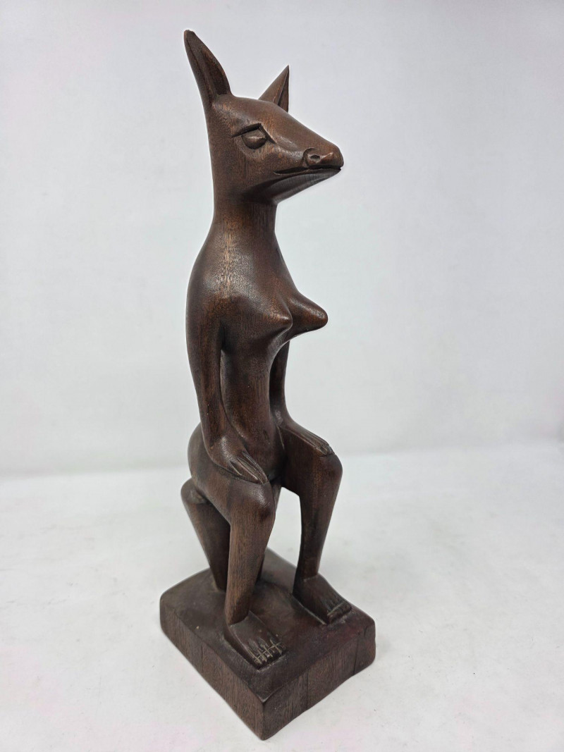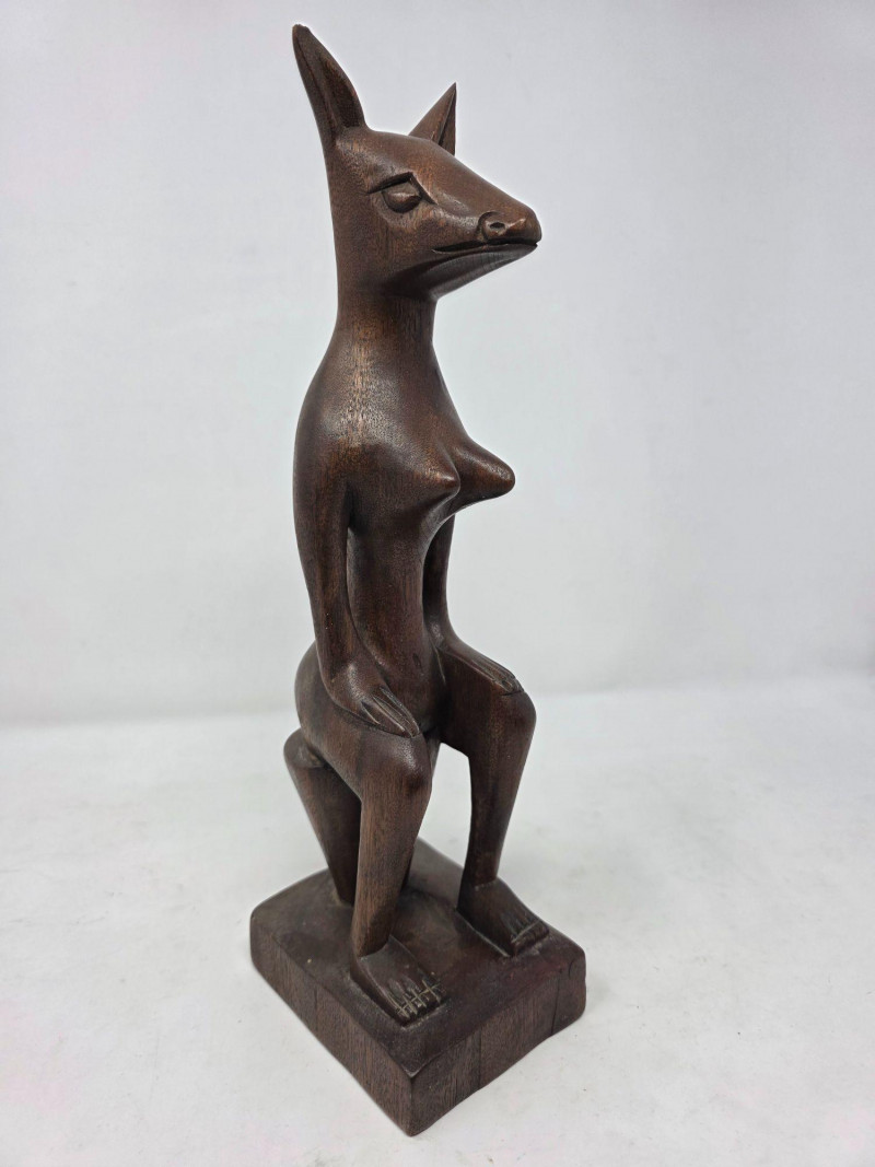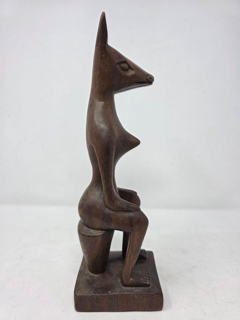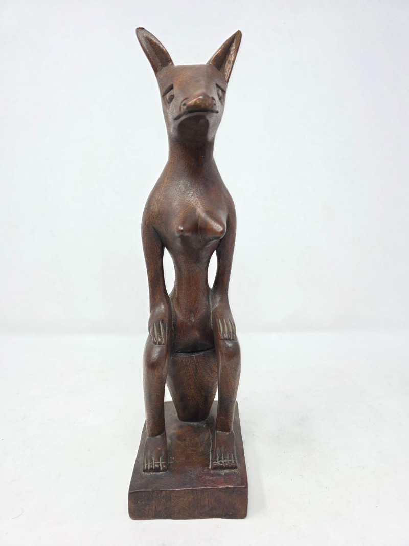 Vintage Hand-Carved African Folk Art Wooden Zoomorphic Fertility Statue Depicting a mythical animal head on human body. Similar ethnographic animist fertility figures have been recorded from regions like West Timor & Africa Some animist cultures in regions like West Timor carve these "Dukun" (shaman) statues for fertility or as guardian figures to protect families Some wear marks (see pics) 12.5"T x 3"W x 4"D