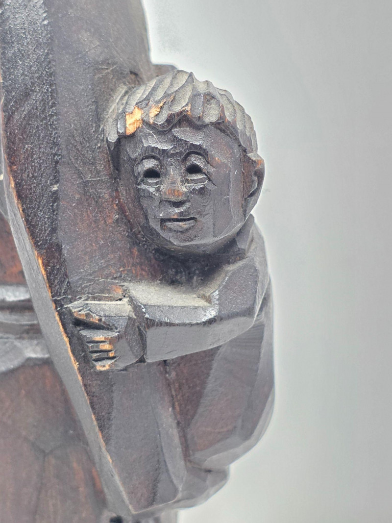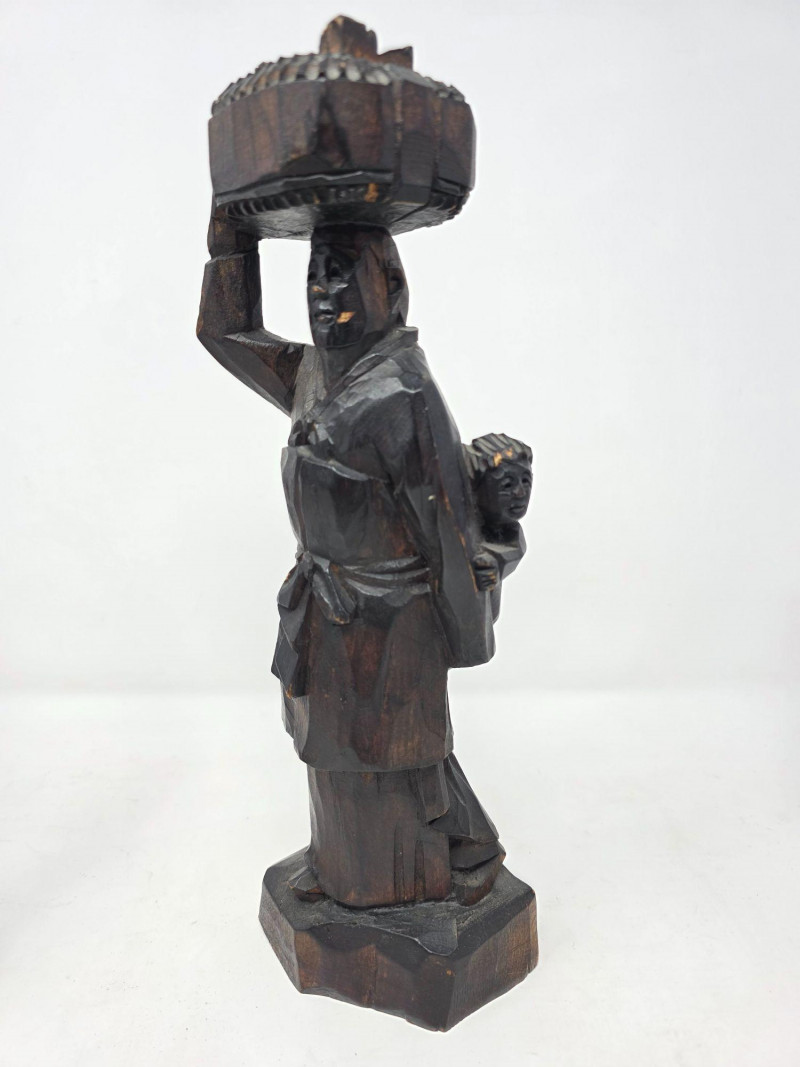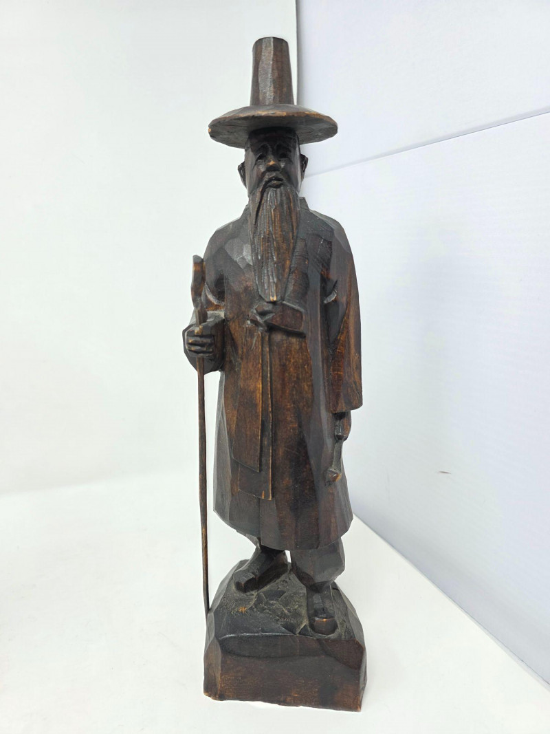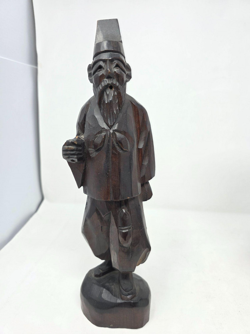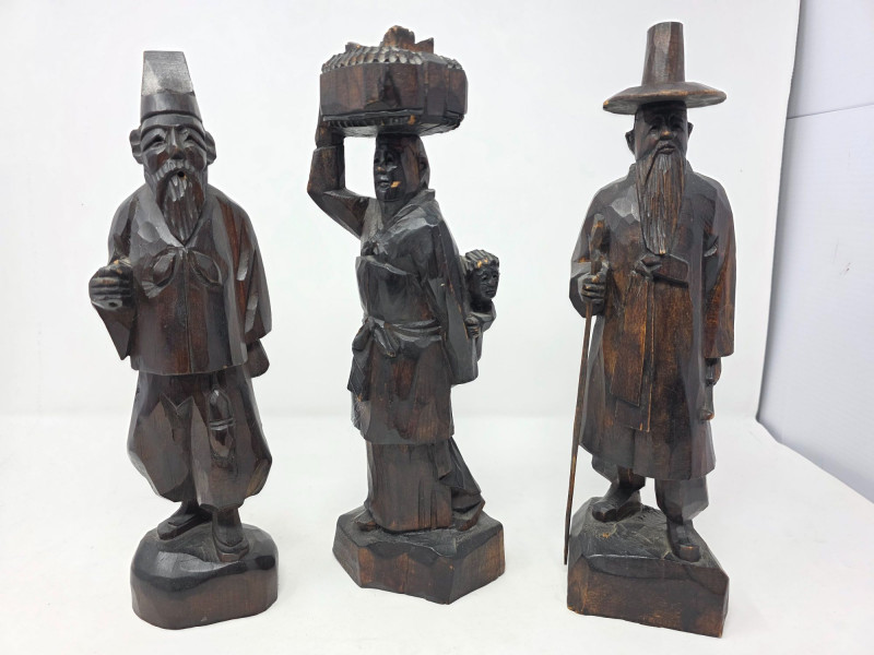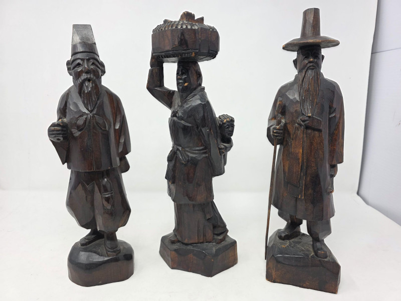 Set Of Three Vintage Hand-Carved Wooden Chinese Figurines Vintage, hand-carved wooden Asian figurines often depict traditional figures such as farmers, villagers, or wise men Made of wood with a dark stain and sold as sets of decorative sculptures Some wear marks (see pics) 12.5"T x 3.5"W x 3"D