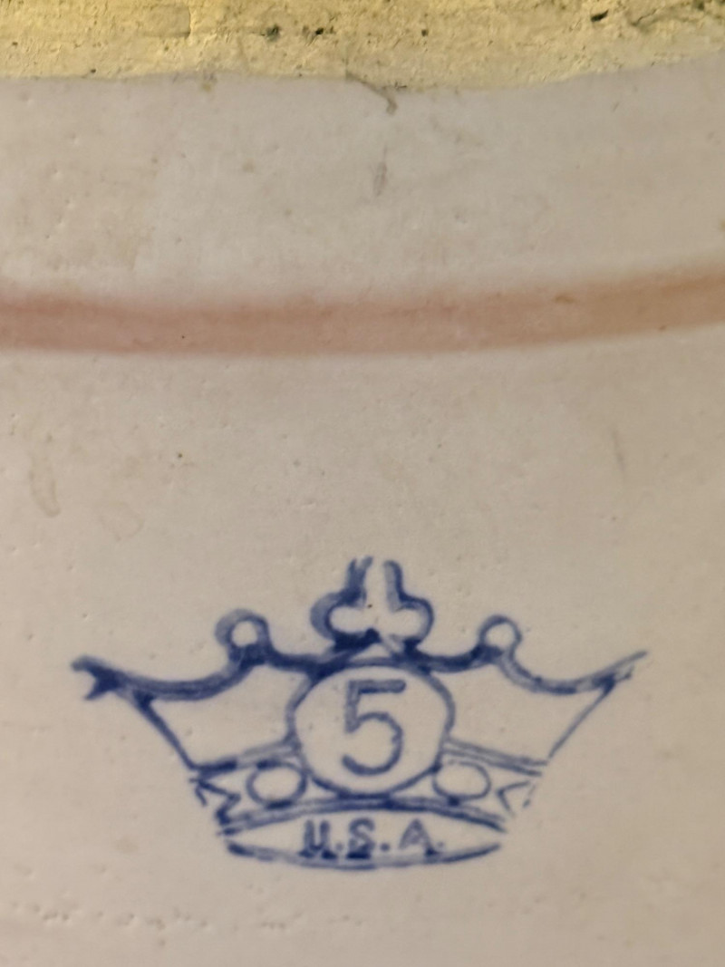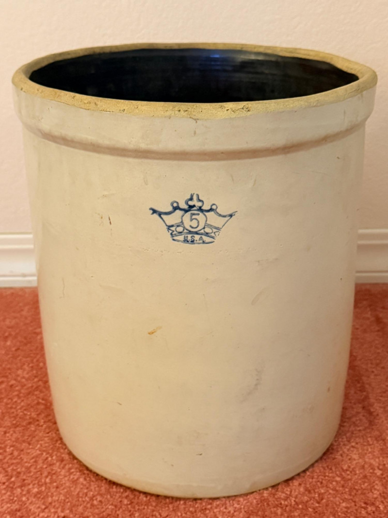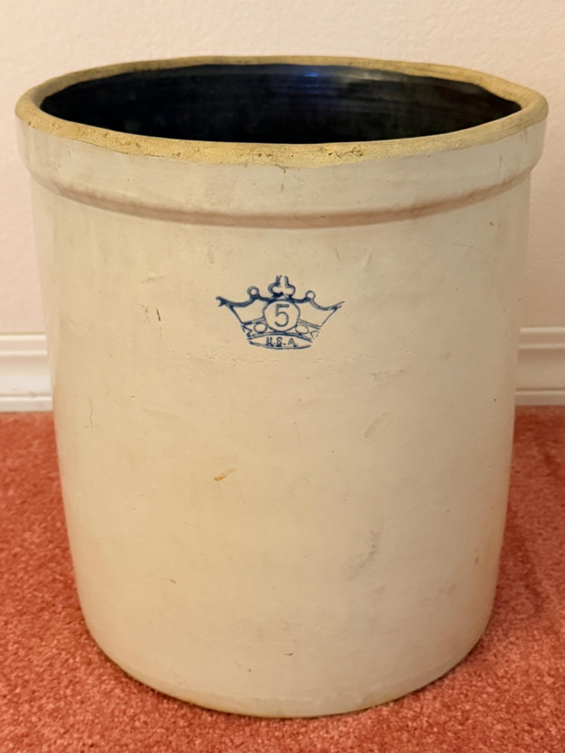 Vintage Robinson Ransbottom 5-gallon stoneware crock, recognized by its signature cobalt blue crown hallmark featuring the number 5. Manufactured by the Robinson Ransbottom Pottery Company of Roseville, Ohio.