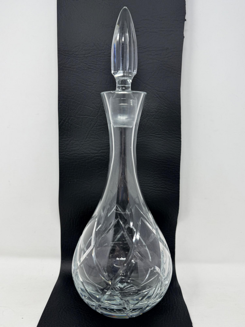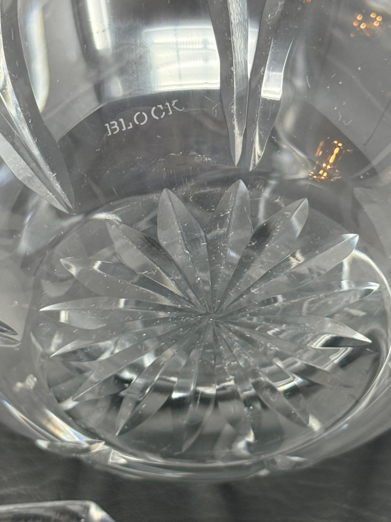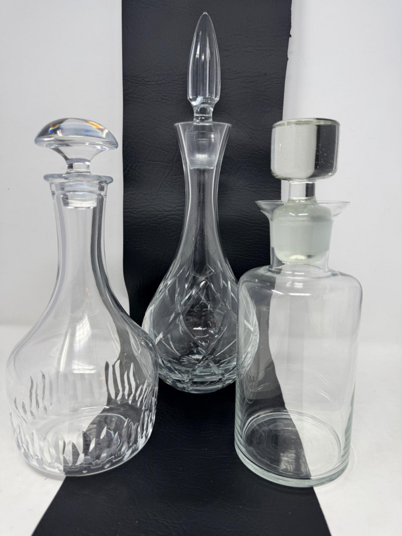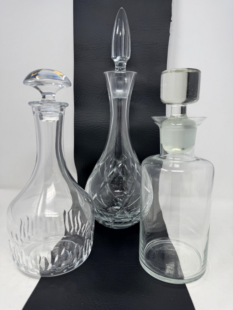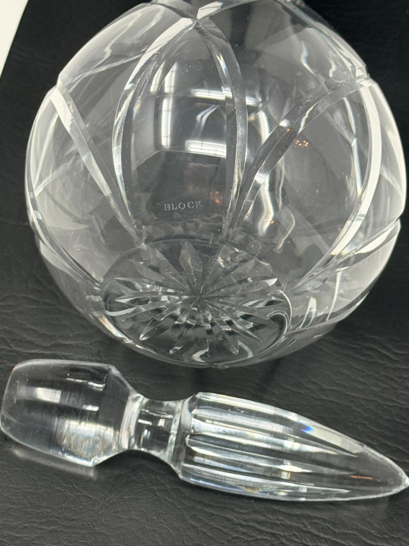 Block Crystal Decanter & Glass Decanters (3) Block cut lead crystal bulb decanter featuring a signature geometric pattern and a matching faceted stopper. Cut geometric or "X" pattern. Small chip on decanter edge. 5.5”x15.5” (2) Glass decanters 5”x11” and 4”x11”