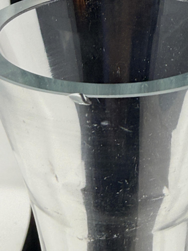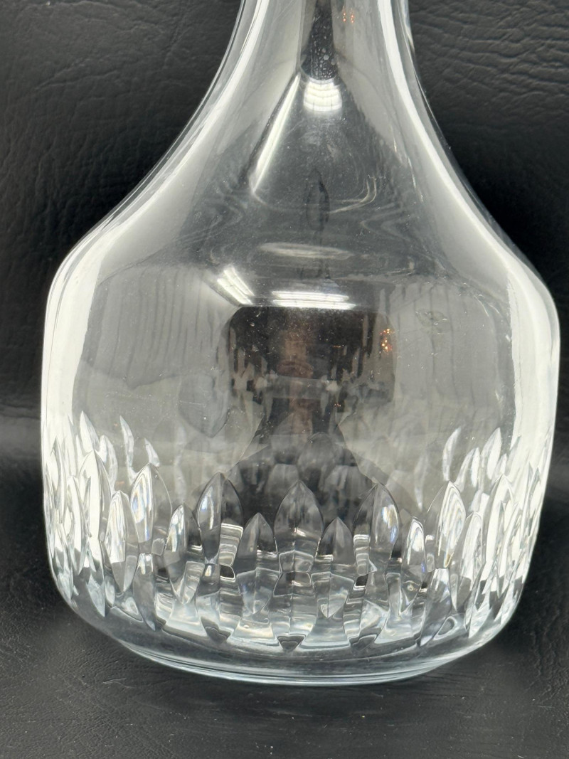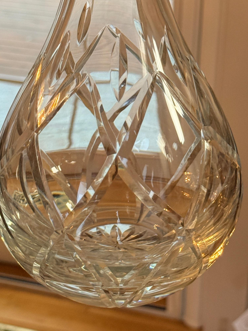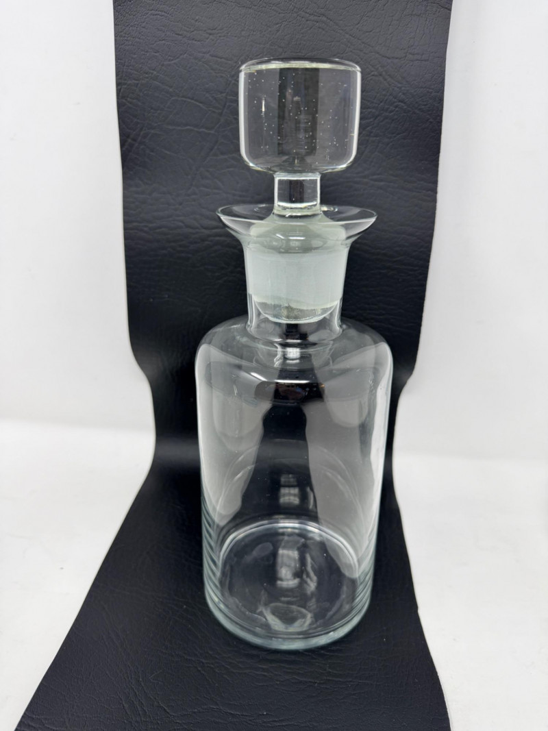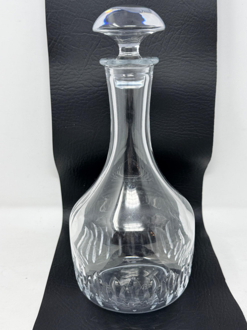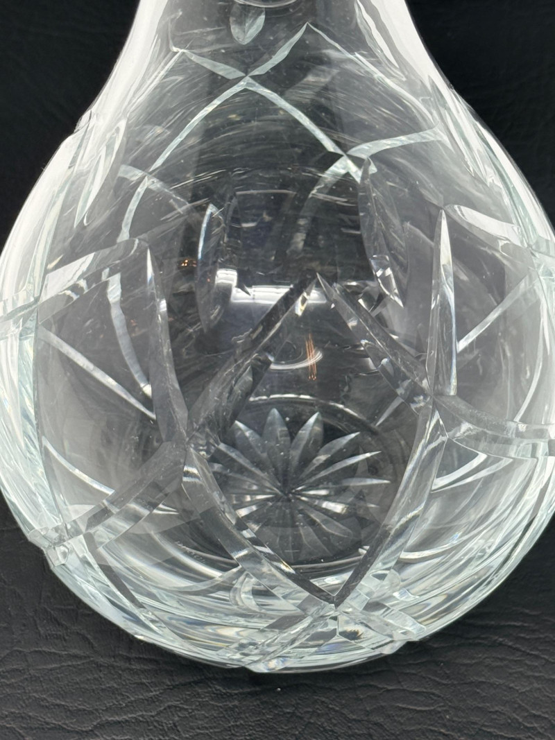 Block Crystal Decanter & Glass Decanters (3) Block cut lead crystal bulb decanter featuring a signature geometric pattern and a matching faceted stopper. Cut geometric or "X" pattern. Small chip on decanter edge. 5.5”x15.5” (2) Glass decanters 5”x11” and 4”x11”