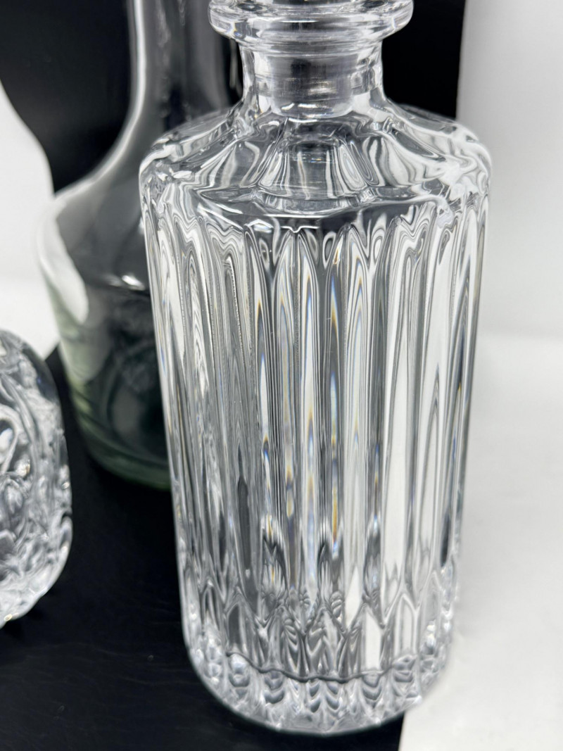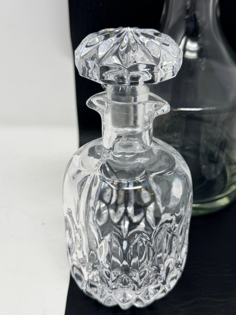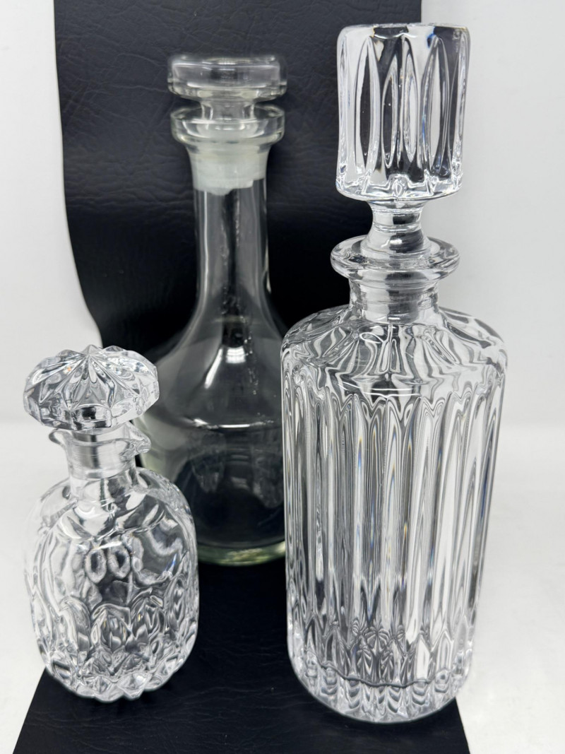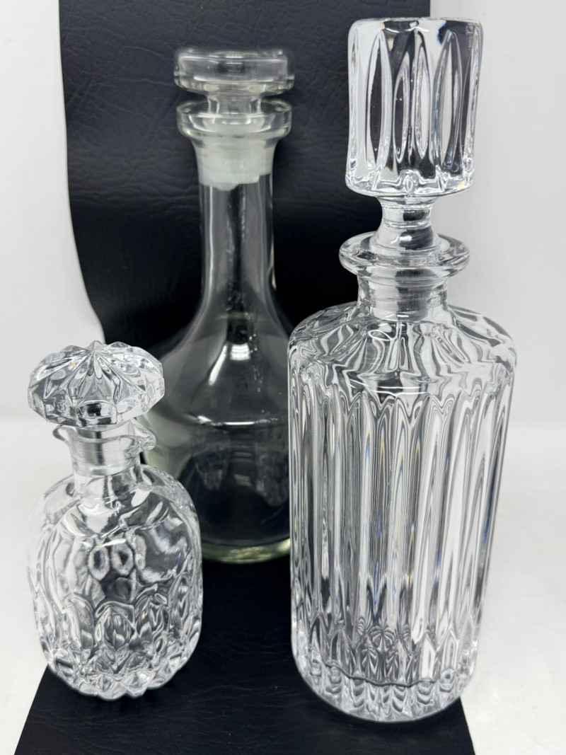 (3) Crystal and Glass Decanters Clear glass is 5”x10.5” Small crystal decanter with double side pour spout is 3”x6.5”.