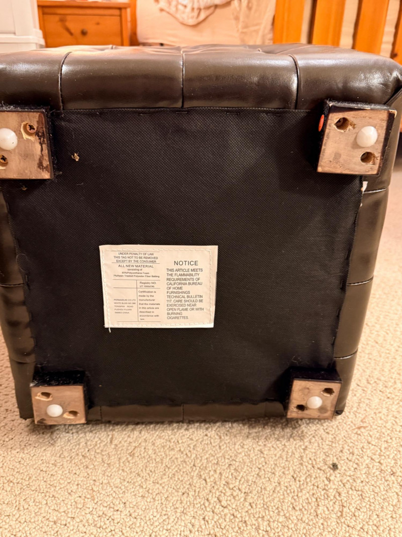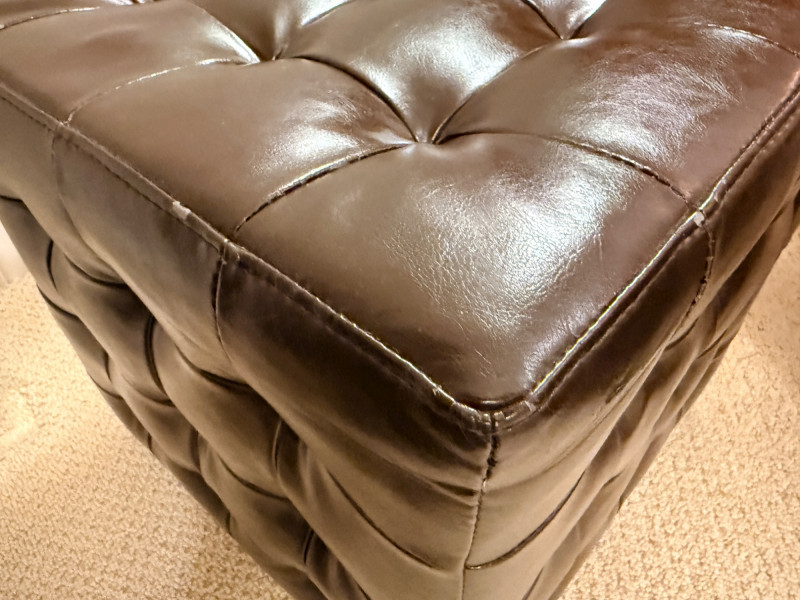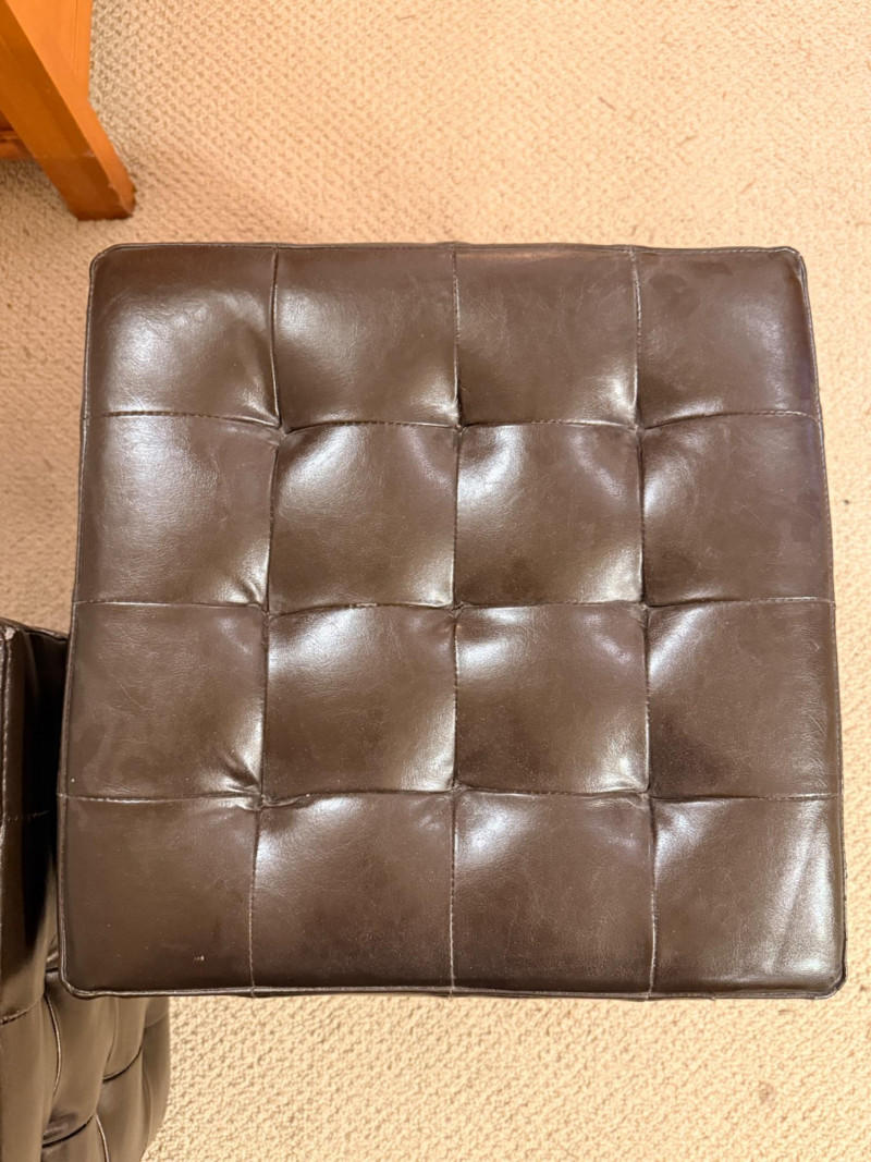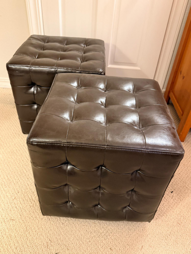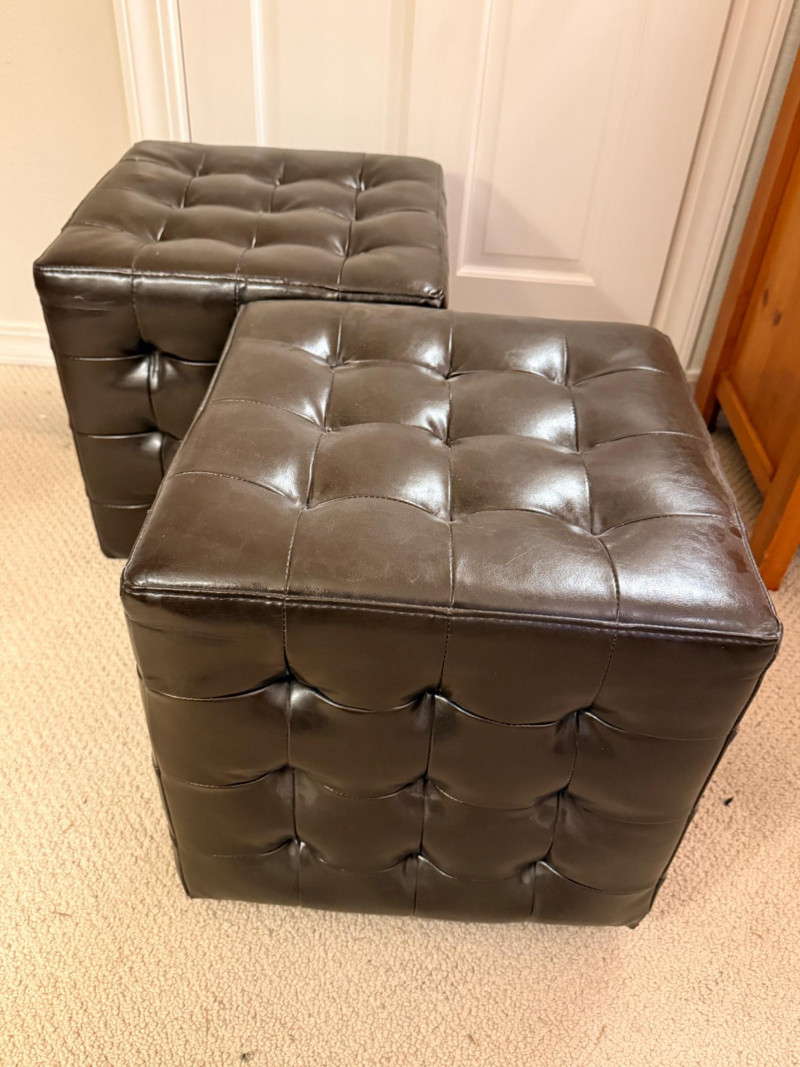 2) Faux Leather Cube Ottomans 18”x17”x17” One has minor damage. See pics. Solid cube for extra seating as well.