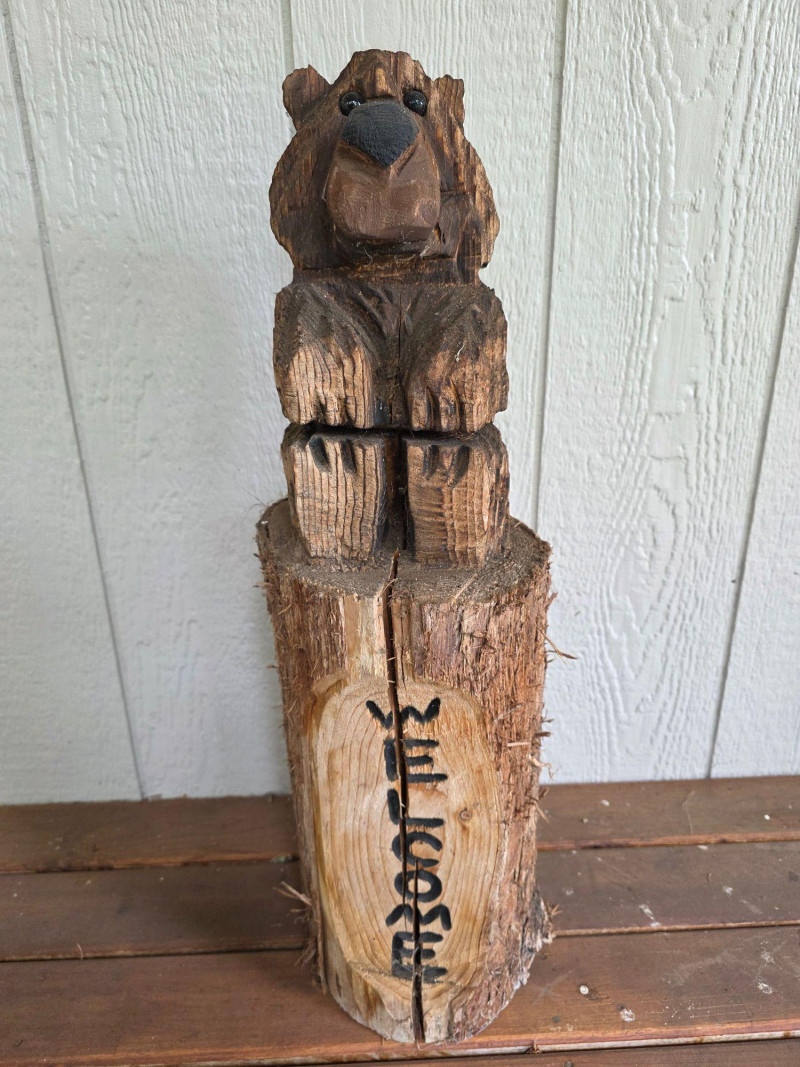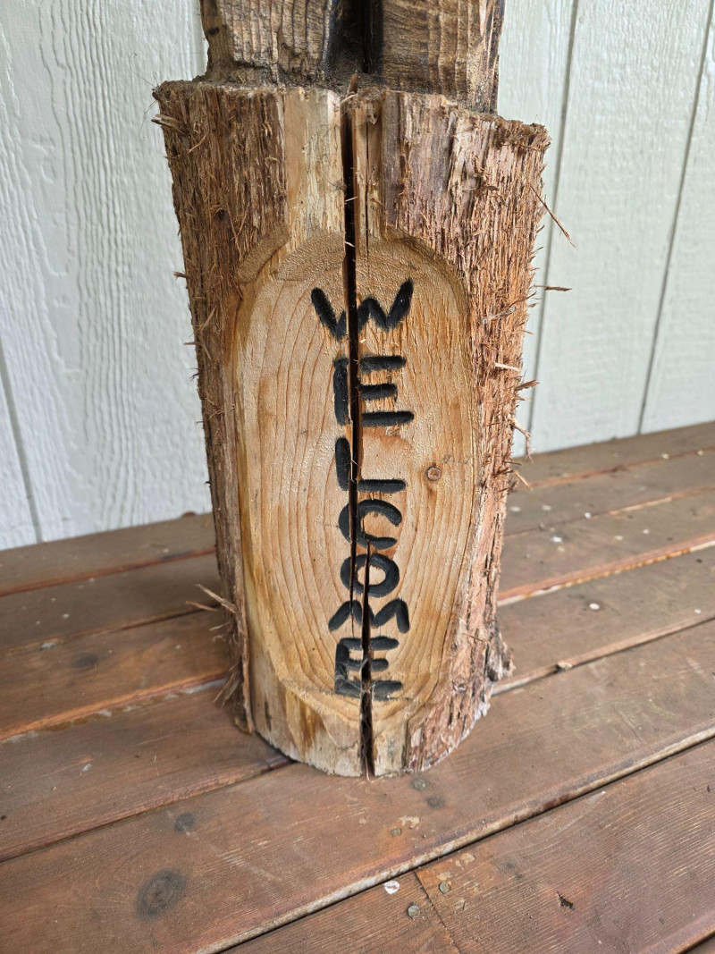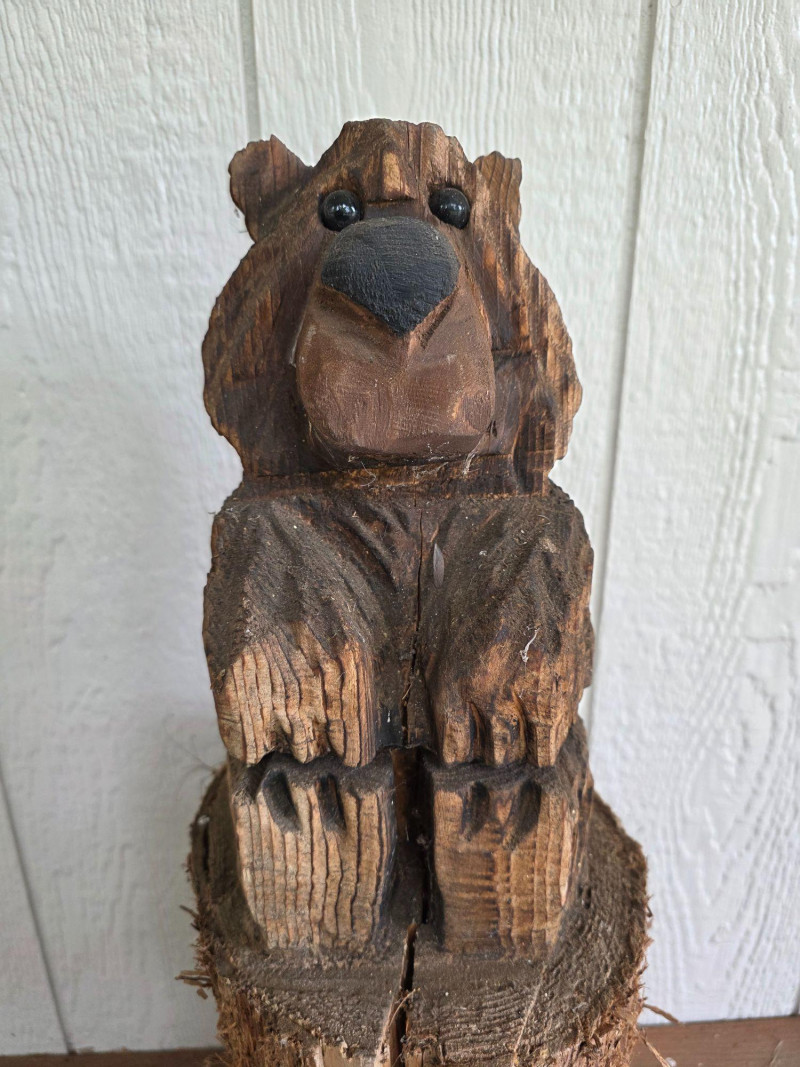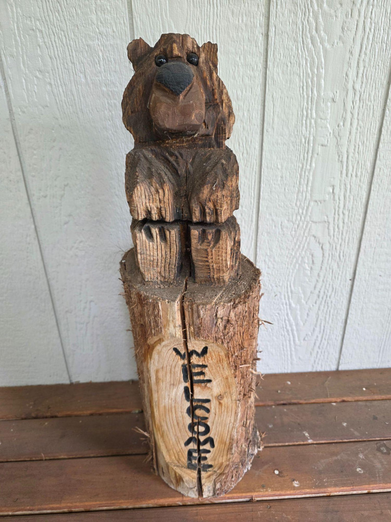 Chainsaw-Carved Wooden Bear Sculpture With "Welcome" Carved In The Base A rustic outdoor or cabin-style decor piece, often referred to as a "stump carving" or "bear totem" Glass-marble eyes are intact! Some cracking on wood (see pics) 25.5"T x 8"W