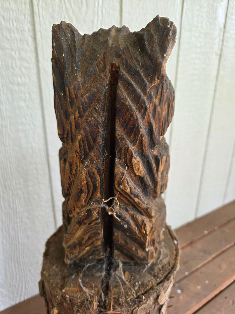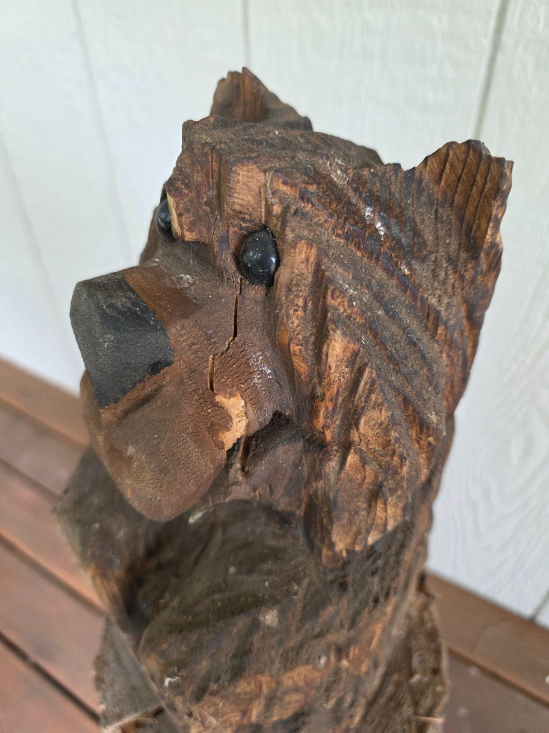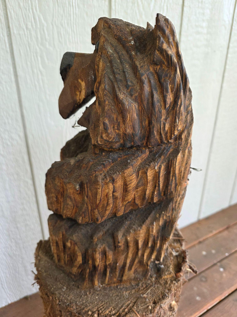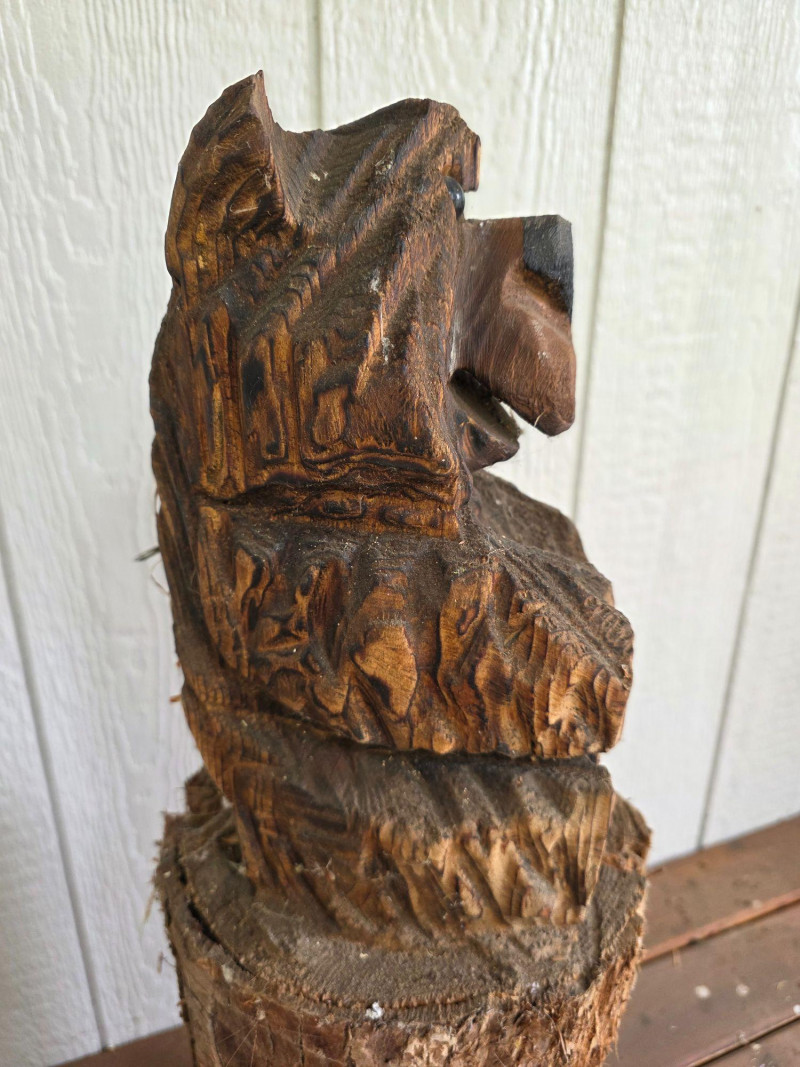 Chainsaw-Carved Wooden Bear Sculpture With "Welcome" Carved In The Base A rustic outdoor or cabin-style decor piece, often referred to as a "stump carving" or "bear totem" Glass-marble eyes are intact! Some cracking on wood (see pics) 25.5"T x 8"W