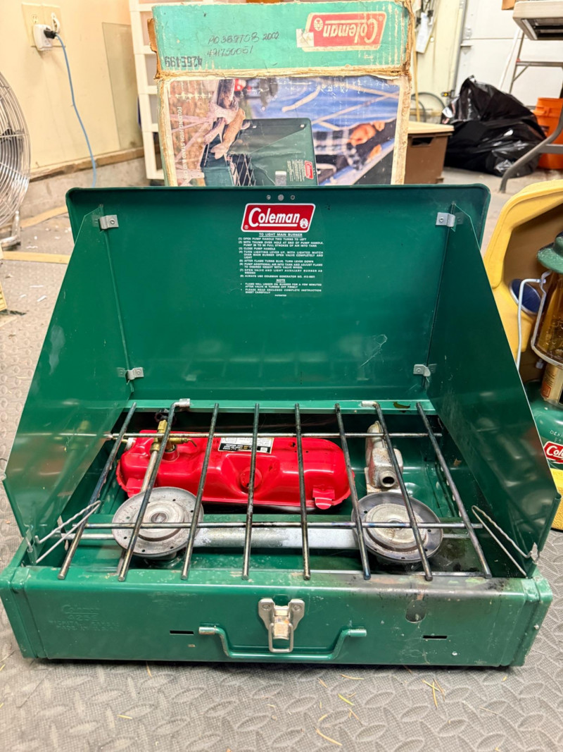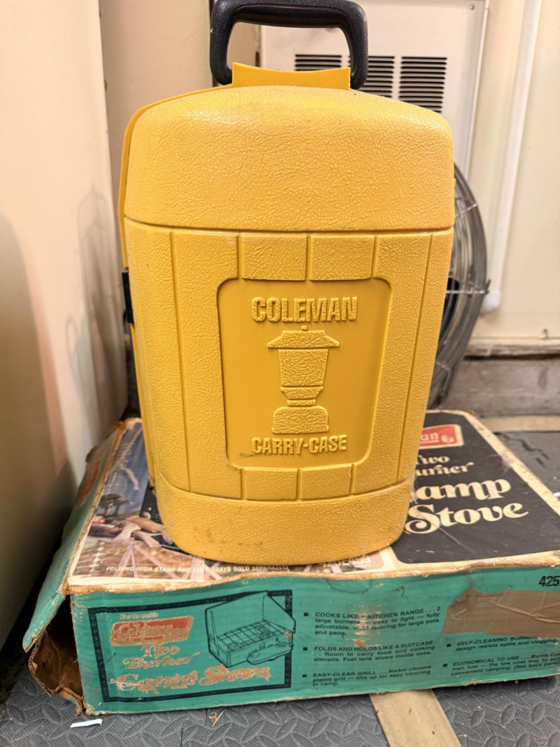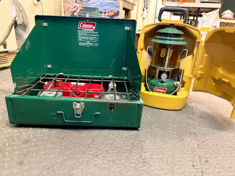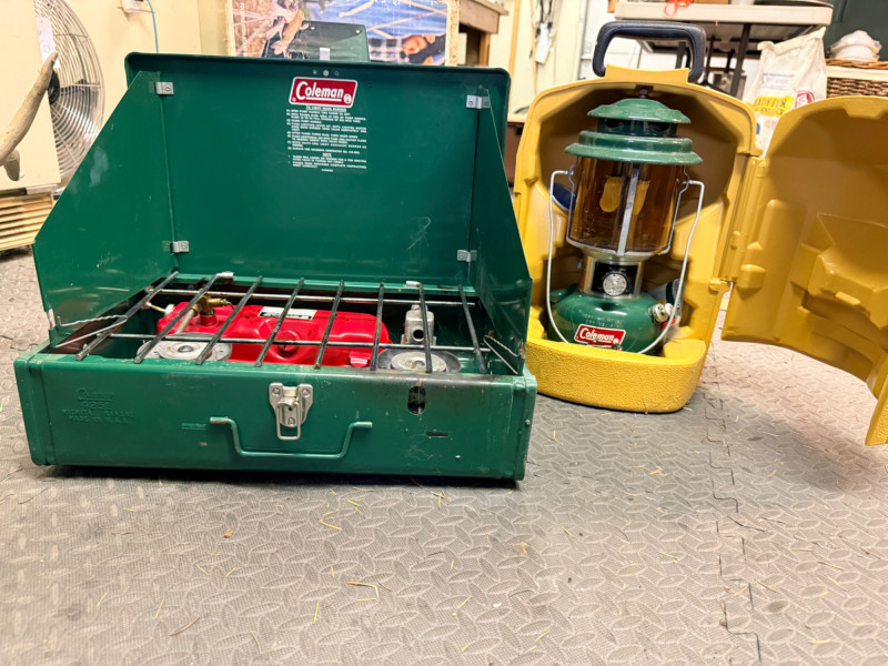 Coleman 2 Burner Camp Stove and Lantern 2 burner camp stove and lantern with plastic carry case.