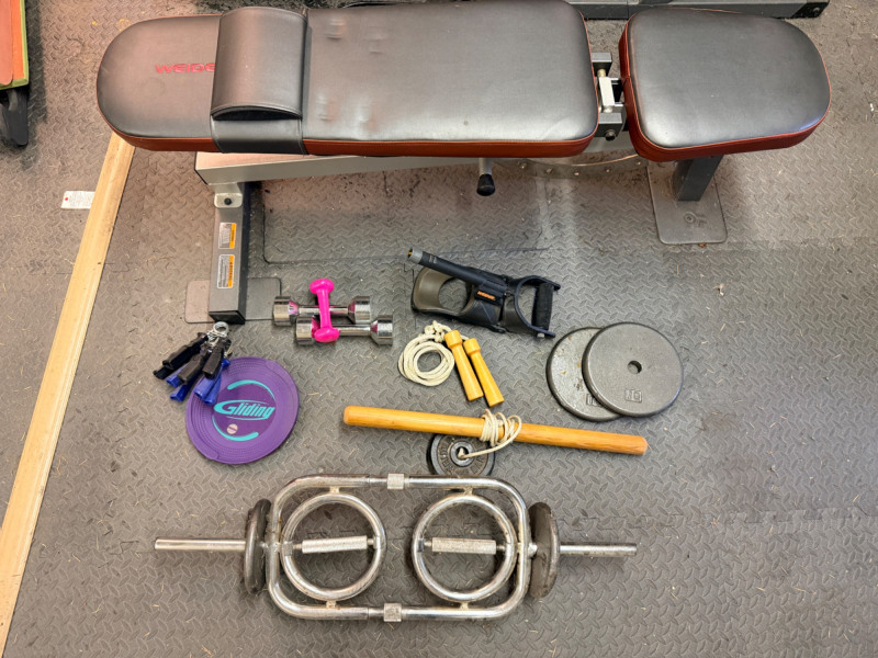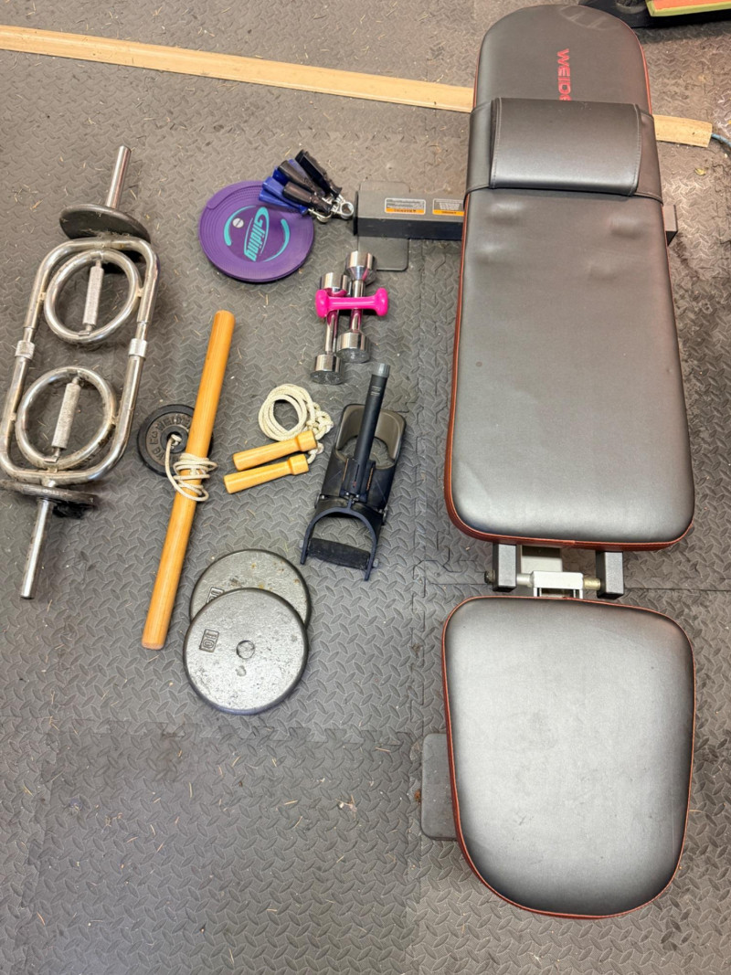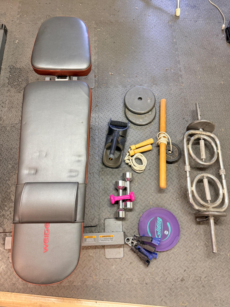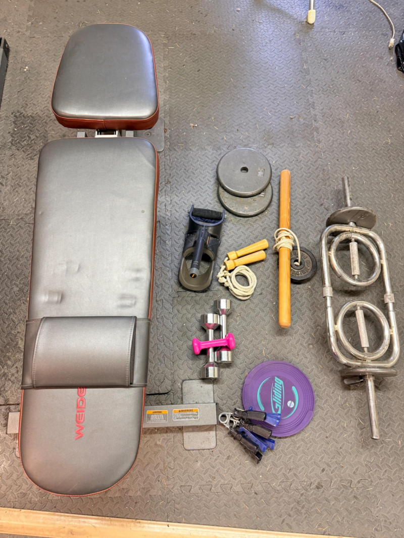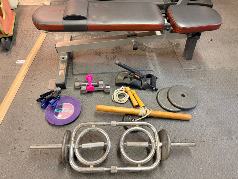 Weider Work Out Bench, Weights and Accessories Weider Adjustable bench is 24”x 50”x16” (2) 5lb weights 1lb weight Gliding discs Wood handled jumprope (4) Hand exercisers