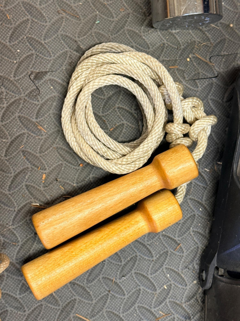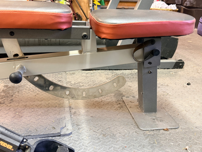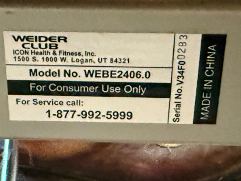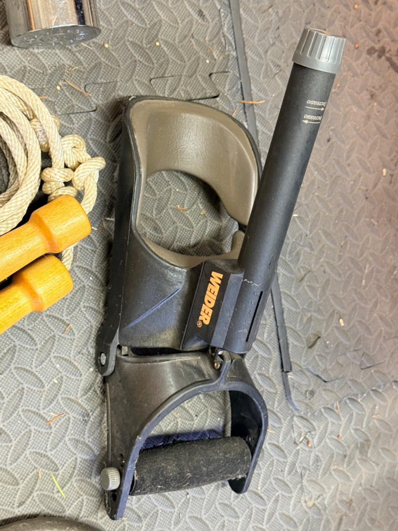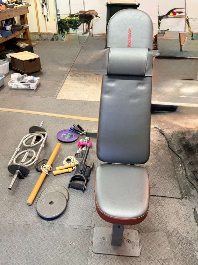 Weider Work Out Bench, Weights and Accessories Weider Adjustable bench is 24”x 50”x16” (2) 5lb weights 1lb weight Gliding discs Wood handled jumprope (4) Hand exercisers