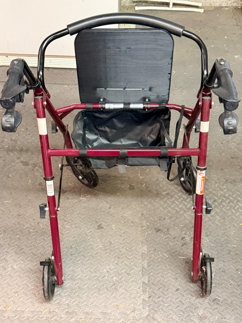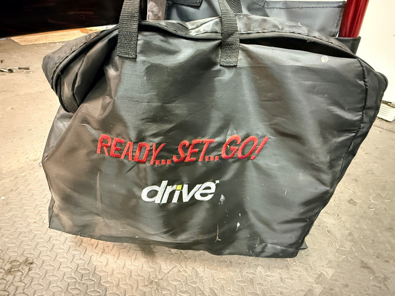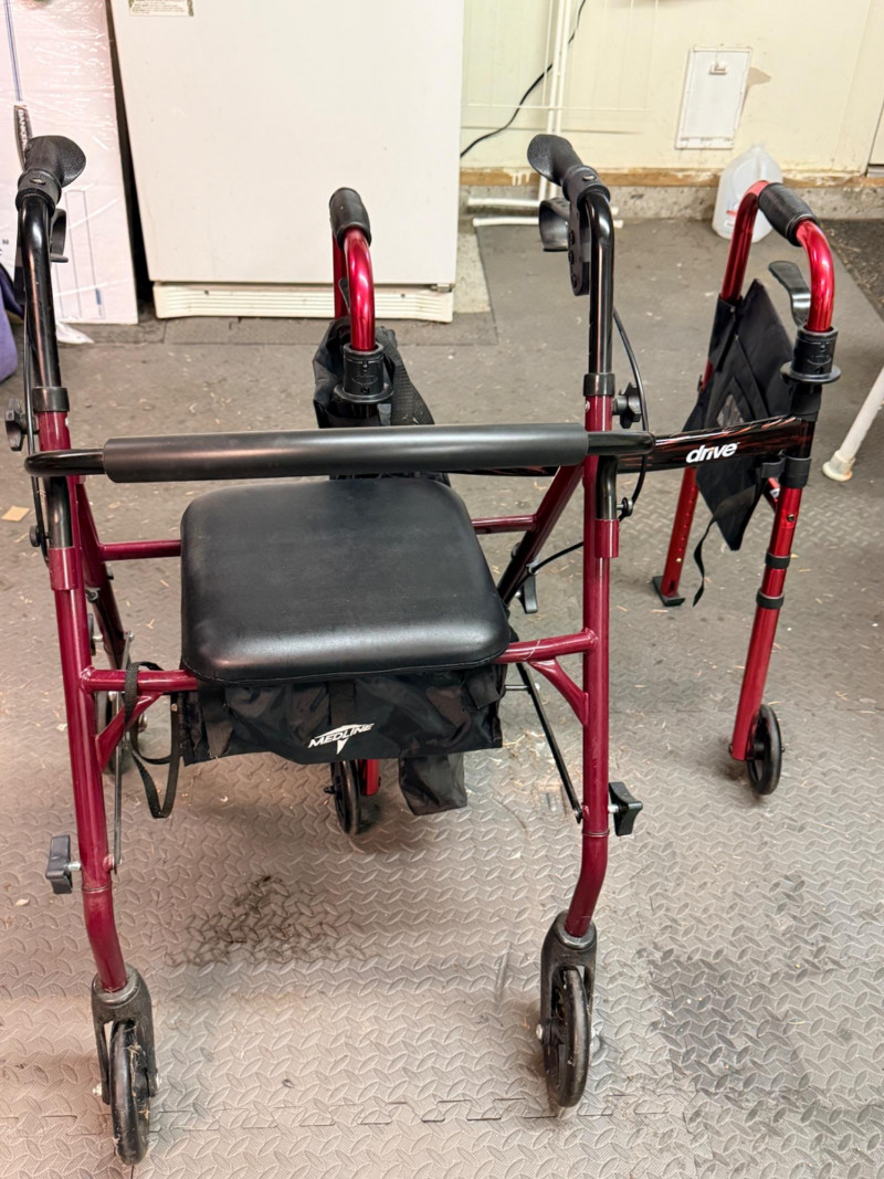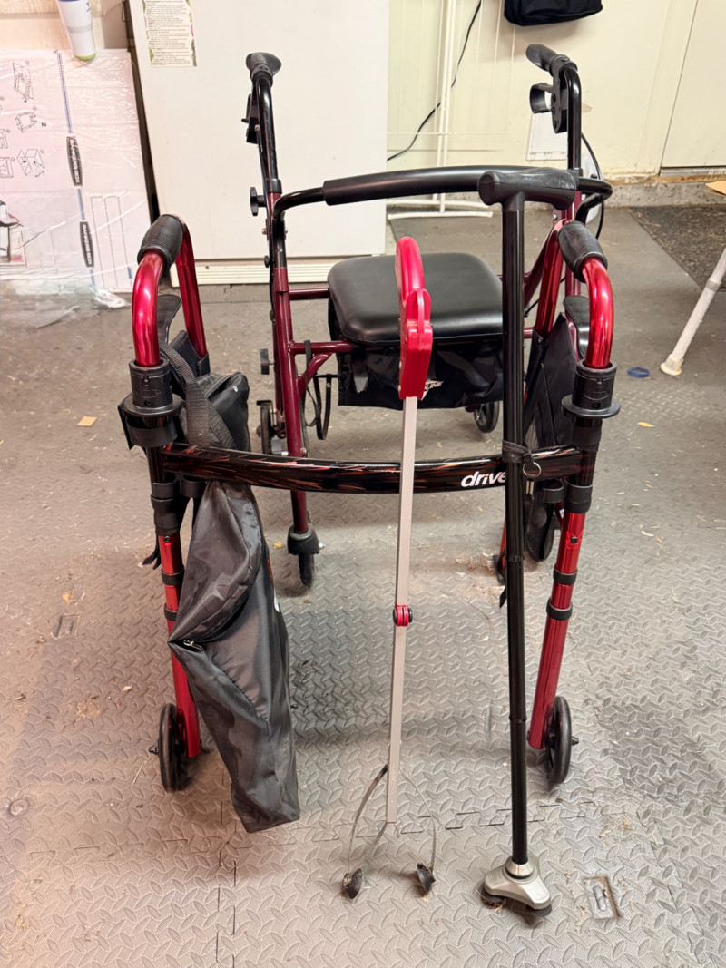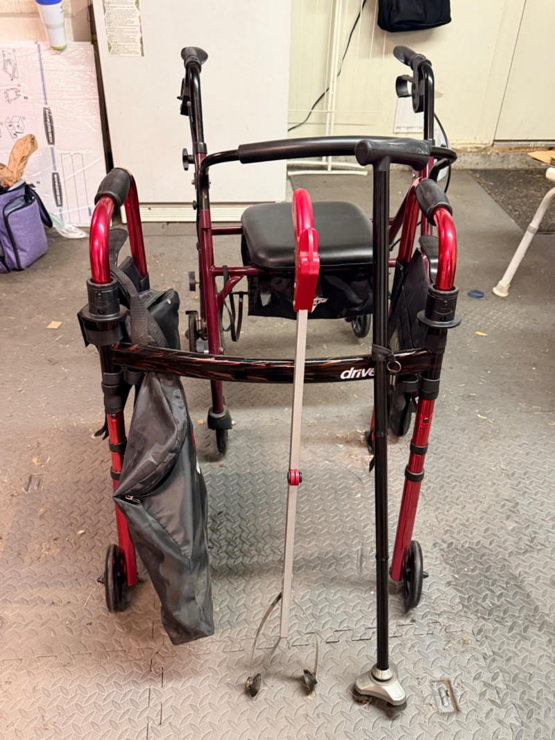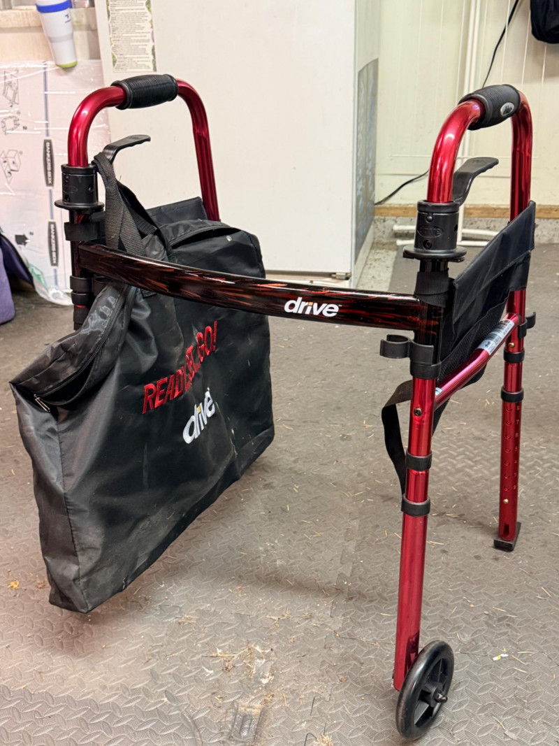 drive Flat Folding Walker, Walker With Seat, Grabbers & Hurri-Cane Flat folding walker with travel case, height adjustable, 2 front wheels and back glides.
