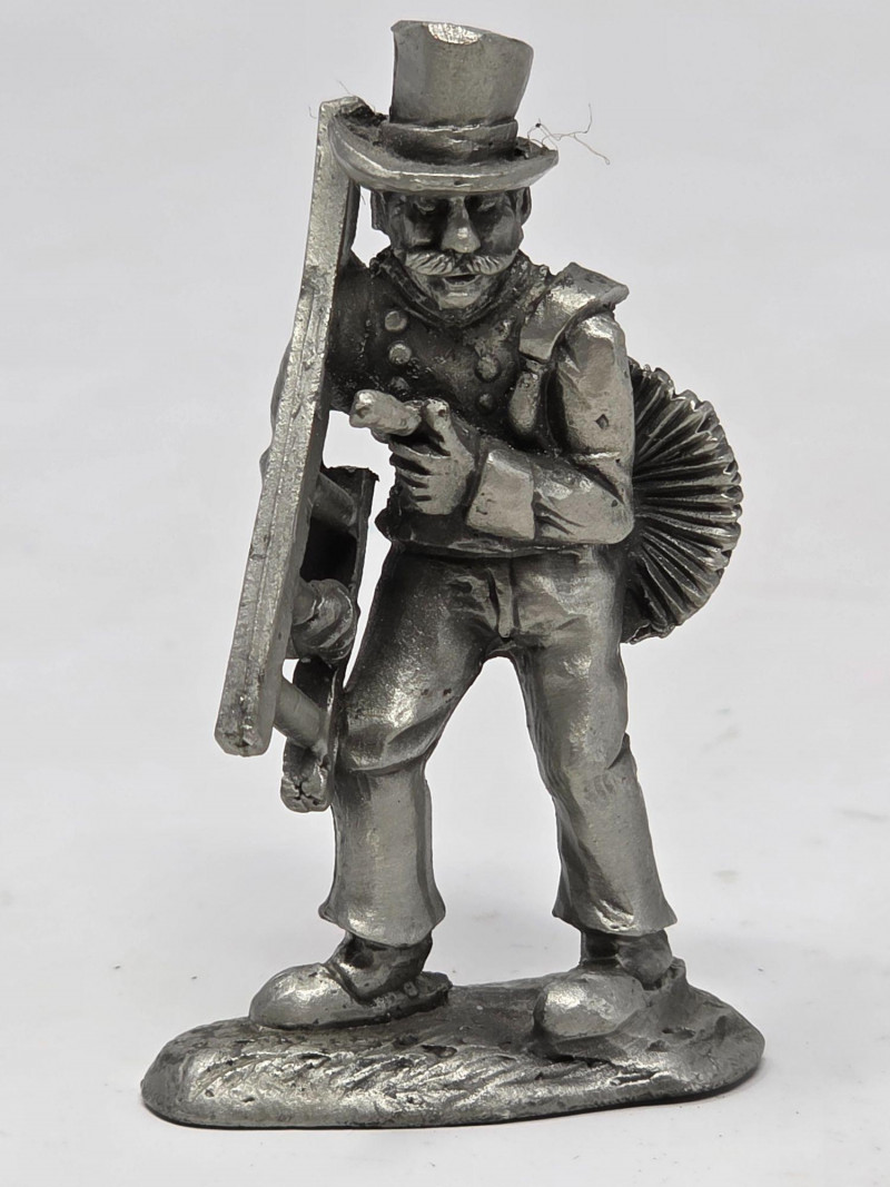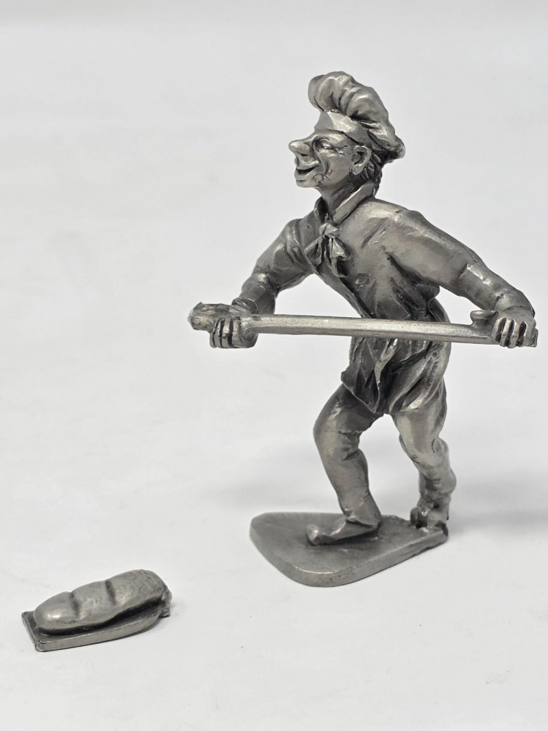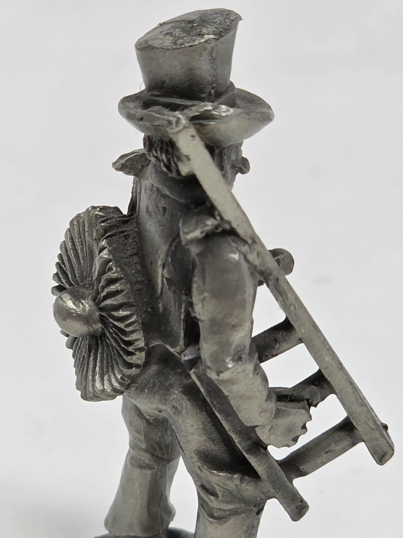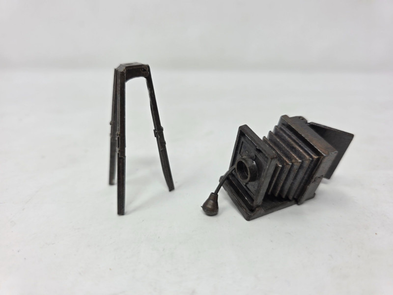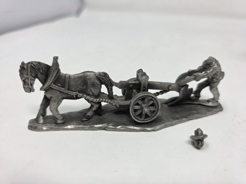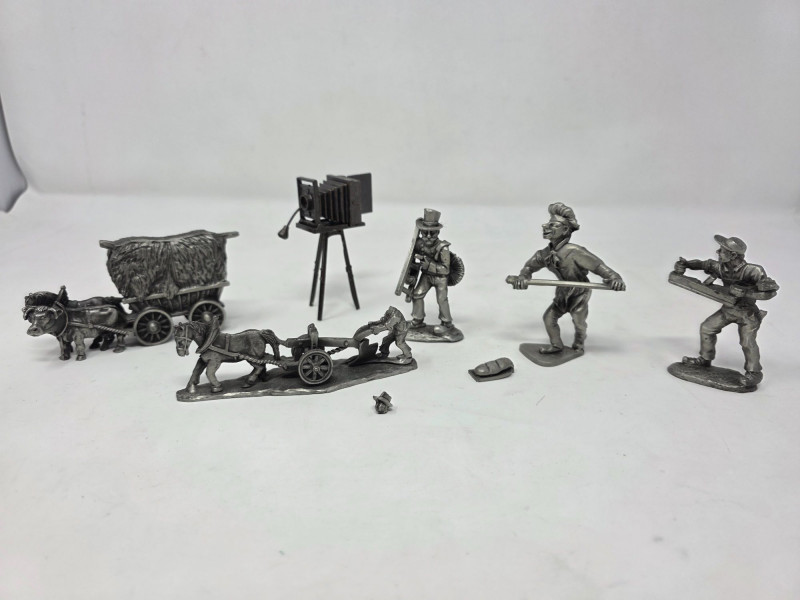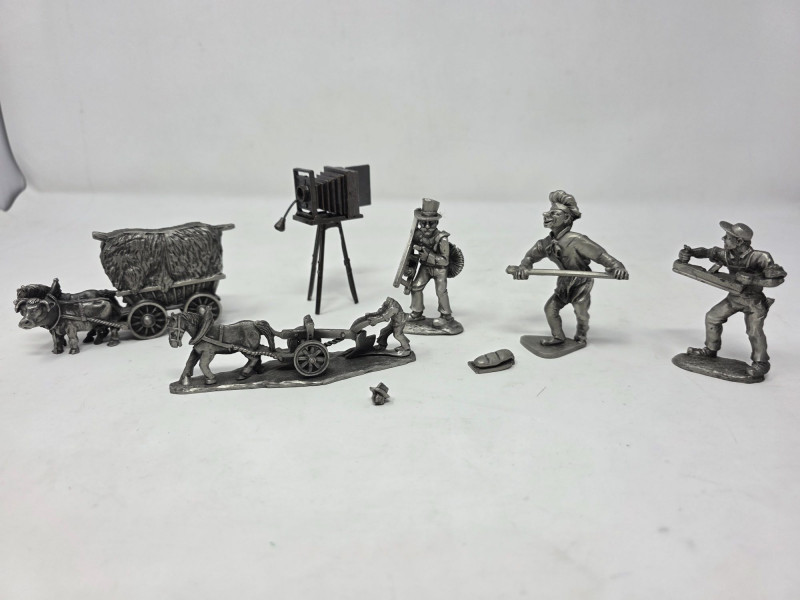 (5) Pewter Figurines & (1) Die-Cast Metal Miniature Pewter hay cart with horse and oxen pulling it. 2”x4.5”x1” Broken pewter horse pulling a plow with man. Head is broken off. 1.5”x4”x1” Pewter chimney sweep with broken ladder. 2.75”x1.5”x.75” Pewter baker with broken bread board. 3”x2”x2” Pewter man working with a planer. 2.5”x1.75”x1” Die-cast dollhouse camera. 3”x2”x1” 6 figurines total!