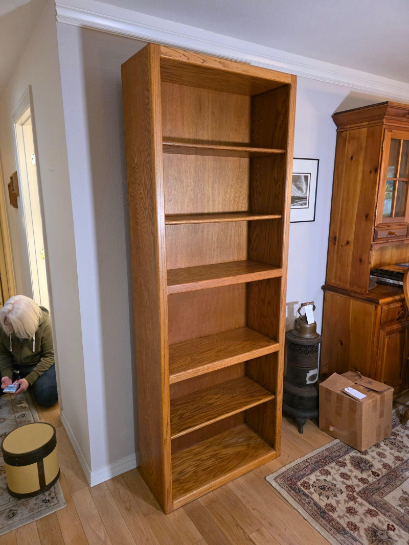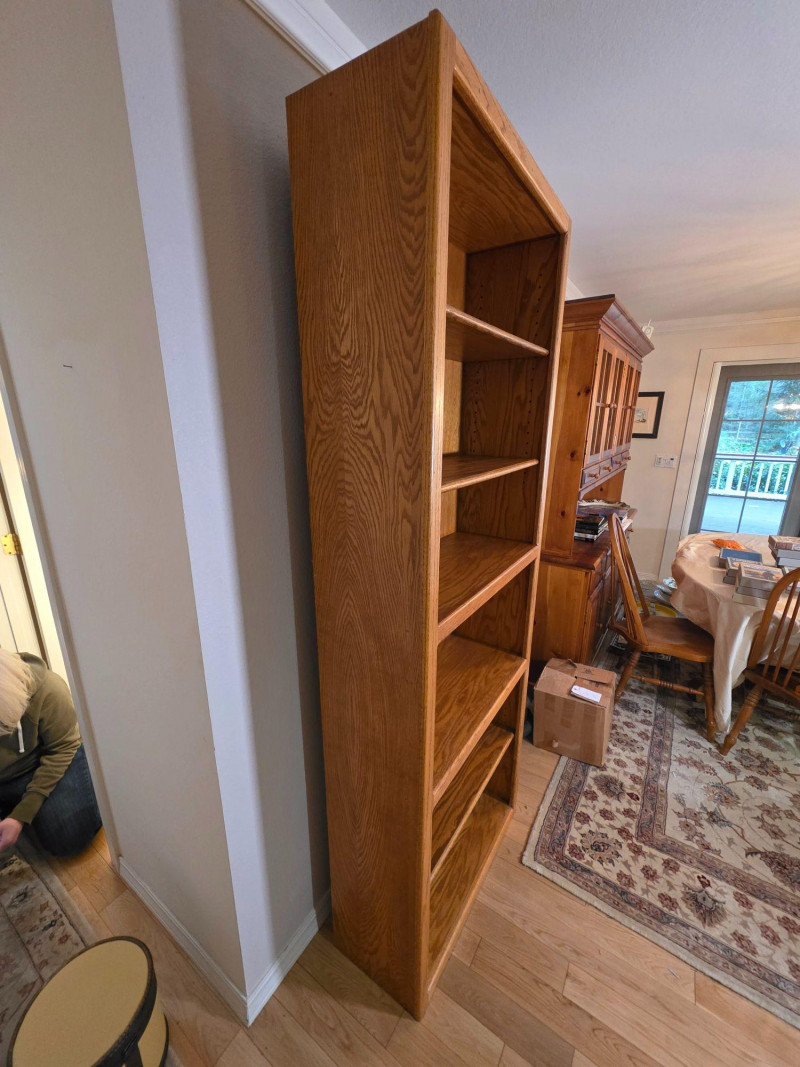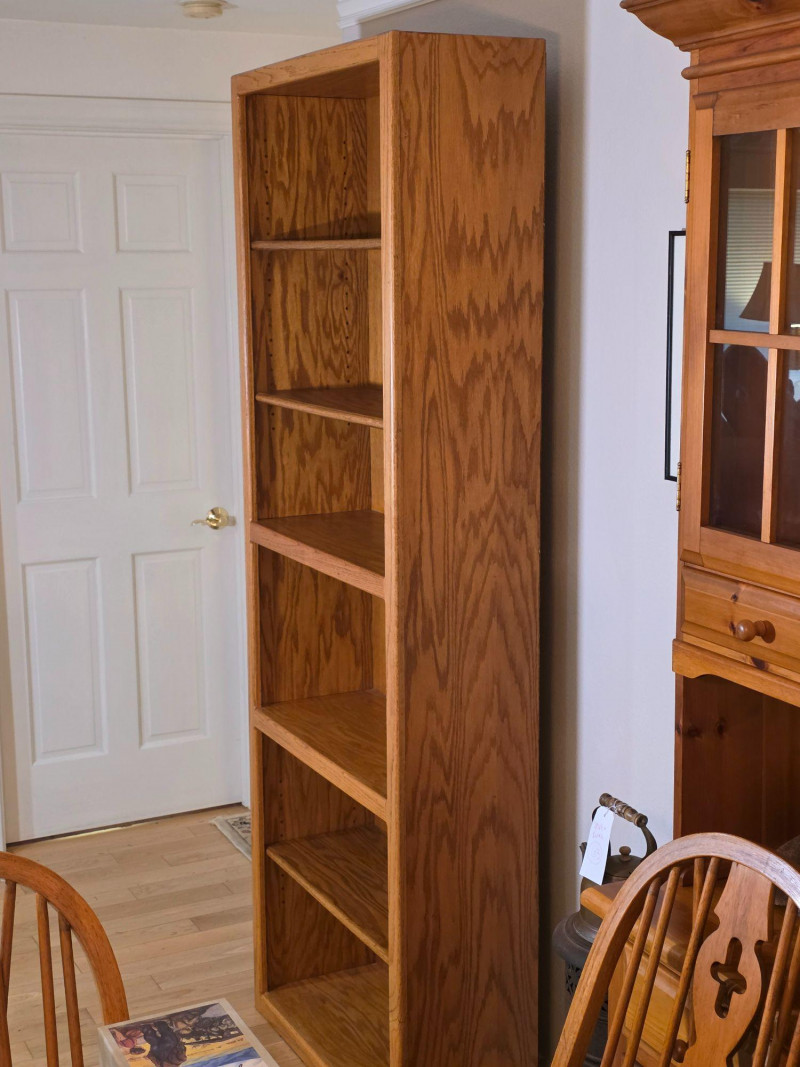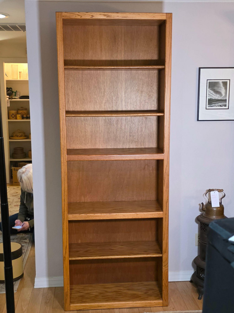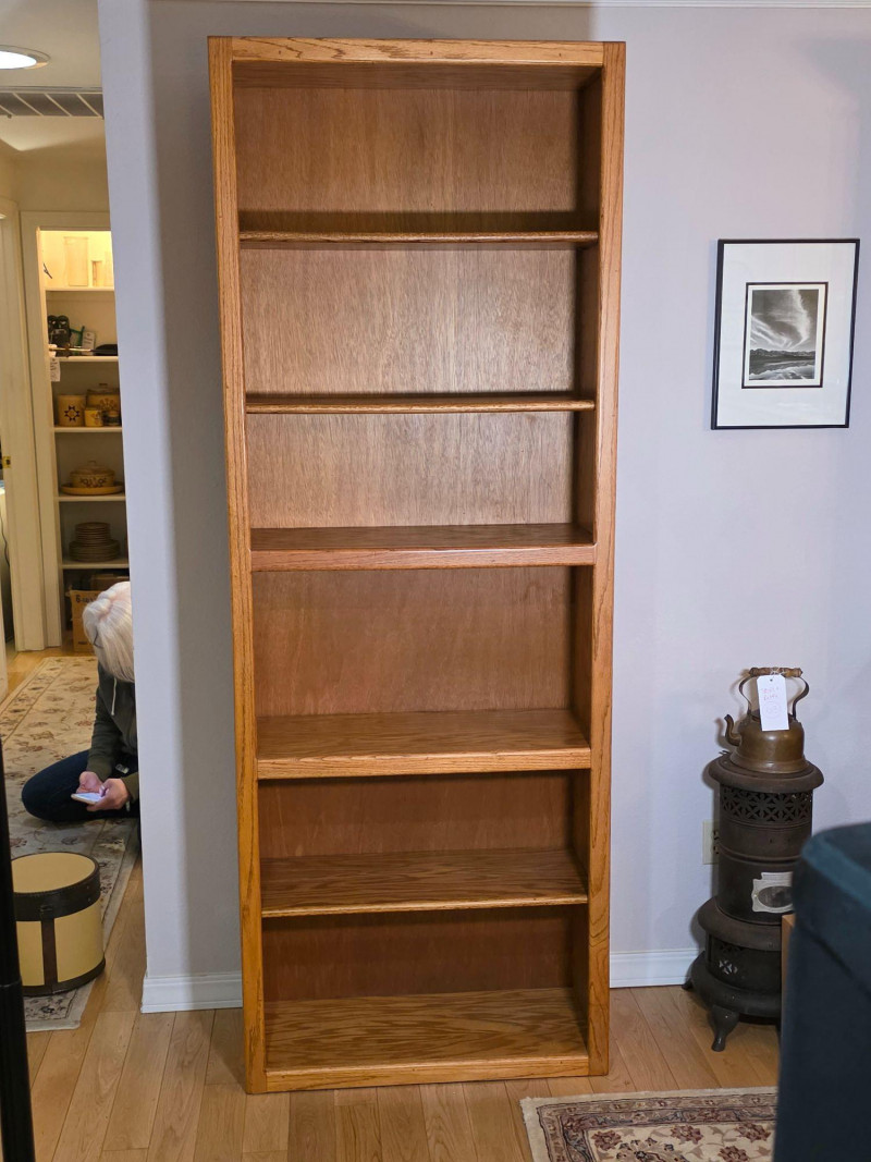 Traditional-Style Solid Oak Bookcase It has five open shelf levels and a simple, clean design. Two fixed shelves in the middle. Three adjustable shelves to accommodate different book sizes. 81”Tx30”Wx12”D