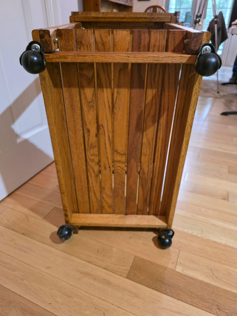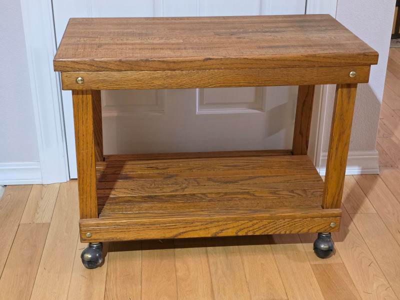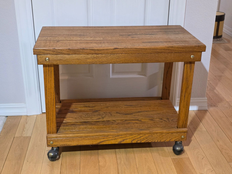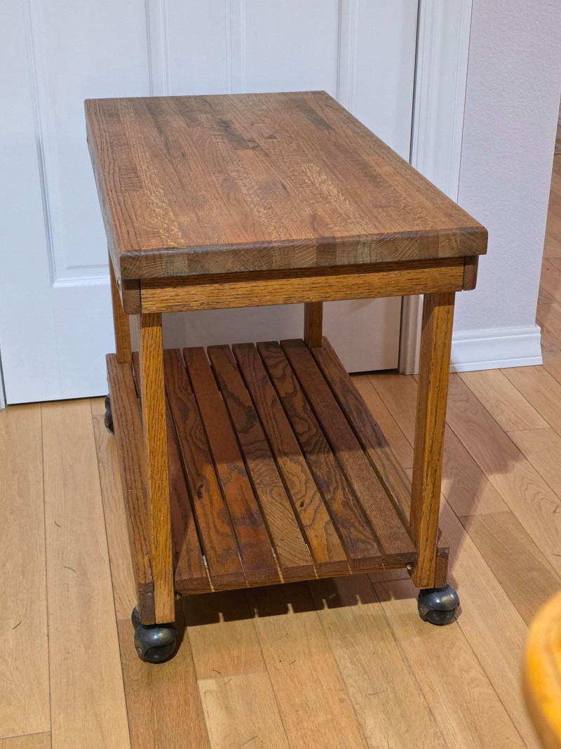 Handmade Oak Butcher Block Serving Cart One inch thick butcher block top. Slatted shelf on castor wheels. Well made in good condition. 22.5”Tx30”Wx16”D