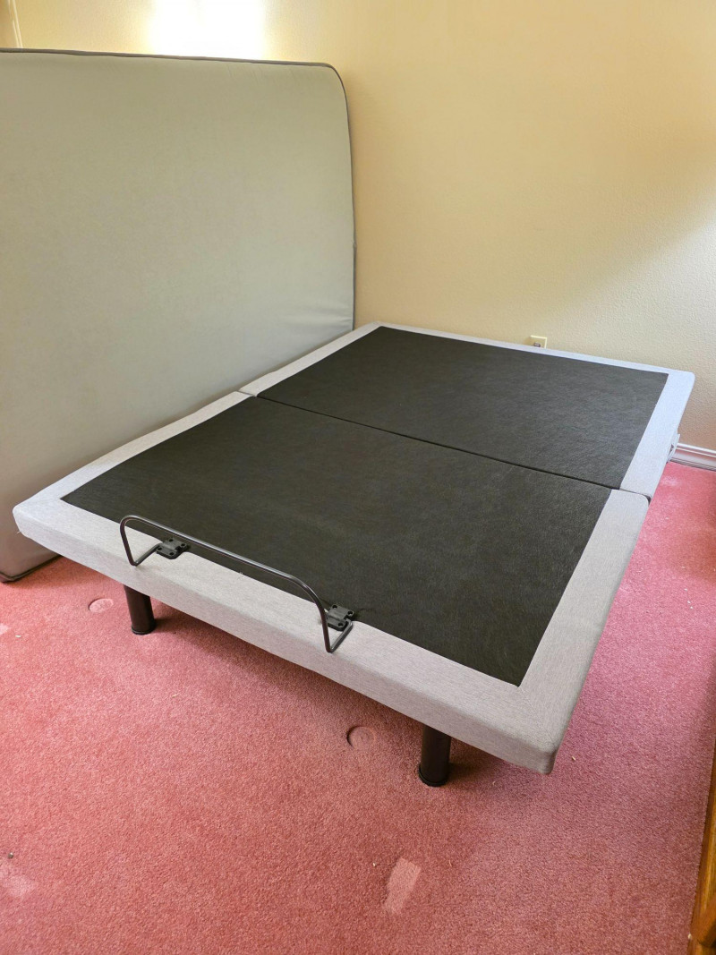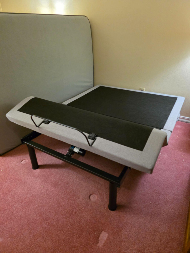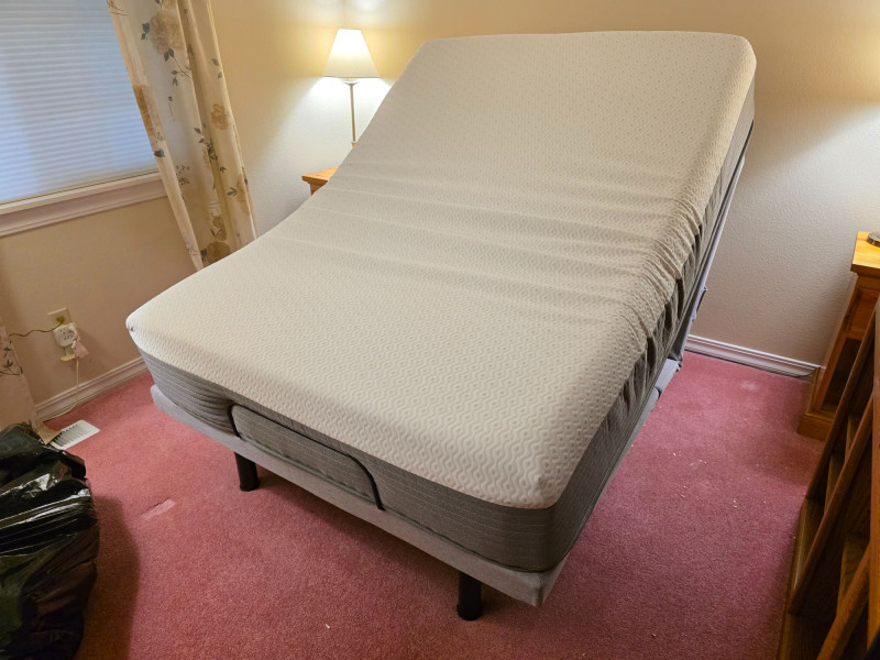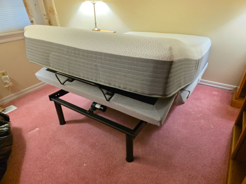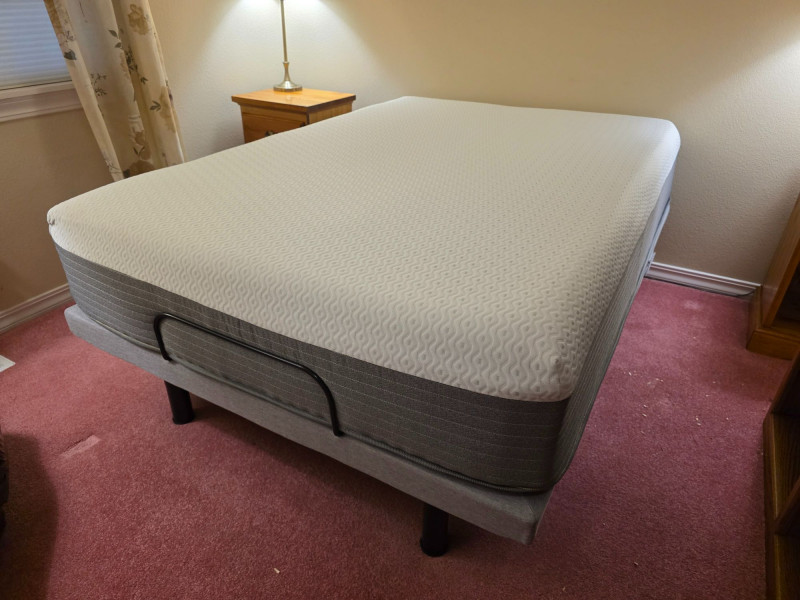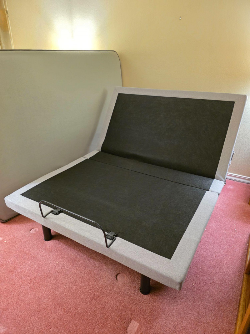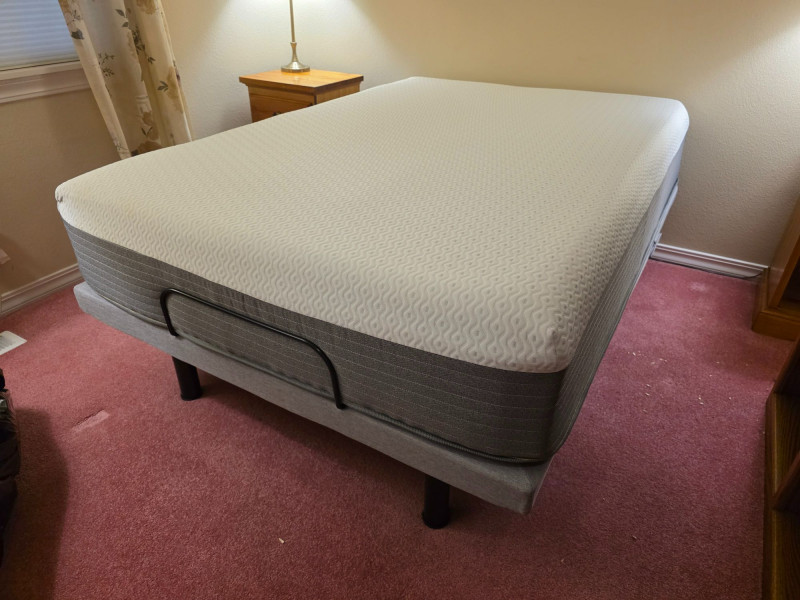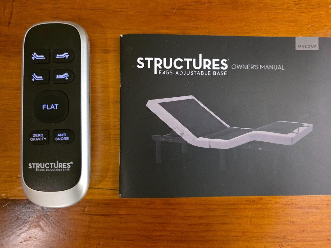 Structures E455 Adjustable Base Platform With Full Mattress By Malouf The Structures E455 Adjustable Base by Malouf is a premium, upholstered bed base featuring independent head (0-60°) and foot (0-45°) adjustment with a 850 lb weight capacity Includes Bluetooth connectivity, a wireless backlit remote, Zero Gravity/Anti-Snore presets, and a zero-clearance design for direct placement on platforms Also includes clean full-size Sleep Products 13" thick memory foam mattress, manual and bedding. Tested - Works! Full Mattress: 13"T x 75.5"L x 53.5"W Adjustable Platform: 15"T x 73.25"L x 54"W