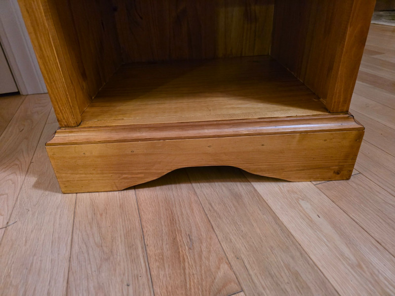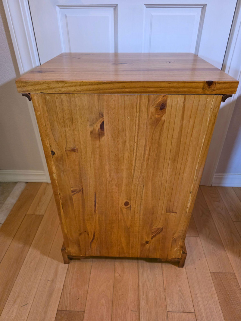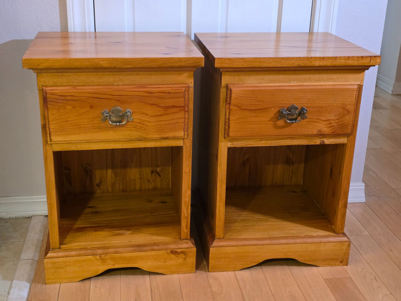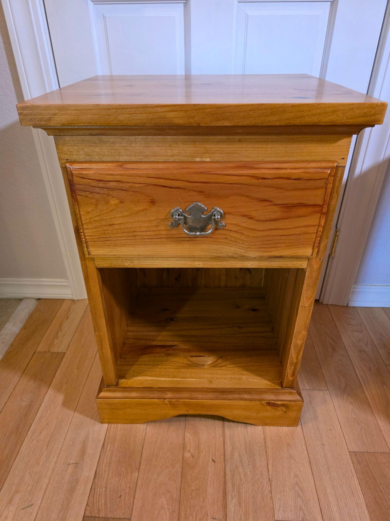 Pair of Hand Crafted Farmhouse-Style Solid Pine Nightstands Featuring a single top dovetailed drawer with a brass handle and a lower open shelf for storage Solid wood construction, warm finish, and traditional bracket-style base This nightstand strongly resembles the Ethan Allen "Heirloom Nutmeg Maple" collection Nice condition, see pics 27.25"T x 19.75"W x 16.5"D