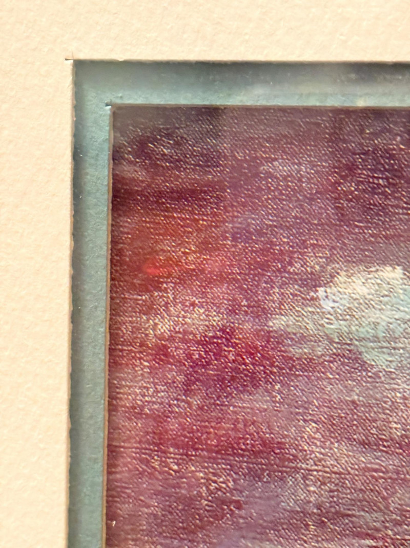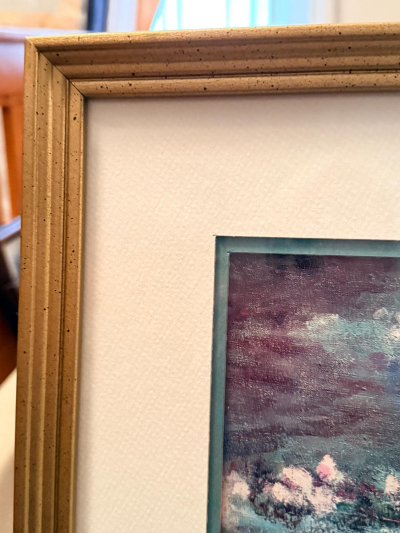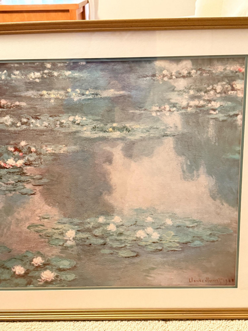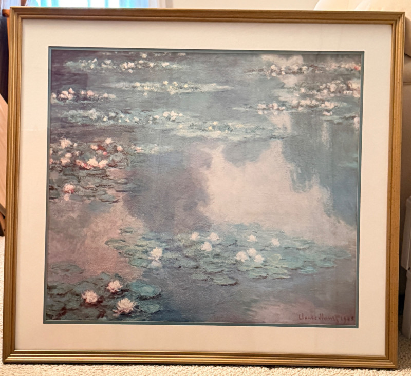 This framed artwork is an offset lithograph print on fine art paper of Claude Monet's famous Impressionist painting, "Water Lilies and Japanese Bridge". 1” gold wood frame with black splatter.