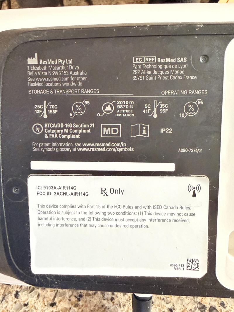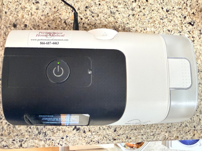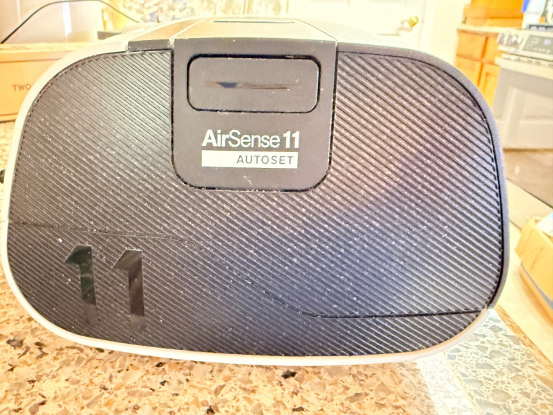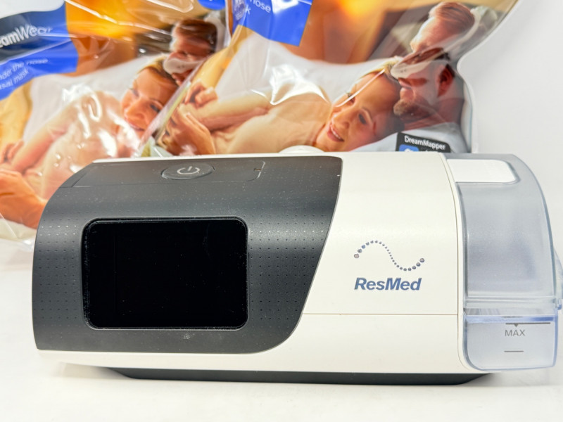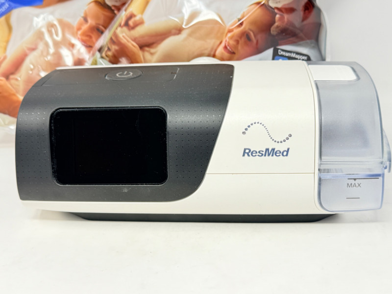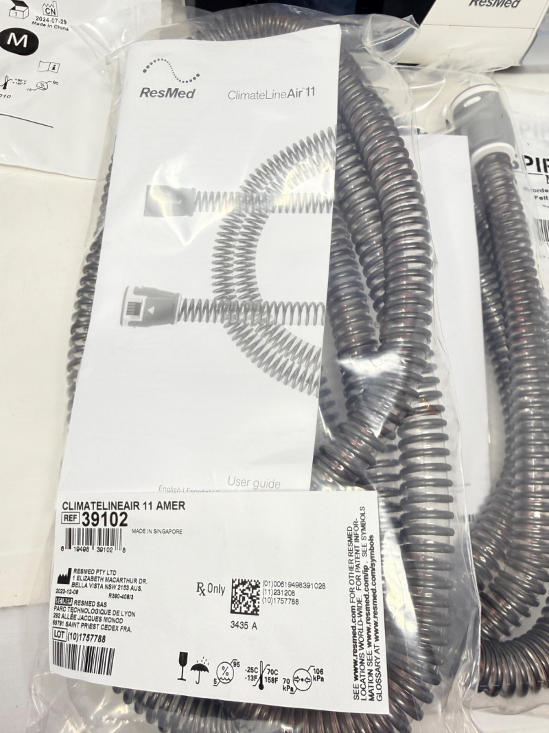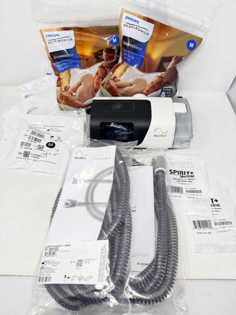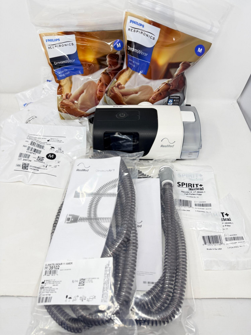ResMed Positive Air Pressure Machine (CPAP) - Air Sense 11 and refill supplies. ResMed AirSense 11 AutoSet. A premium auto-adjusting pressure device designed to treat obstructive sleep apnea. Includes an integrated heated humidifier to prevent dryness and throat irritation. Features wireless connectivity for data monitoring through the myAir app. Operates at a sound pressure level of approximately 27 decibels for a quiet environment. Equipped with a touchscreen display and a built-in ambient light. Tested, works! Measures 10”x5.5”x4” Also Includes: 2 DreamWear Medium Under the nose masks. 2 ClimateLineAir 11 heated hoses 11 DreamWare Under the Nose Nasal Cushions 9 Felt Pollen Filters