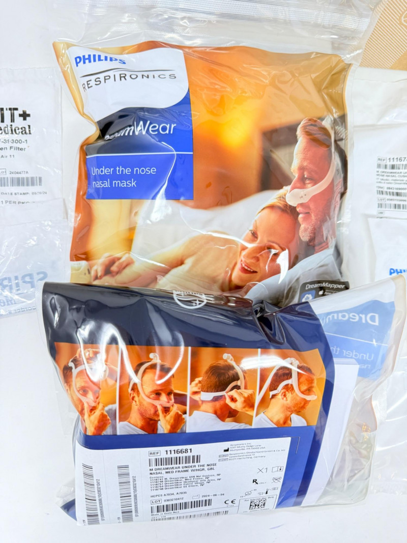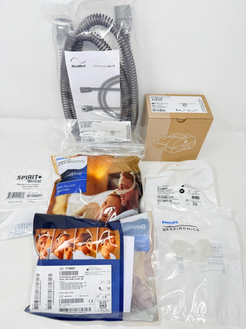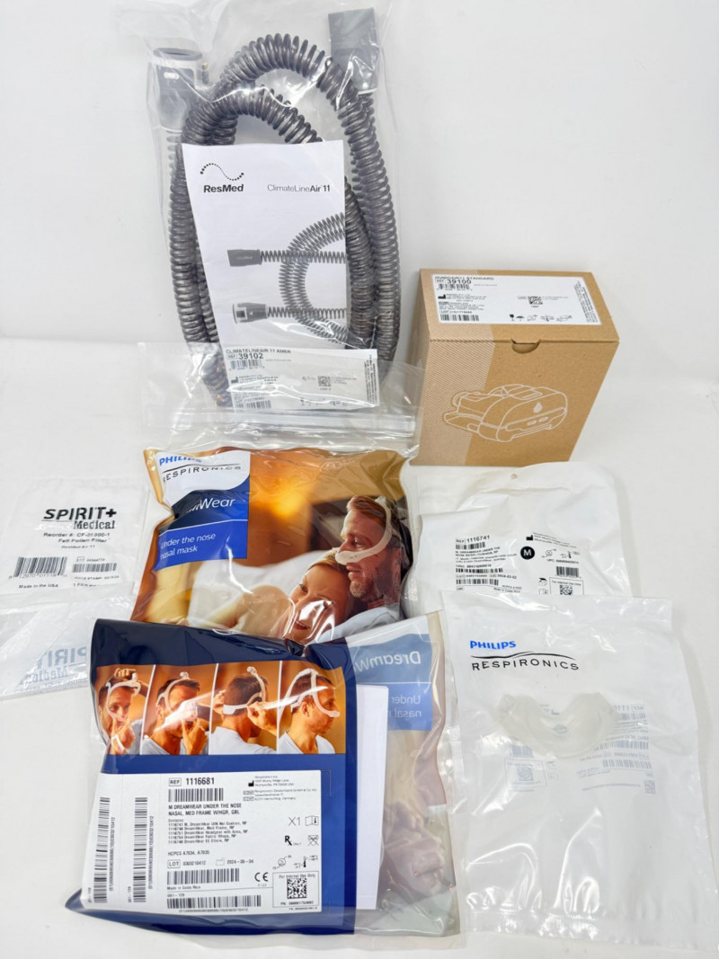ResMed CPAP Supplies - Reservoirs, Heated Hoses, Nasal Pillows + 3 HumidAir 11 Water Reservoirs 3 Medium DreamWear Under the Nose Masks with Headgear 18 Nasal Cushions 15 Felt Pollen Filters All New In Packaging. Originally for use in the ResMed AirSense 11 CPAP machine.