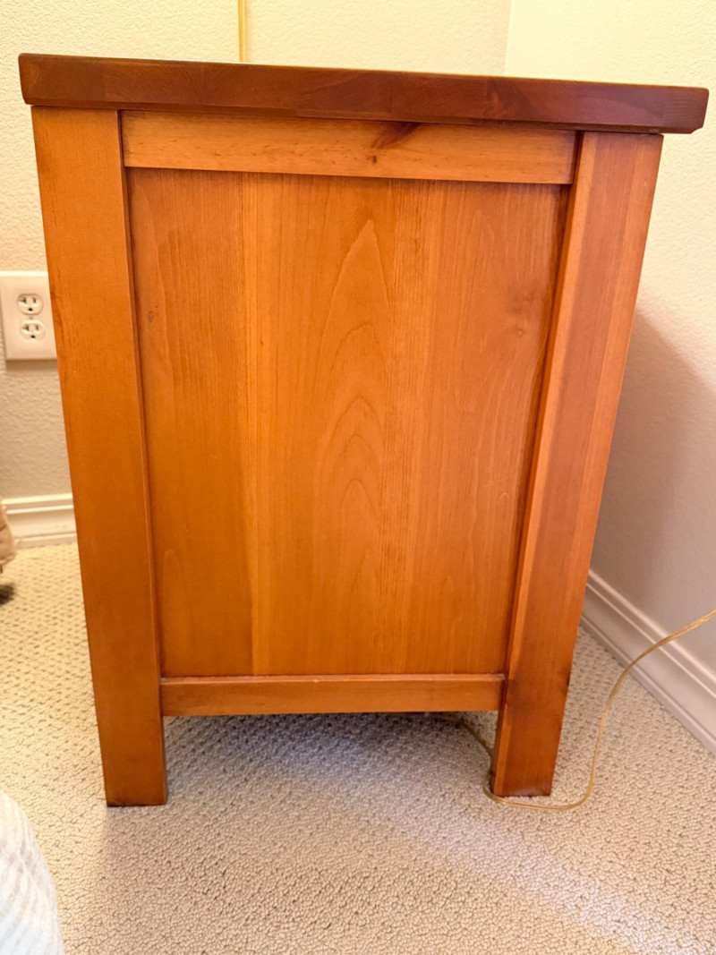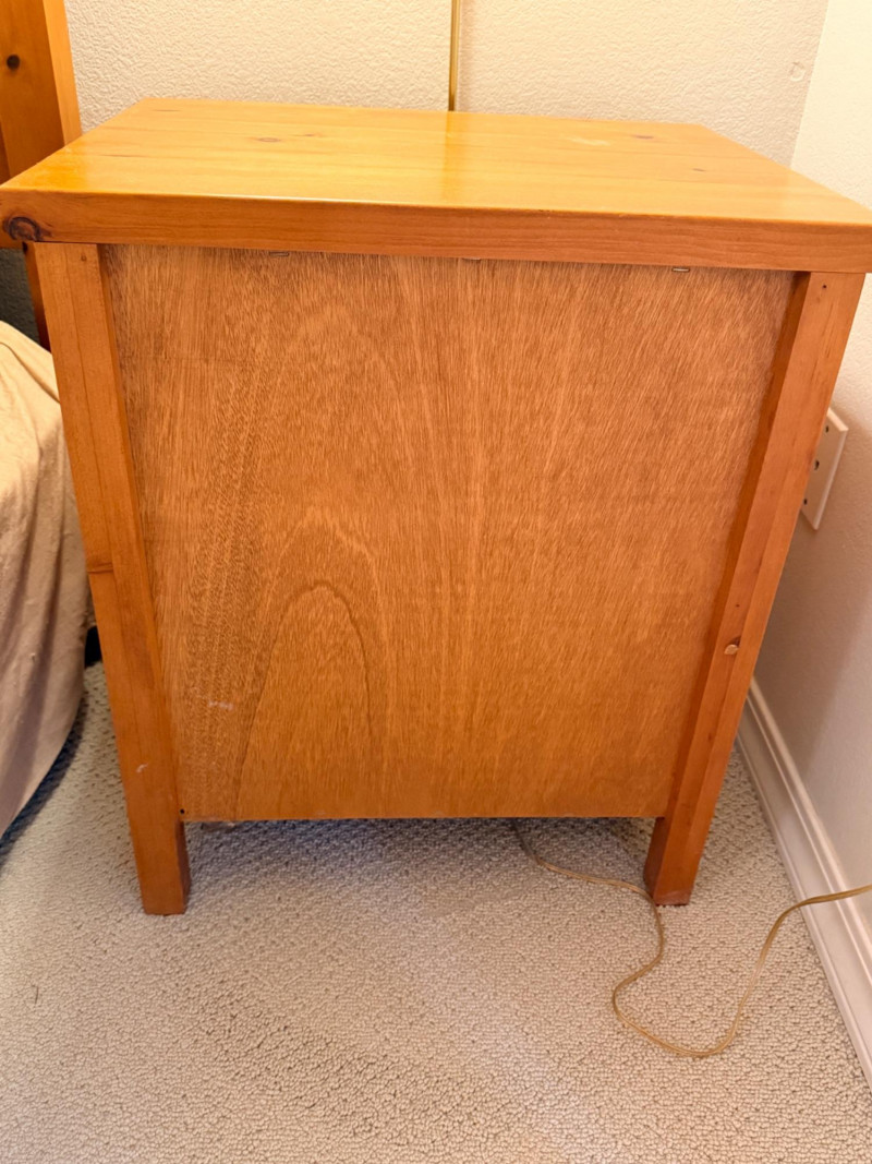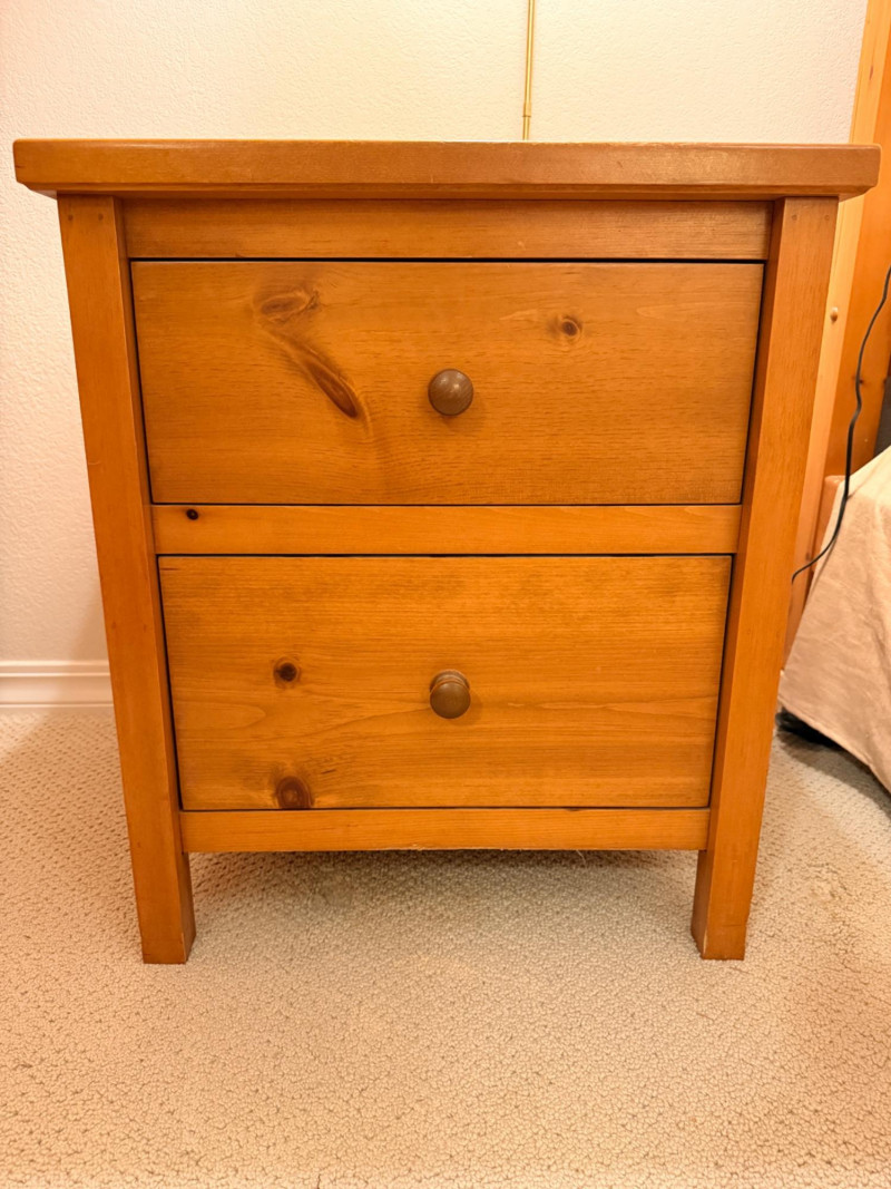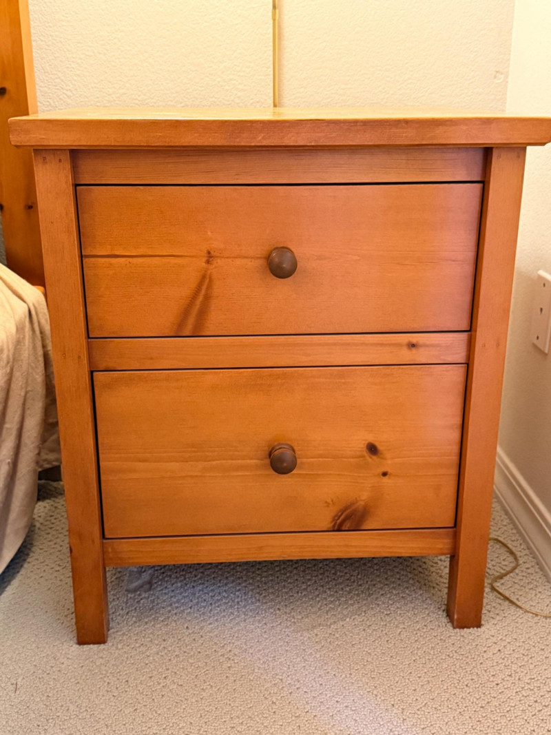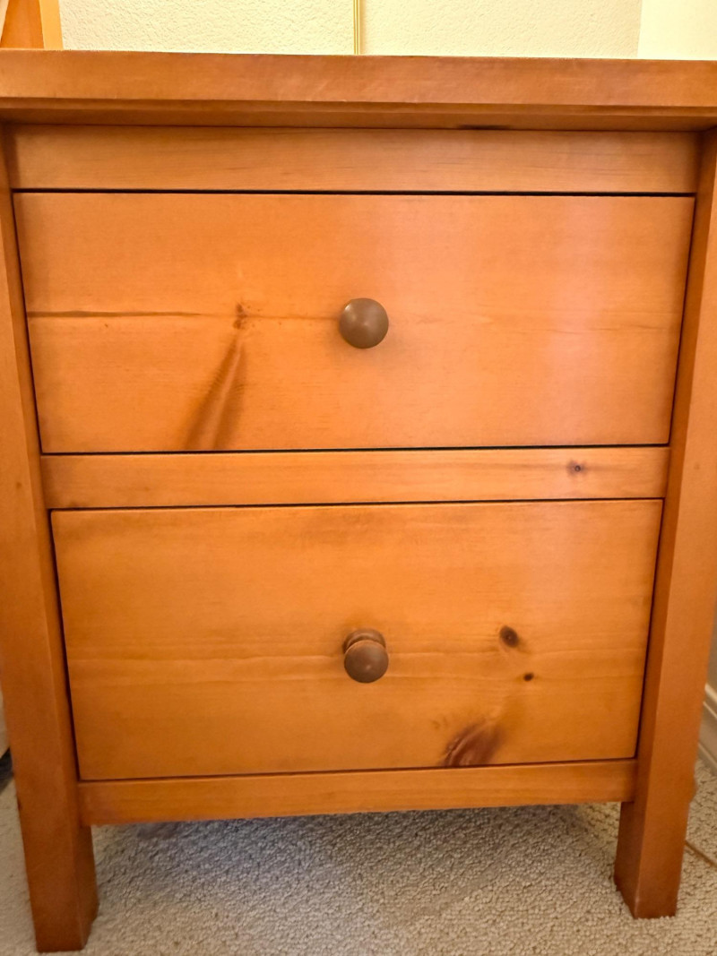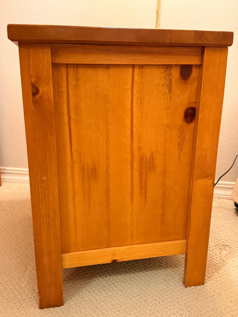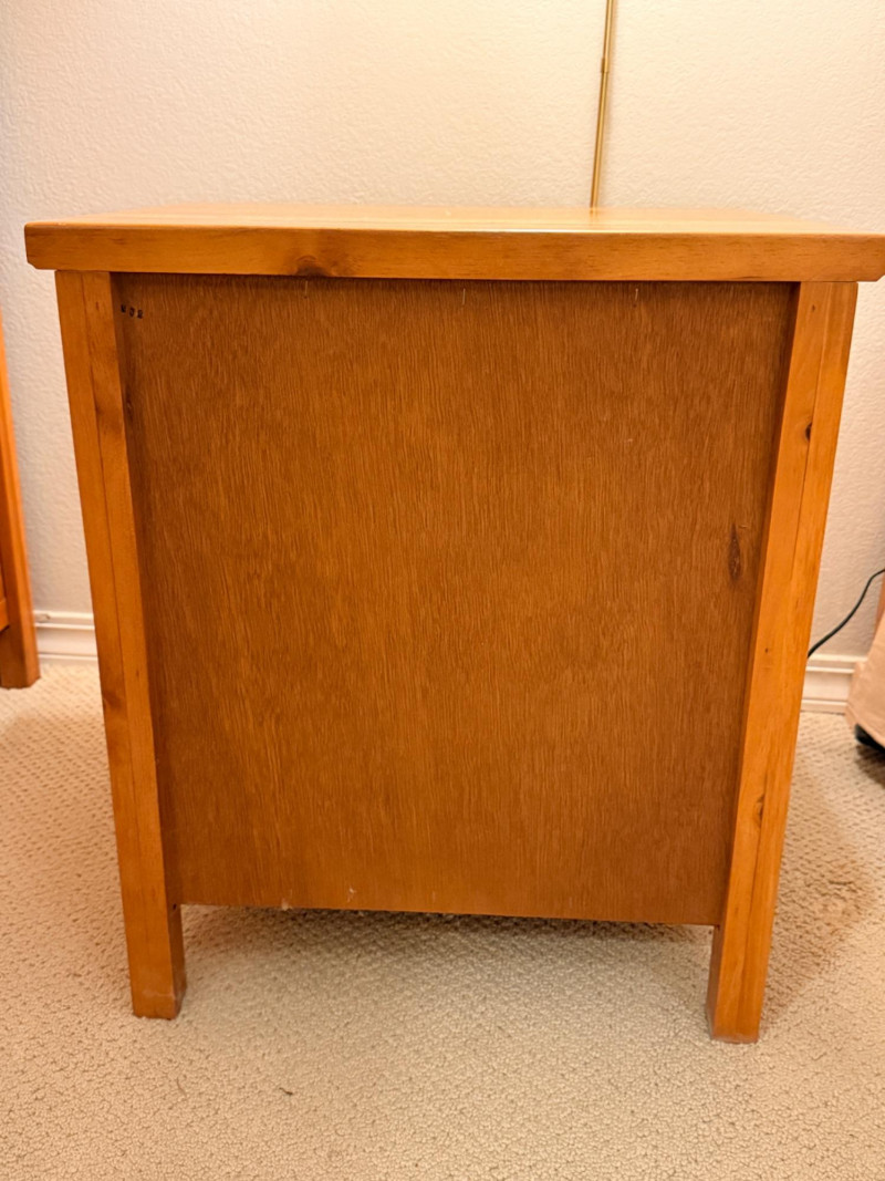 (2)Shaker Style Knotty Pine Nightstands Typical soft pine dings.