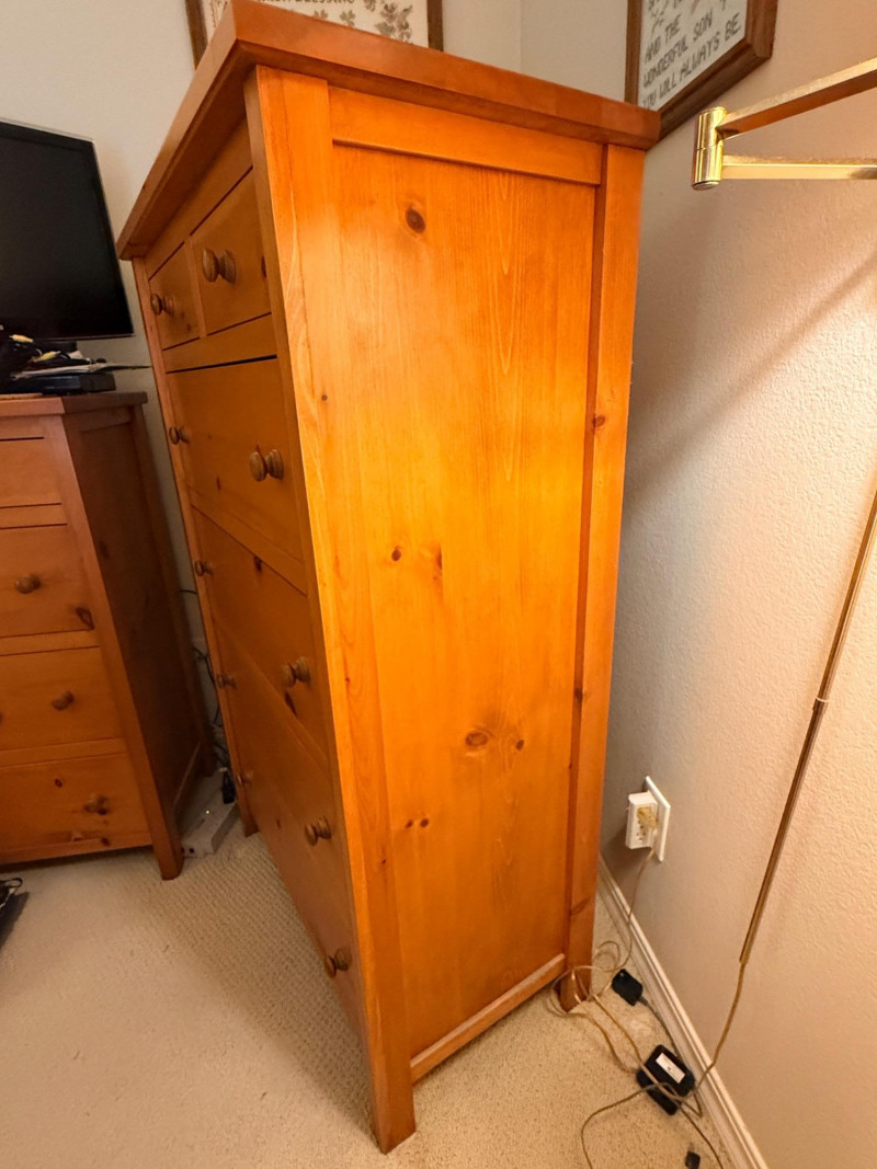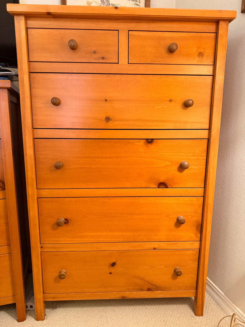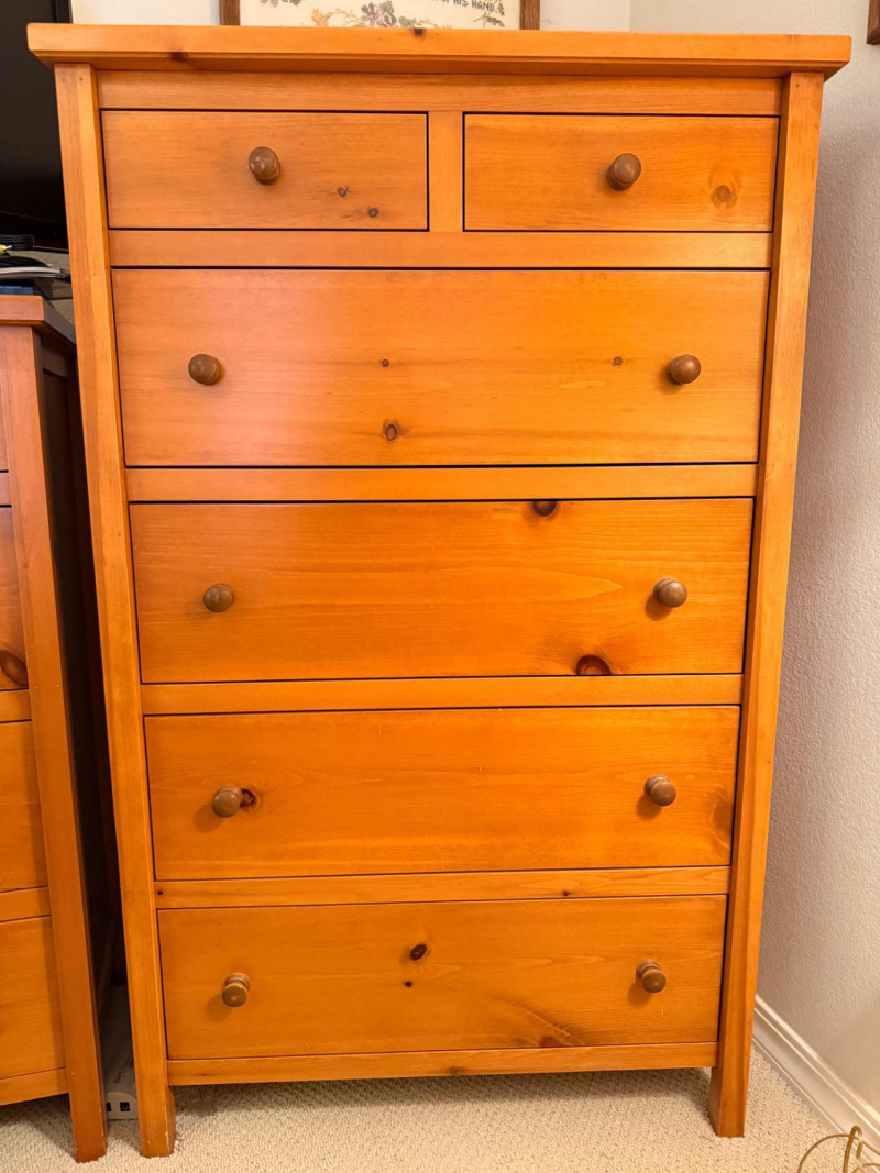 Knotty Pine 6 Drawer Tall Boy Dresser 34. 5”x18.25”x55.25”