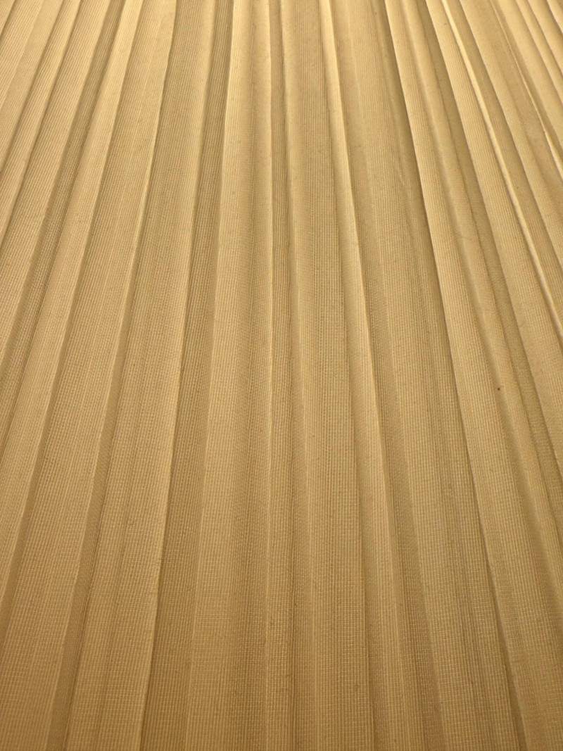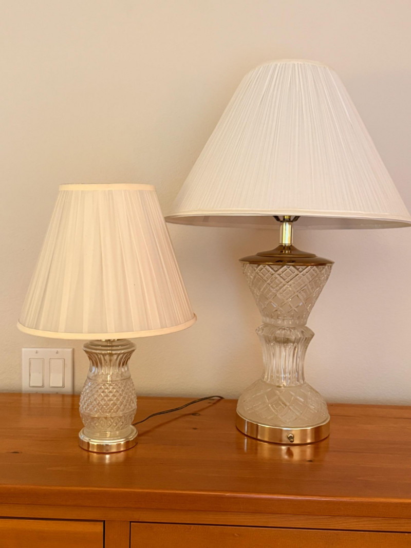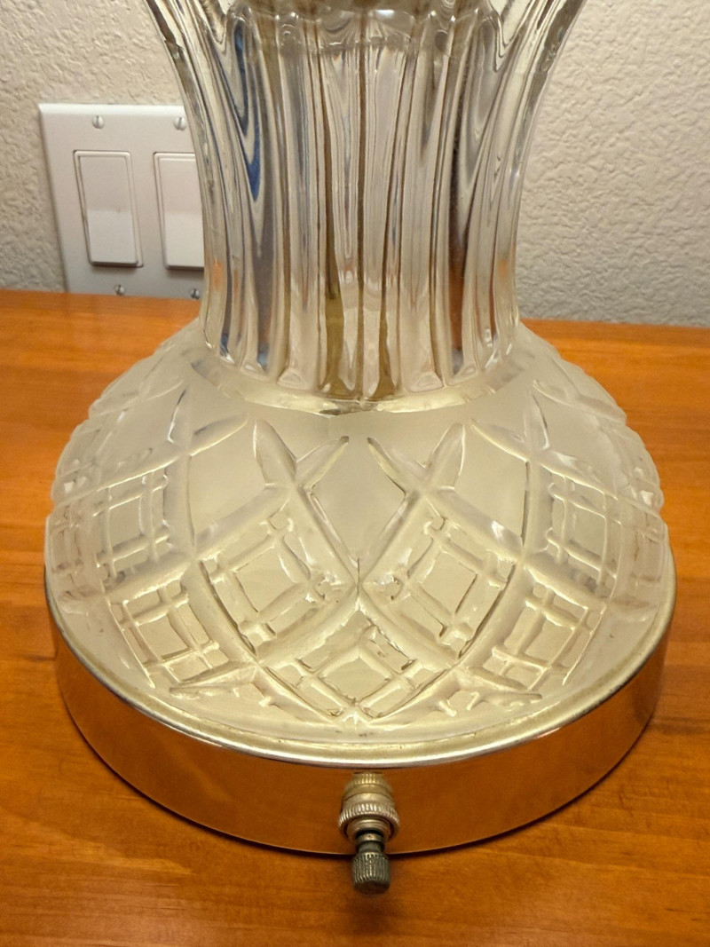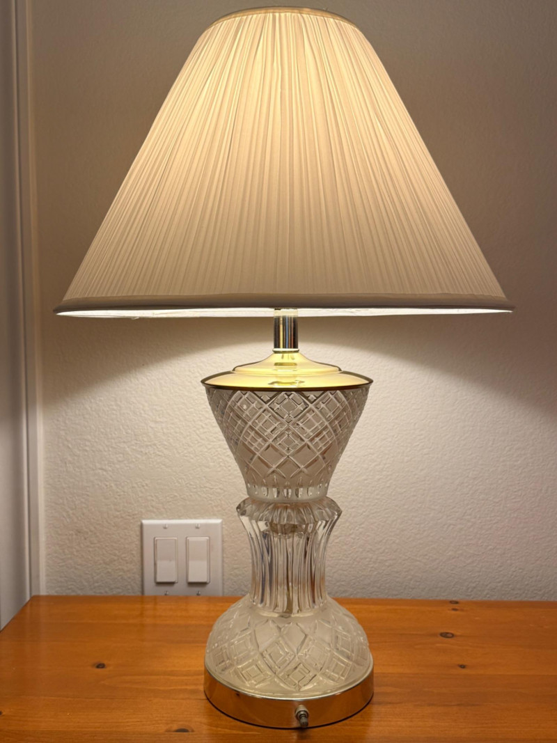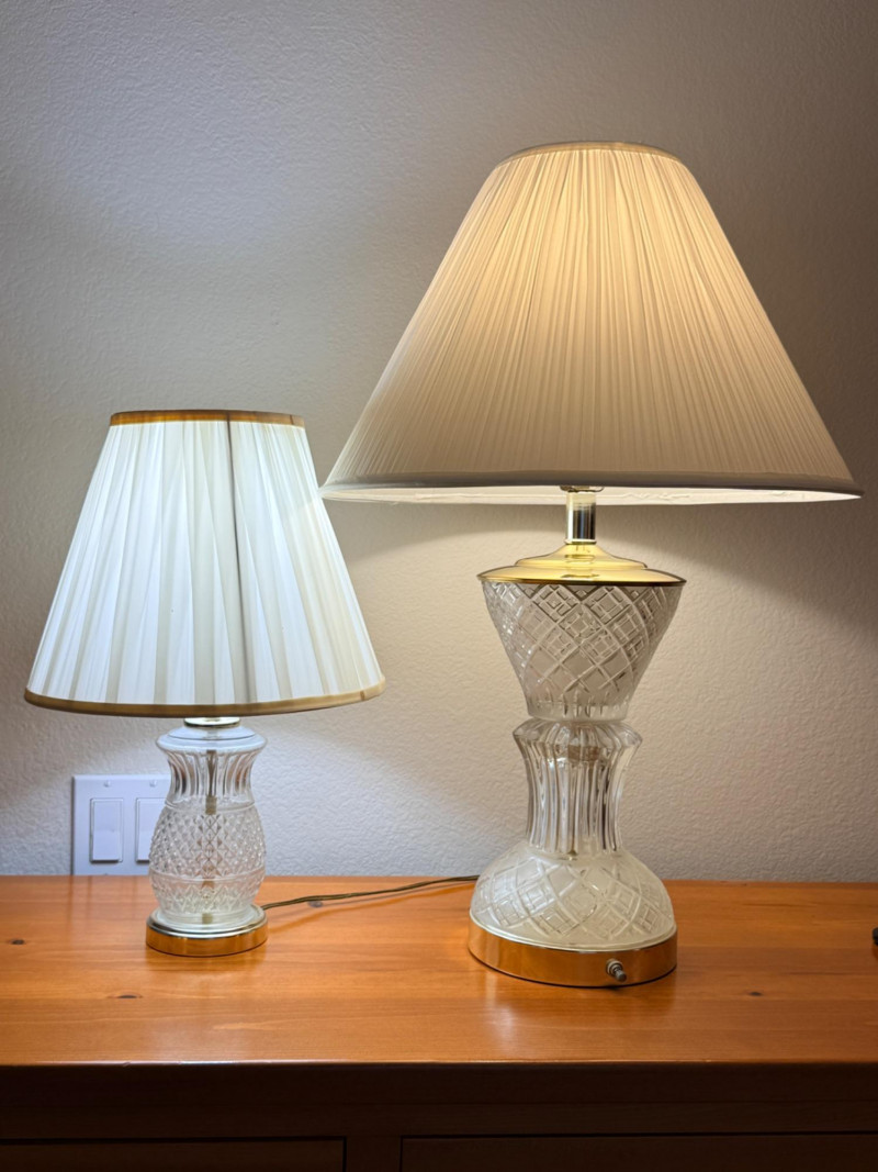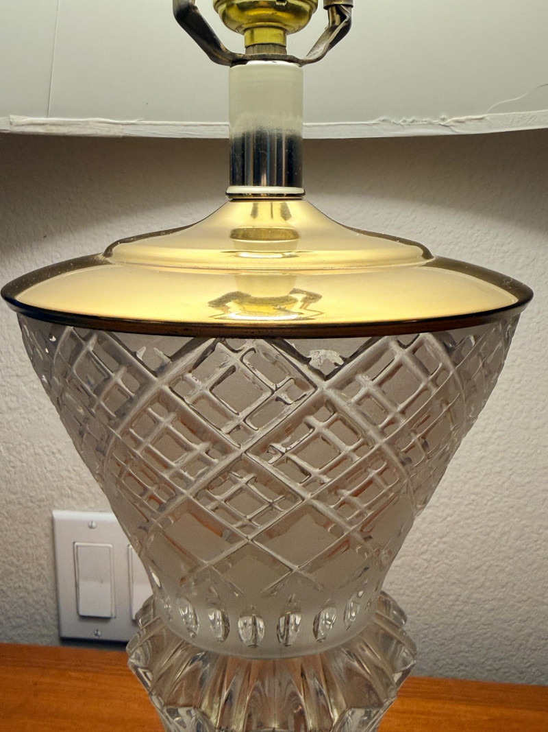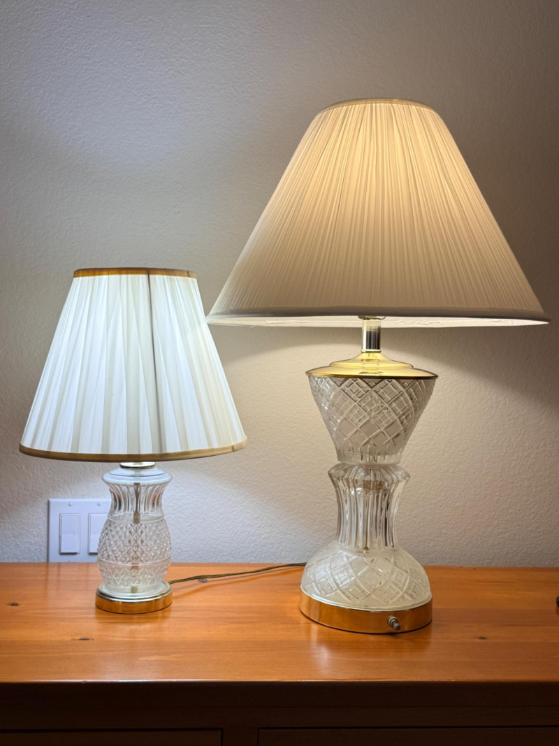 (2) Glass and Brass Lamps Larger cut frosted glass body with lower light (needs bulb, untested) and upper light independent of one another. 7”x27”x18” shade Both with ivory pleated shades.