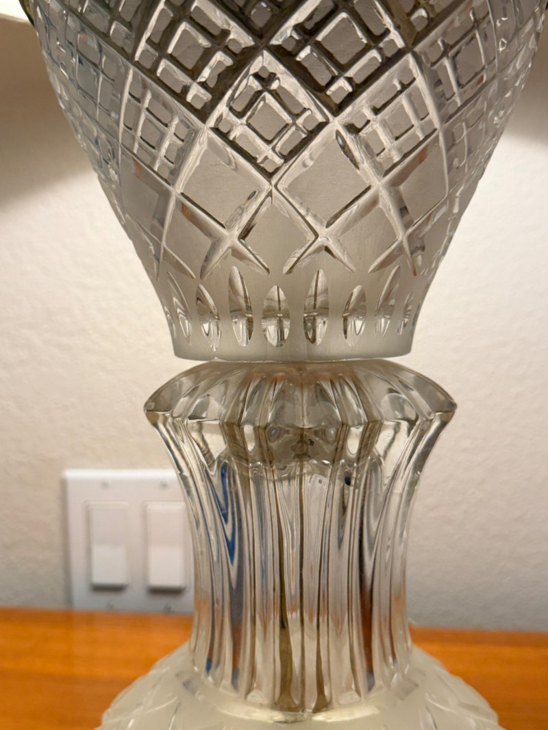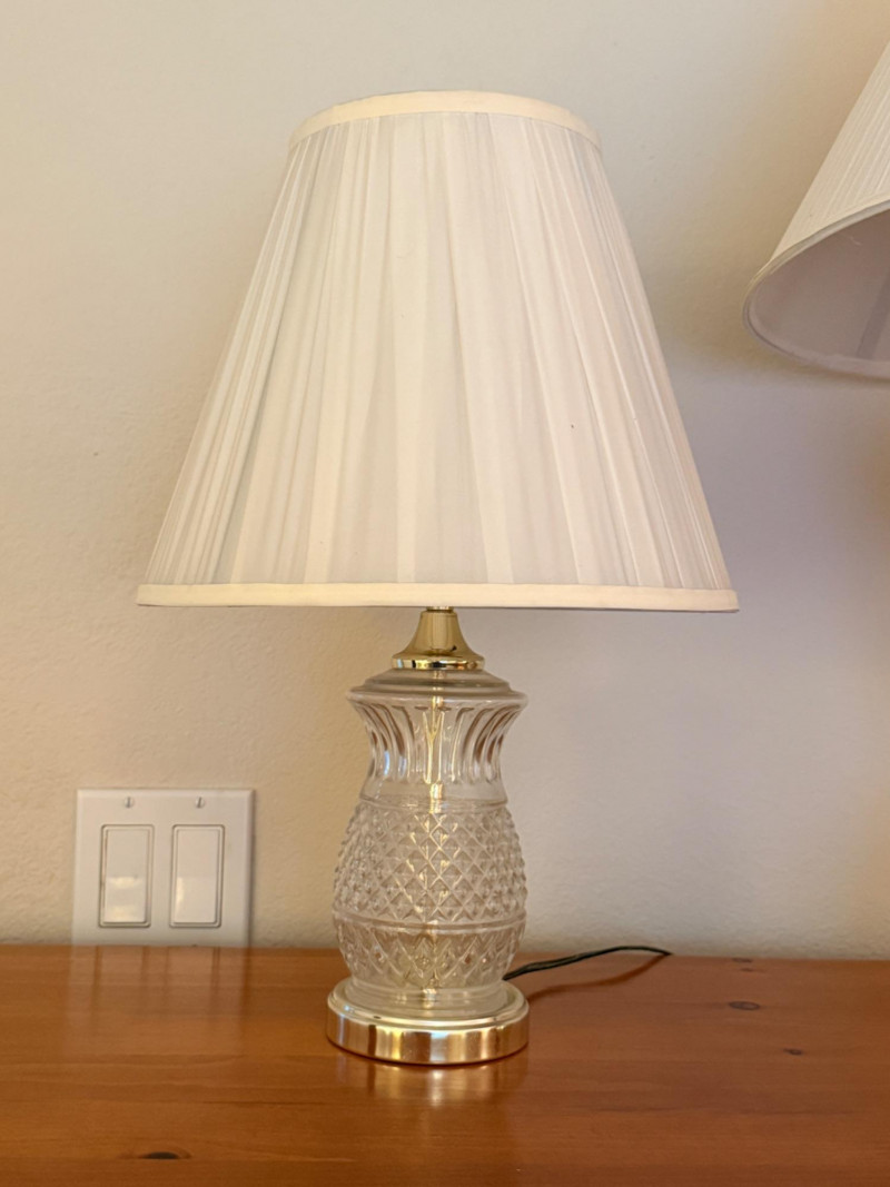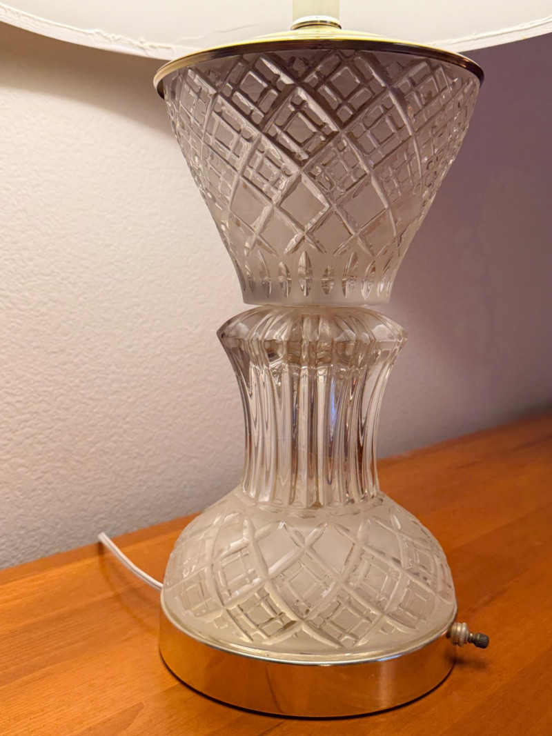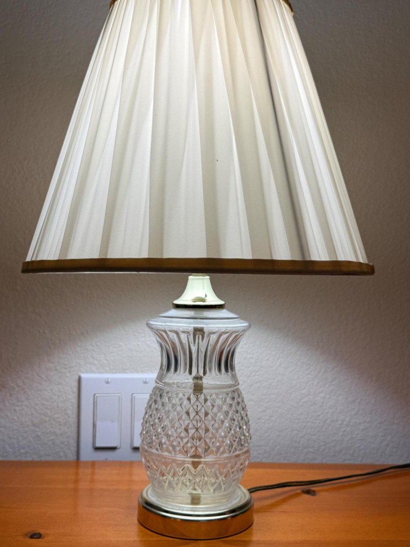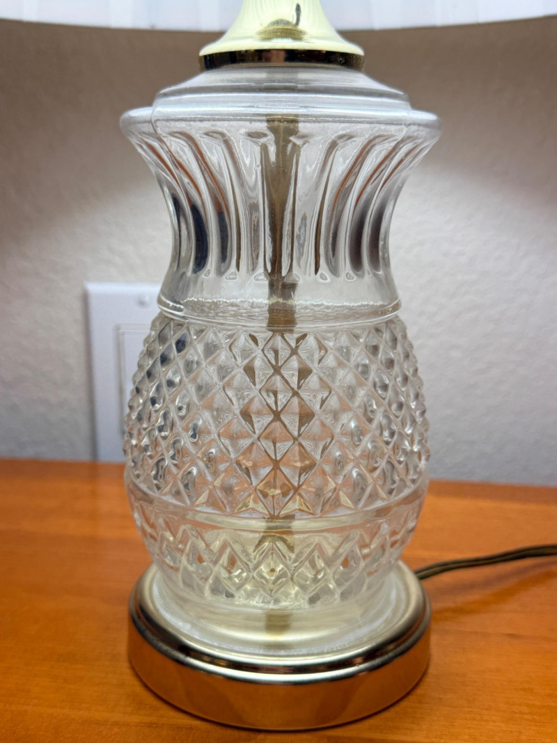 Smaller pressed glass bedside lamp is 4”x17”x12”