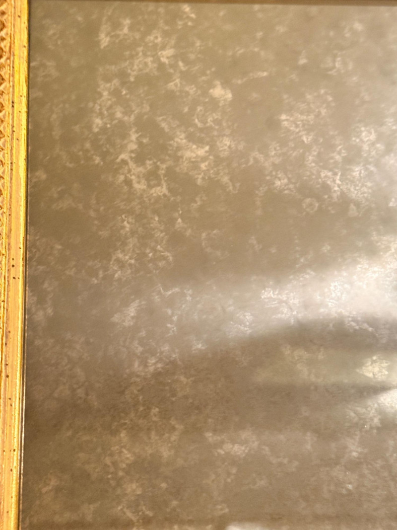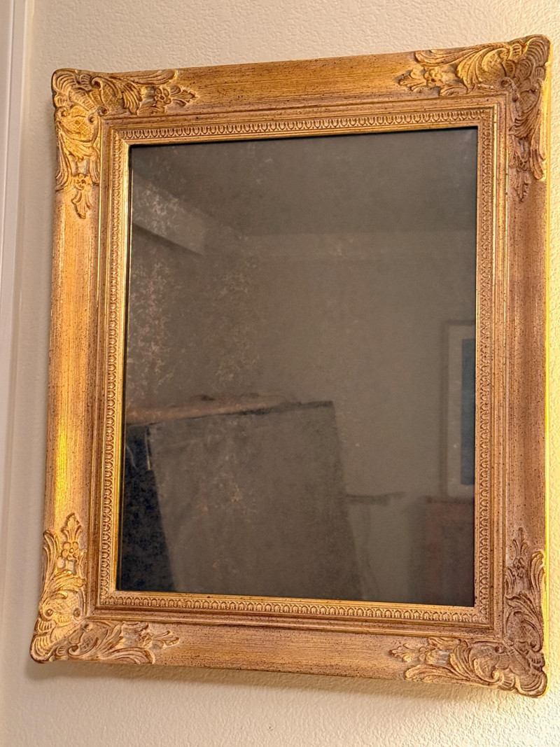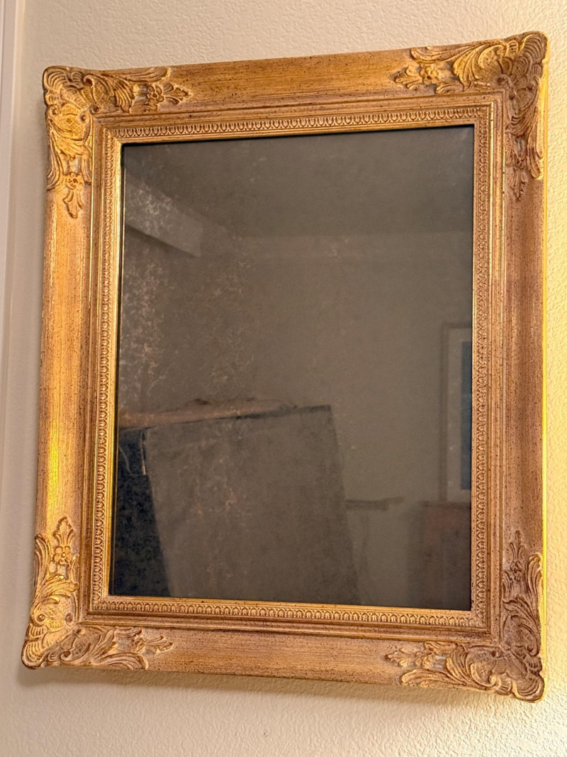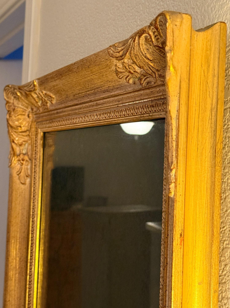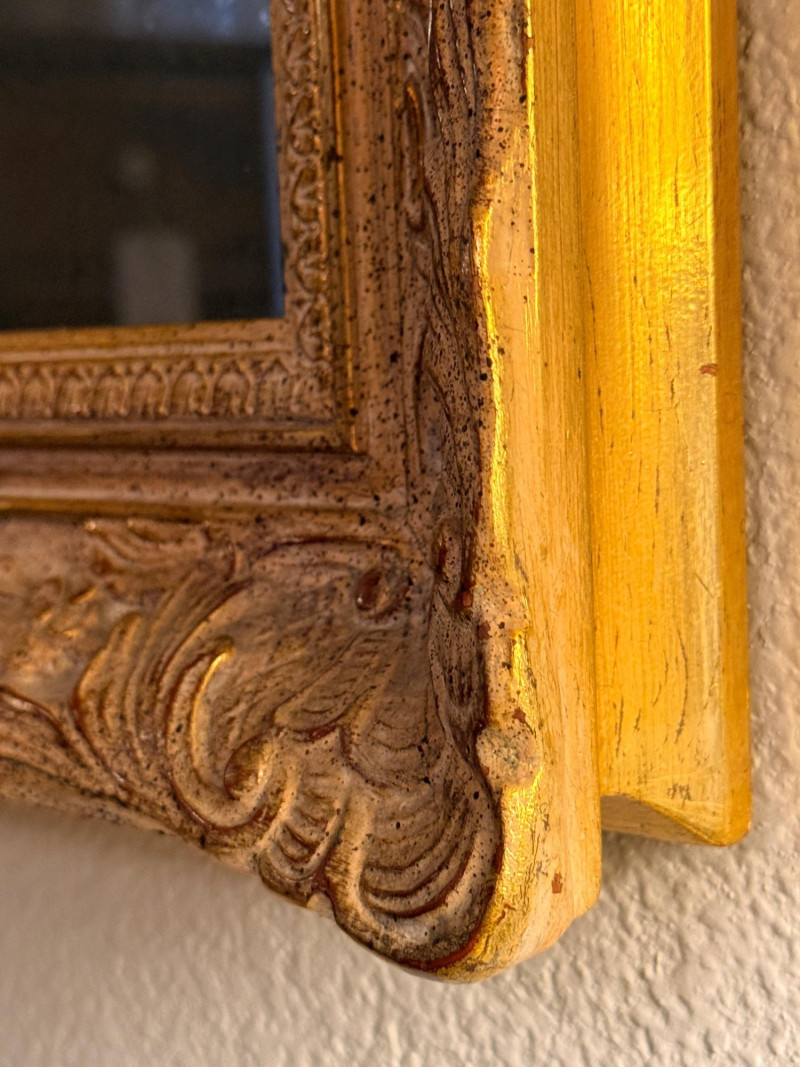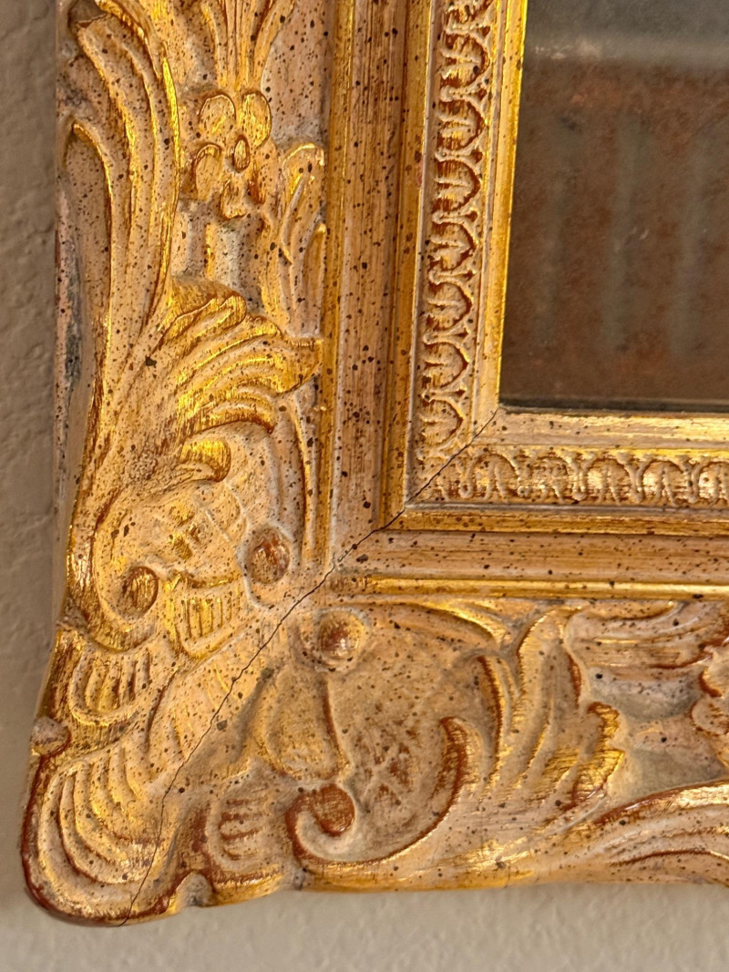Louis XIV style mirror, featuring ornate gold patina and corner decorations. Antique gold leaf patina finish over plaster on wood. Rectangular shape with ornate corners and border. Each corner has a hairline crack. See pics for condition. It’s pretty with darkening of the mirror finish. 21.5”x25.25”x2.25”