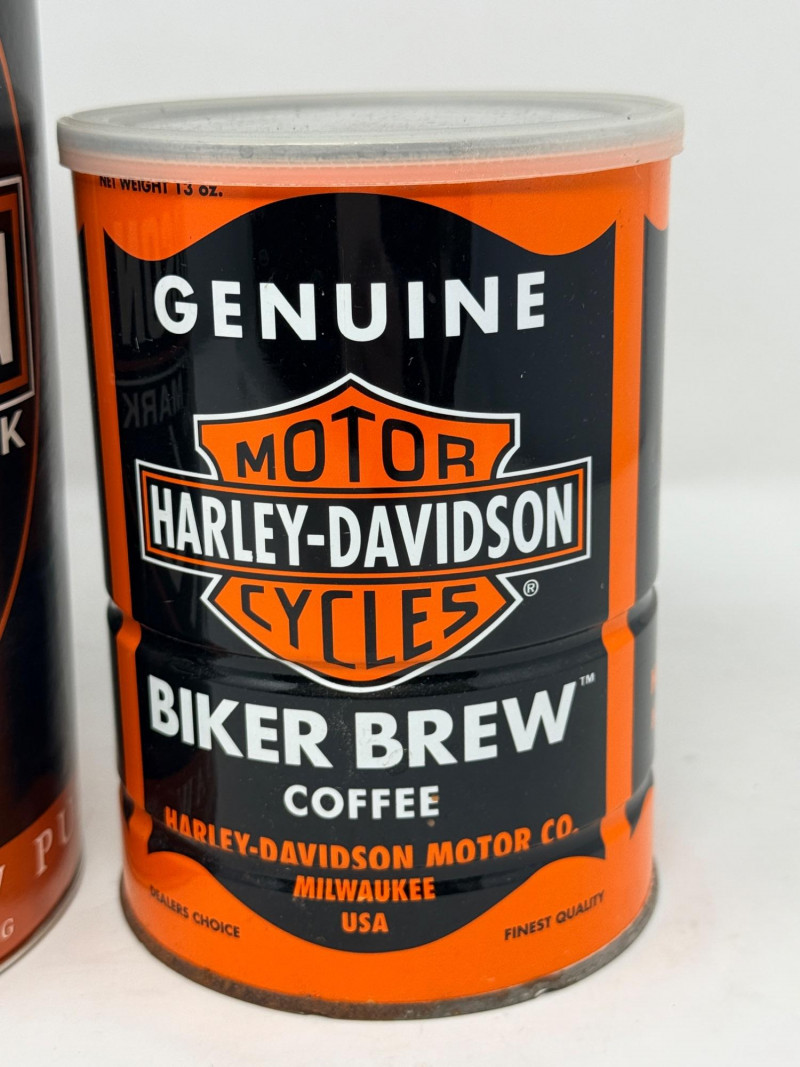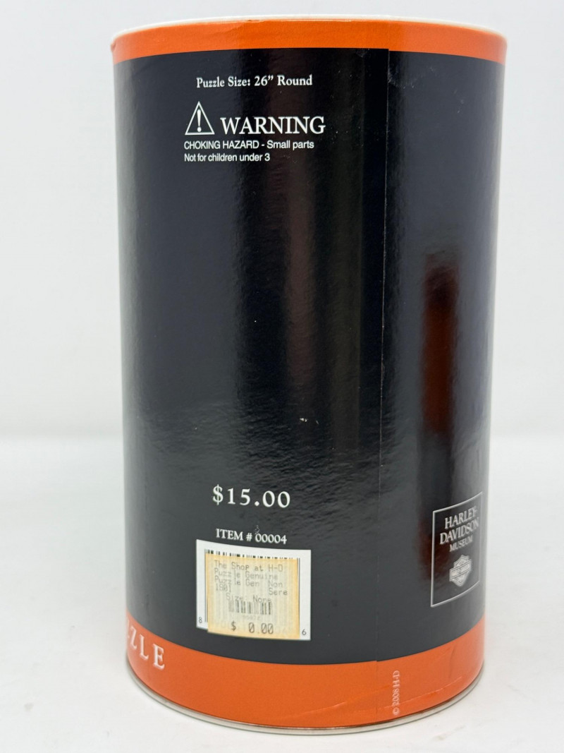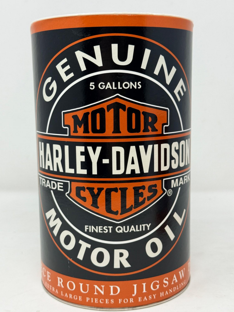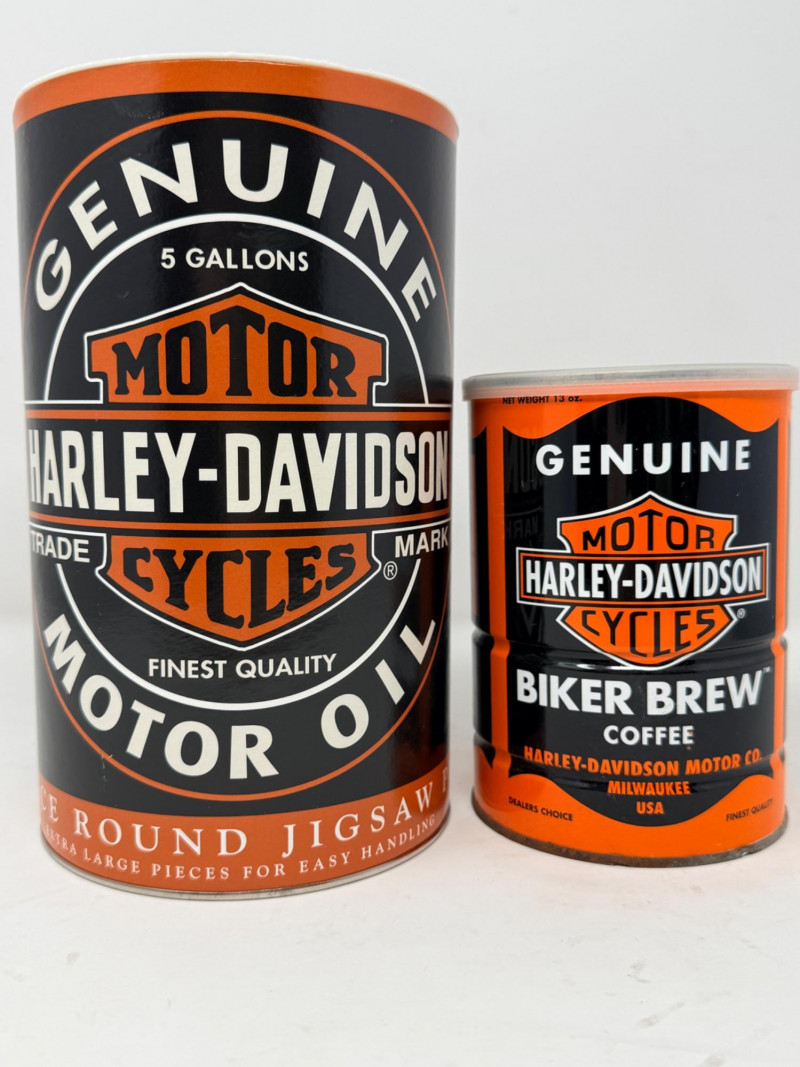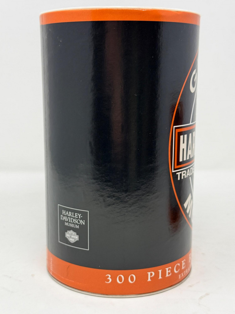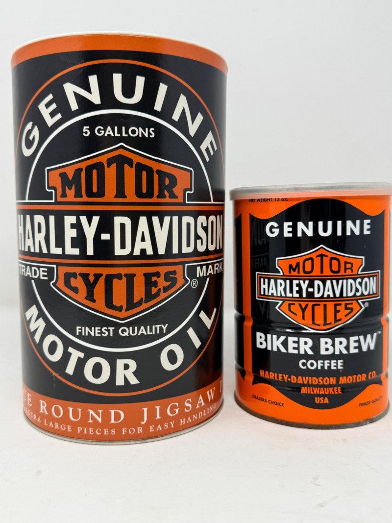 Harley Davidson Biker Brew & Jigsaw Puzzle Bikers Brew Coffee can measures 4”x5.5” 300 piece round Genuine Motor Oil Puzzle. Unknown if complete. Cardboard cylinder has a plastic top with coin slot.