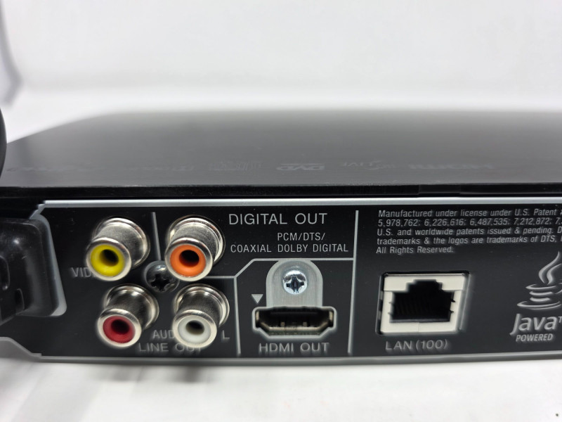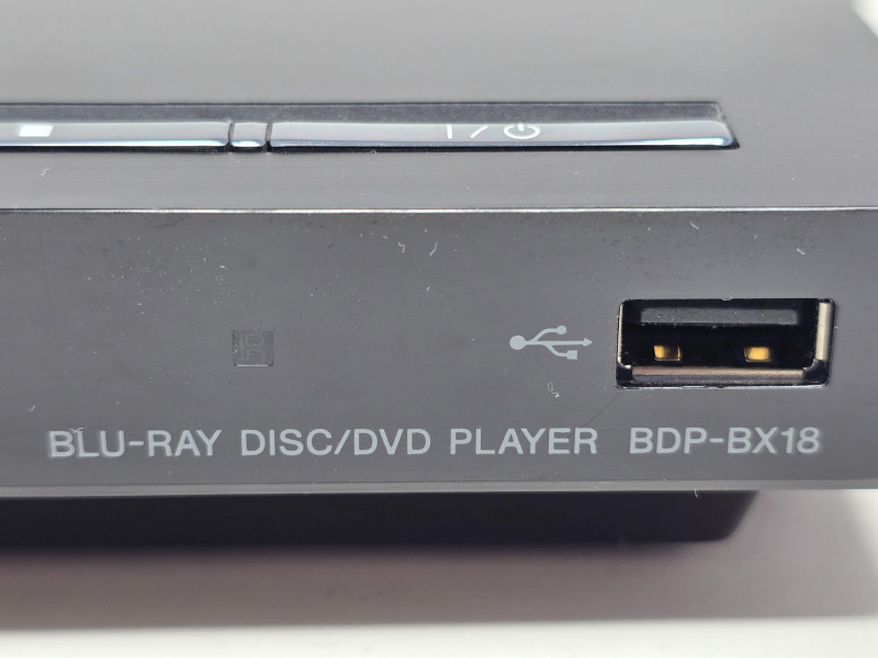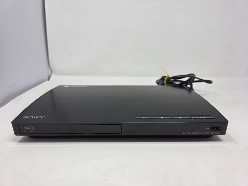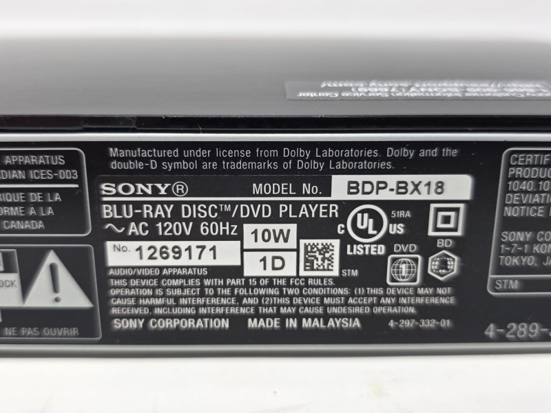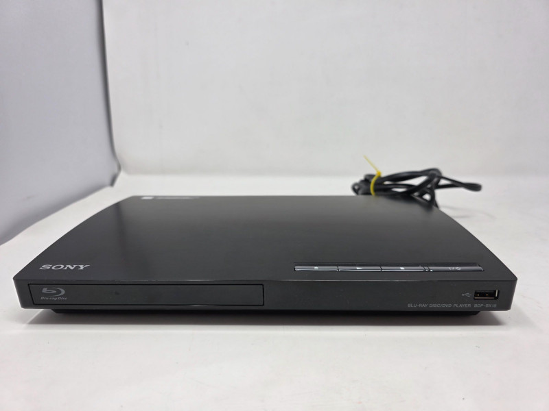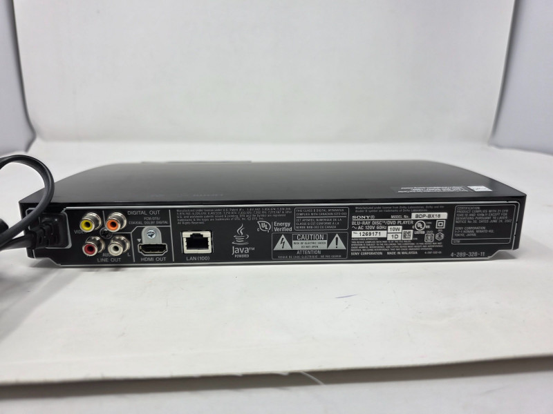 Sony Compact Blu-ray Disc, DVD & CD Player Sony Model # BDP-BX18 Manufactured Date 2011 Supports Blu-ray discs (Full HD 1080p), DVDs (with upscaling to 1080p), and standard CDs Outputs: 1 x HDMI, 1 x Composite Video (RCA), and 1 x Digital Audio Coaxial Inputs: 1 x Front-facing USB port for playing media files from external drives Includes an Ethernet port for internet connectivity and firmware updates Features built-in decoders for high-quality audio formats like Dolby TrueHD and DTS-HD Master Audio Includes power cord & remote Tested - Works! 1.5"T x 11.5"W x 7.5"D