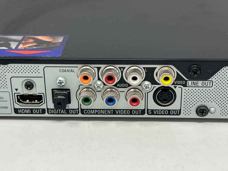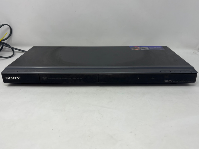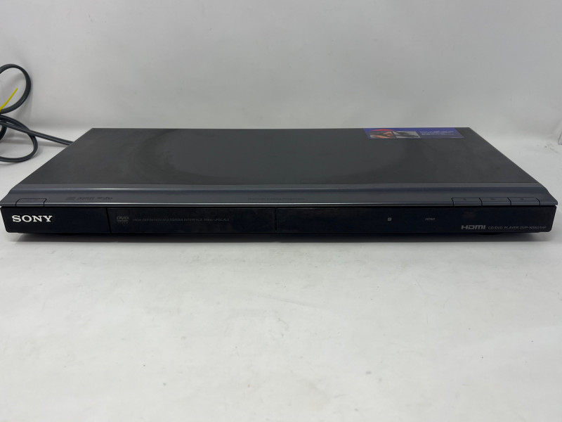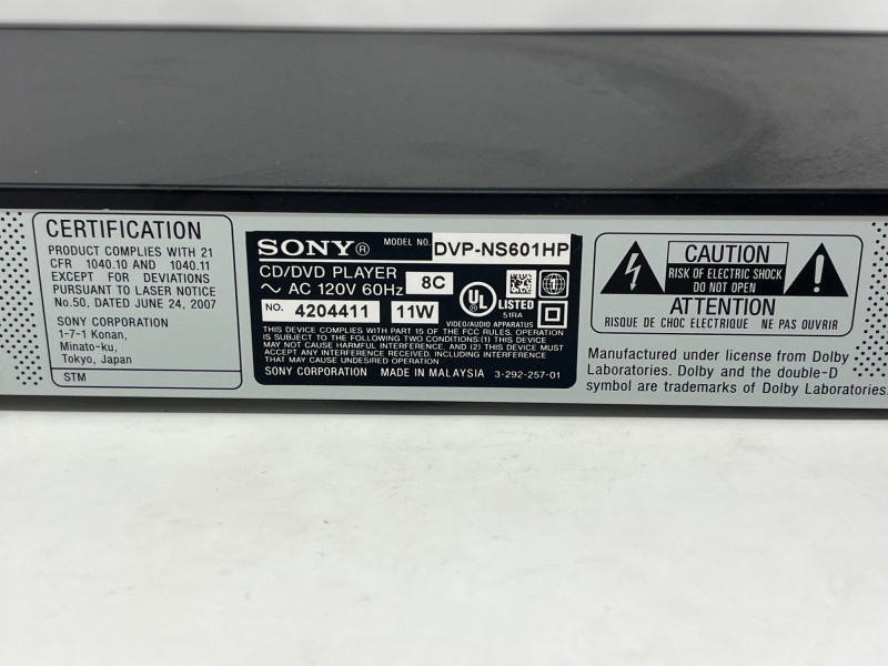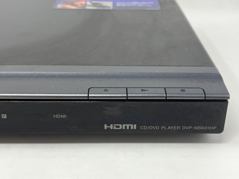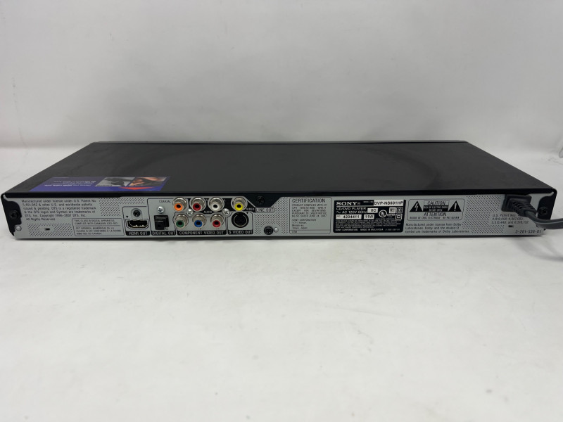 Sony DVP-NS601HP Single-Disc CD/DVD Player Model # DVP-NS601HP Manufactured in 2008 Manufactured in Malaysia and designed for the North American market (AC 120V 60Hz). Video Quality: Supports 1080p upscaling via HDMI, which enhances standard-definition DVDs to look clearer on modern HDTVs. Disc Formats: Plays a wide range of media, including DVD, DVD-R/RW, CD, CD-R/RW, and VCD. File Support: Compatible with MP3 audio files and JPEG photos. Audio: 192 kHz/16-bit audio DAC and supports Dolby Digital and DTS output for surround sound systems. Includes remote, power cord, audio cables, a HDMI cord, and more! Tested: Turns on. 1.5”Tx17”Wx8”D