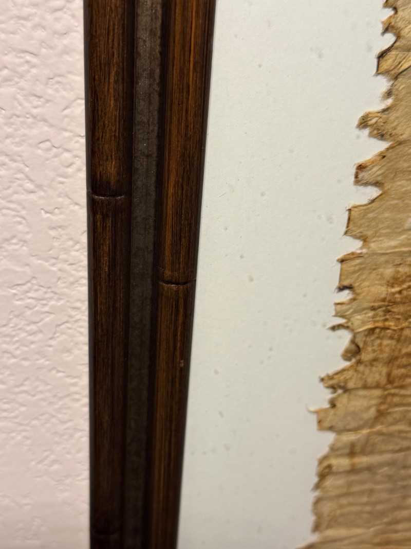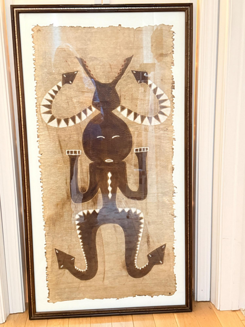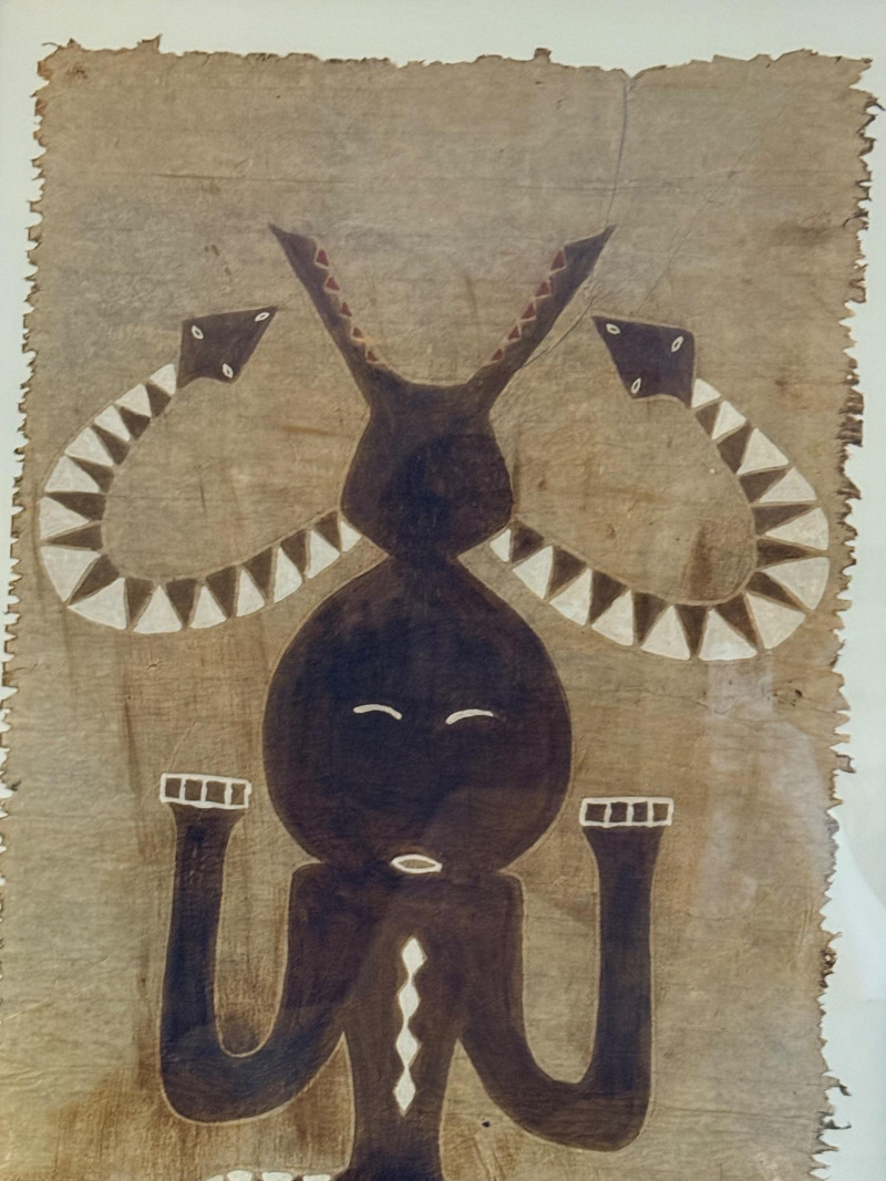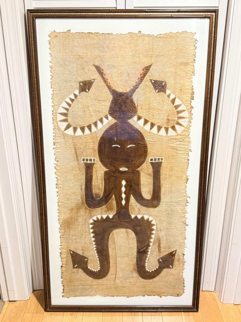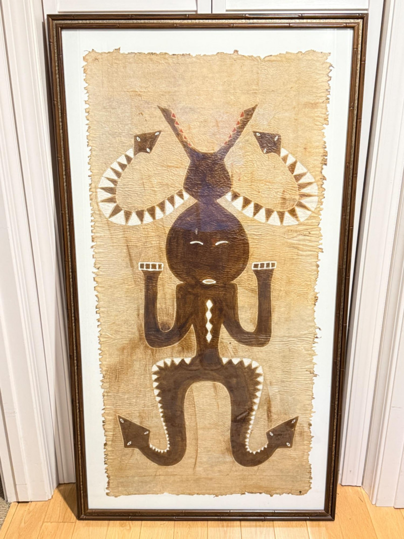 Vintage Asian Formosa Native Aboriginal bark brush painting. It depicts a full-figure deity or ancestor figure with snakes. The artwork is painted on bark, likely using a bamboo brush and bark sap. There is a lot of texture on the medium. It is housed under glass in a brown bamboo style wood frame. Measures 28“ x 51“ with a 1 inch frame.