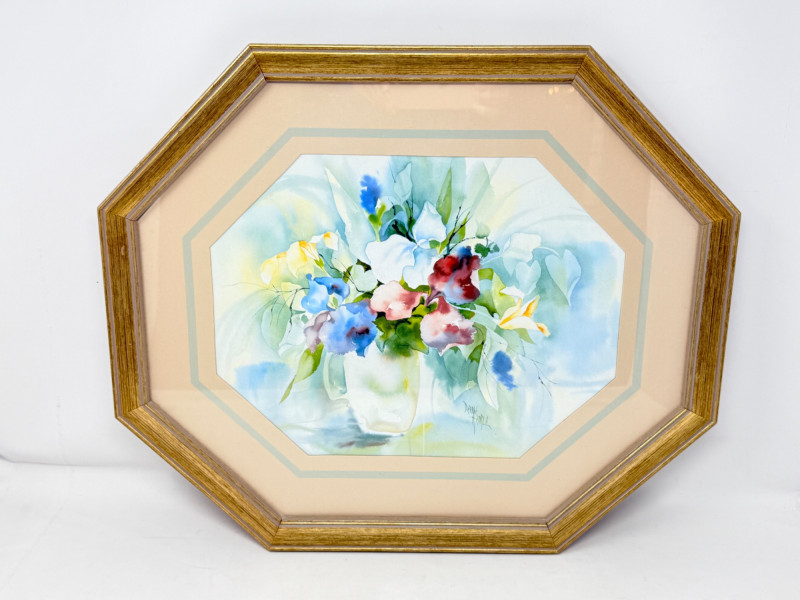 Vintage watercolor floral print by artist Debbie Hearle. Known for her soft, botanical style, this particular piece features a bouquet in a white vase and is presented in a characteristic gold octagonal wood frame with a color-bordered mat under glass.
