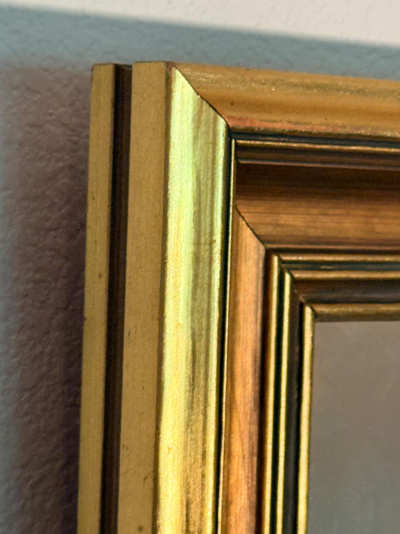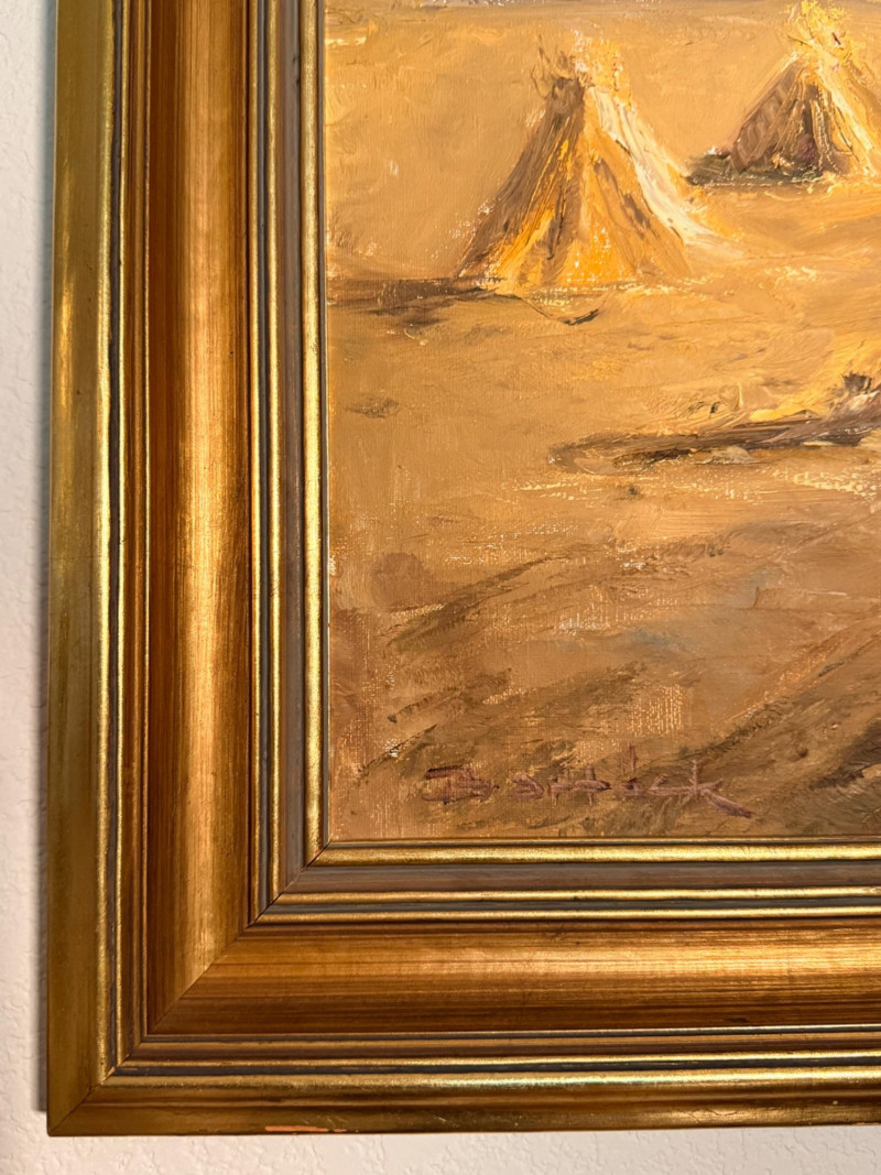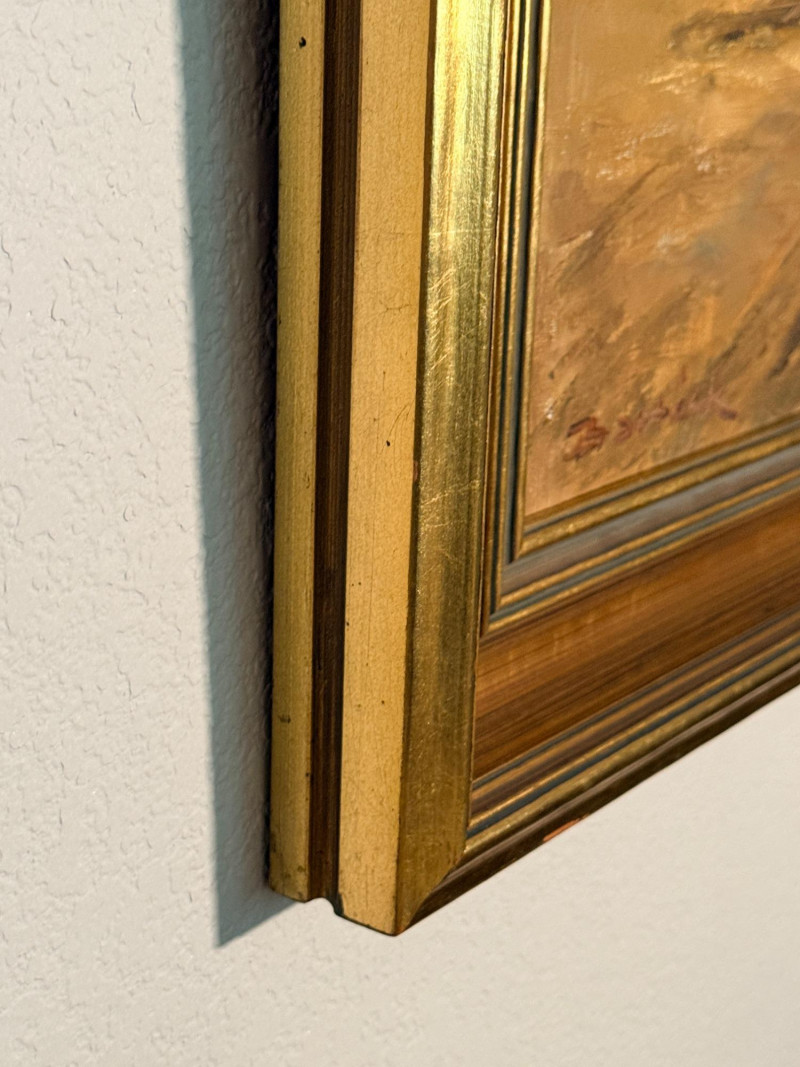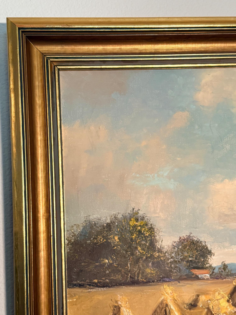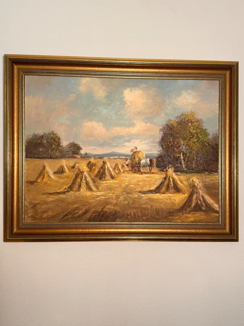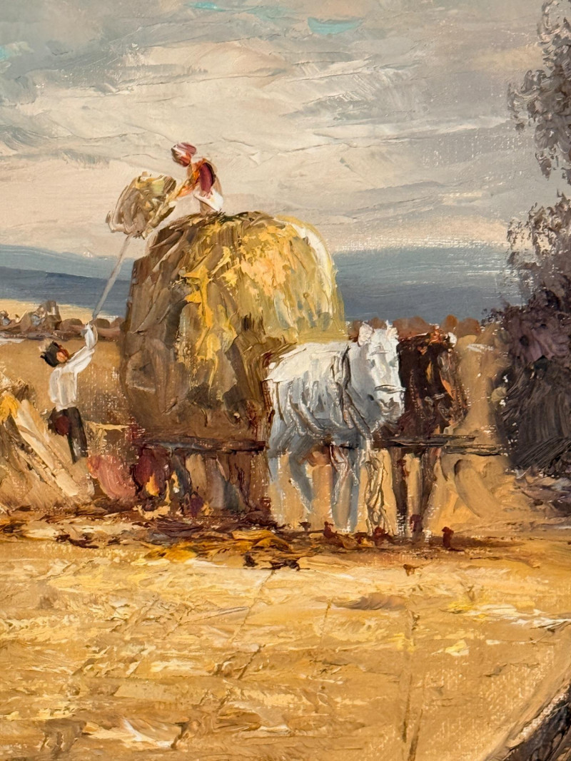 This oil painting depicts a traditional harvest scene with a golden field of wheat sheaves and laborers with a horse-drawn wagon in the background. Harvest - An original oil on canvas painting with heavy texture, surrounded by a gold and black wood frame. 36.5”x29”
